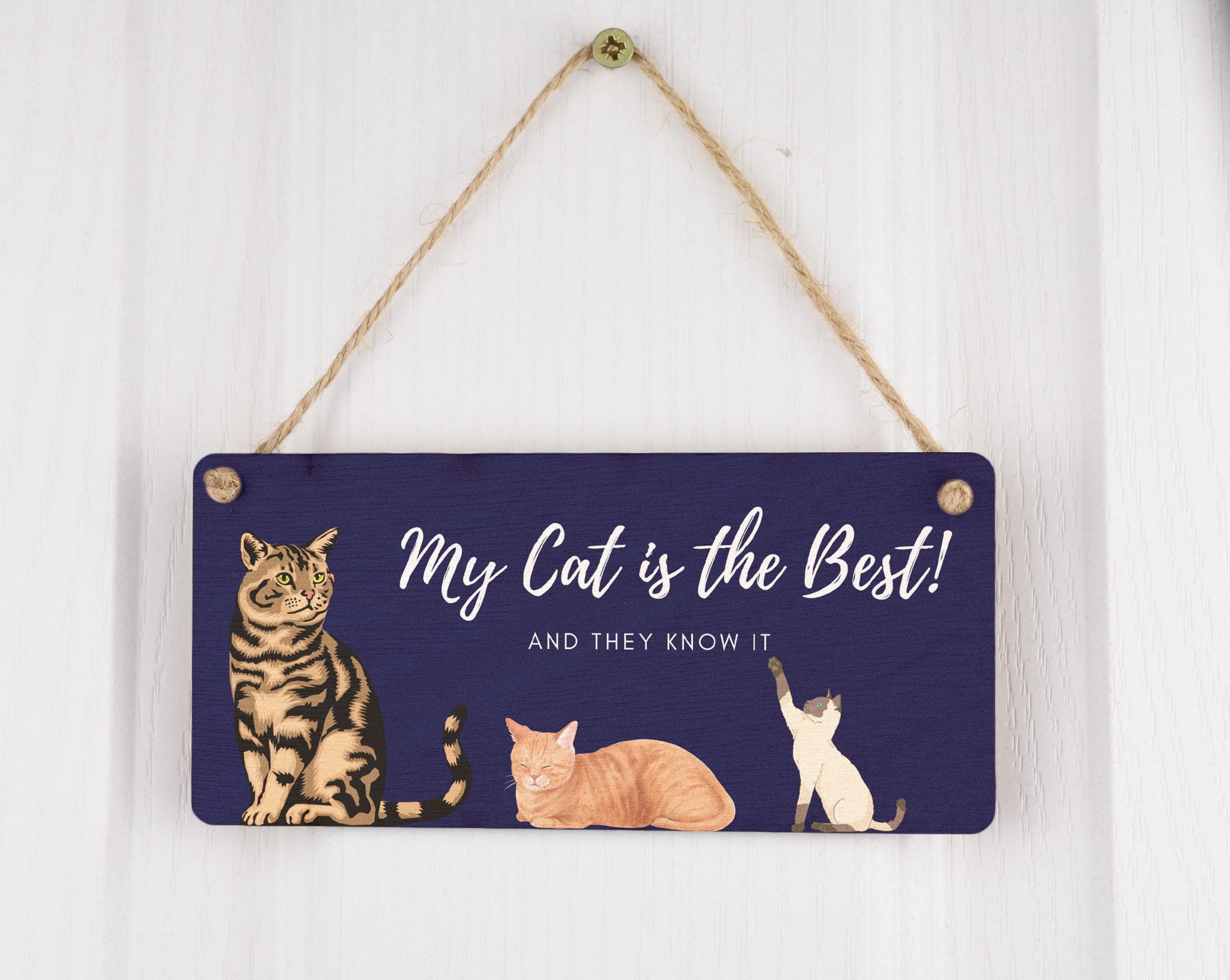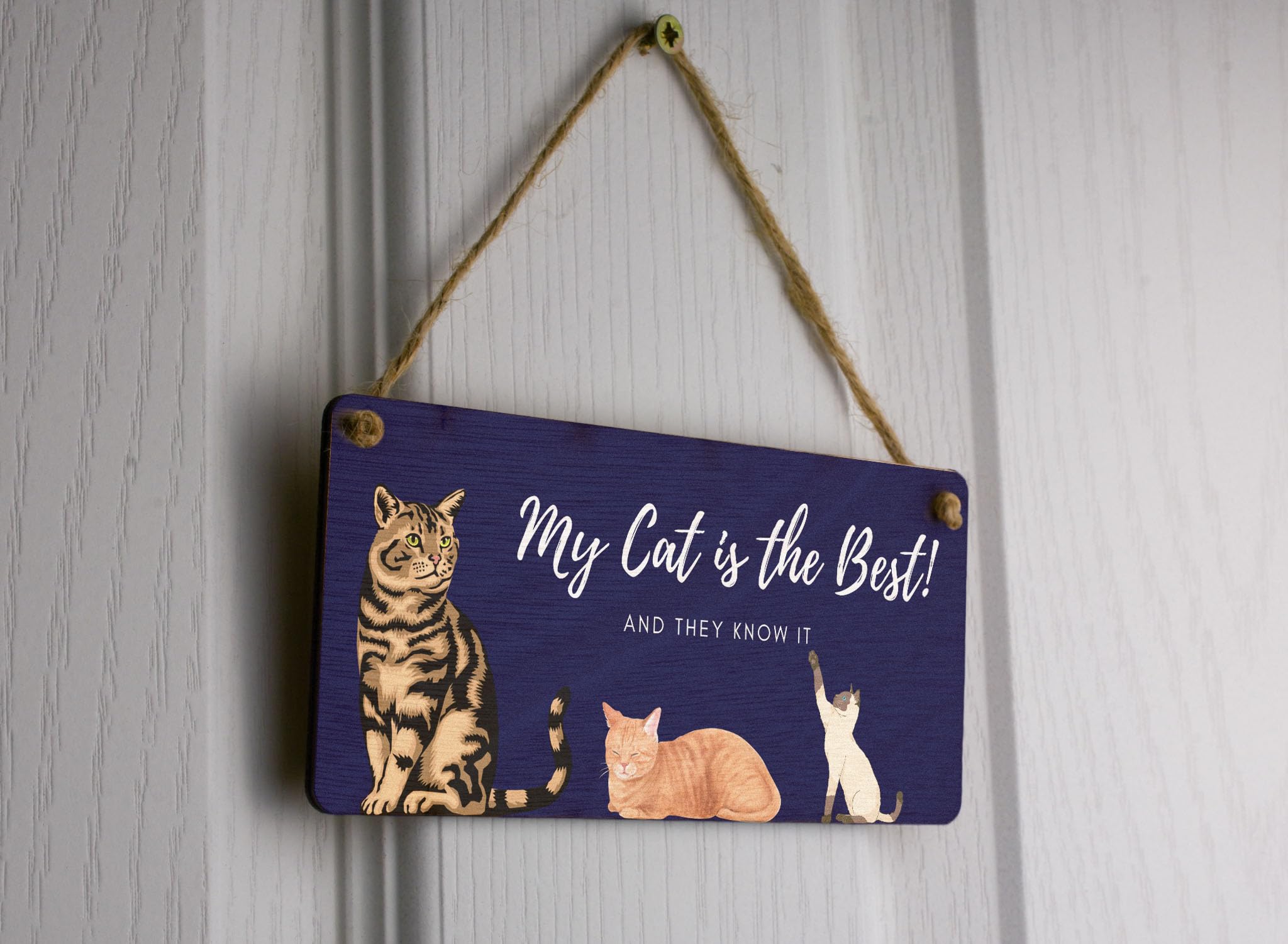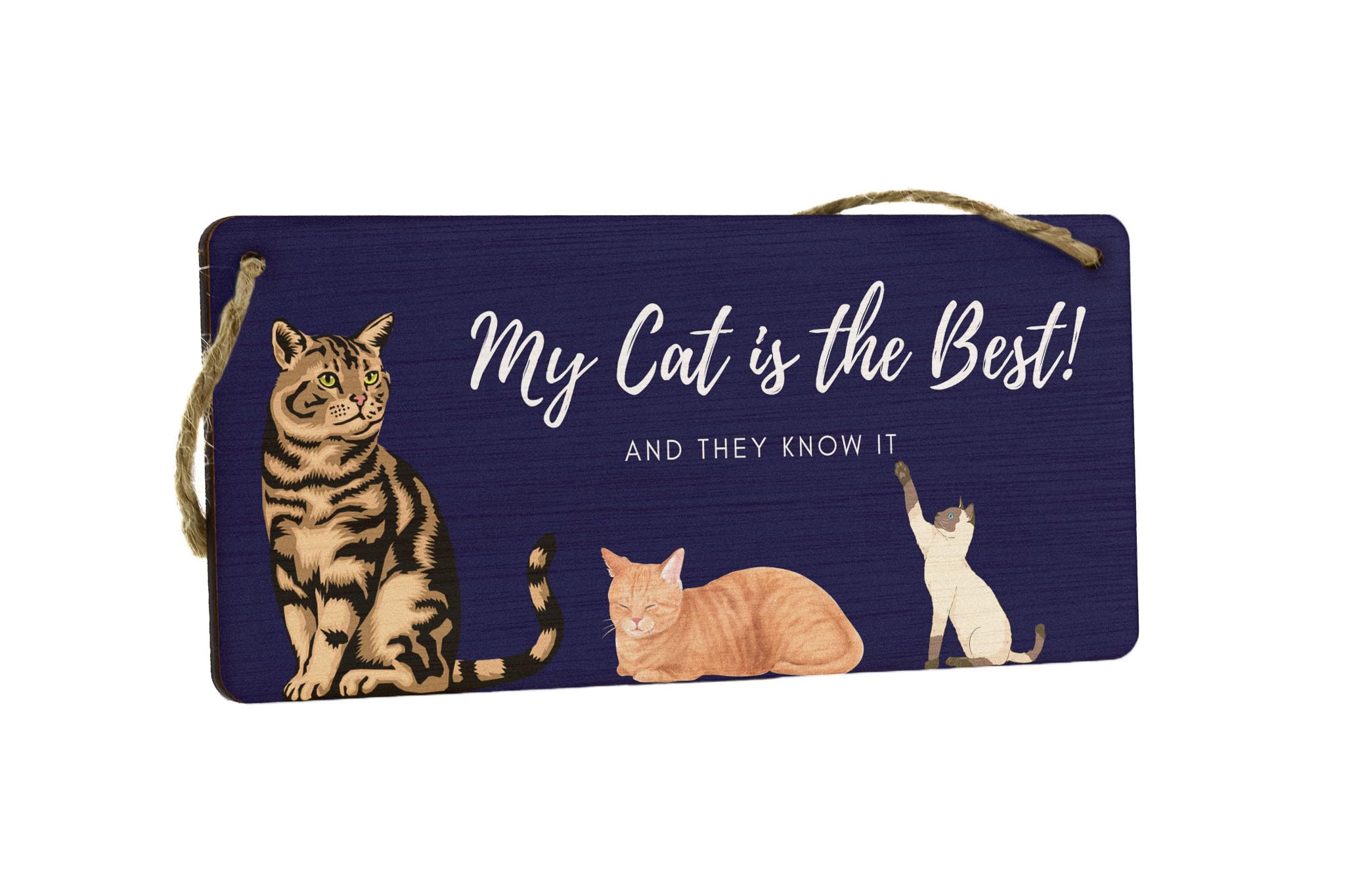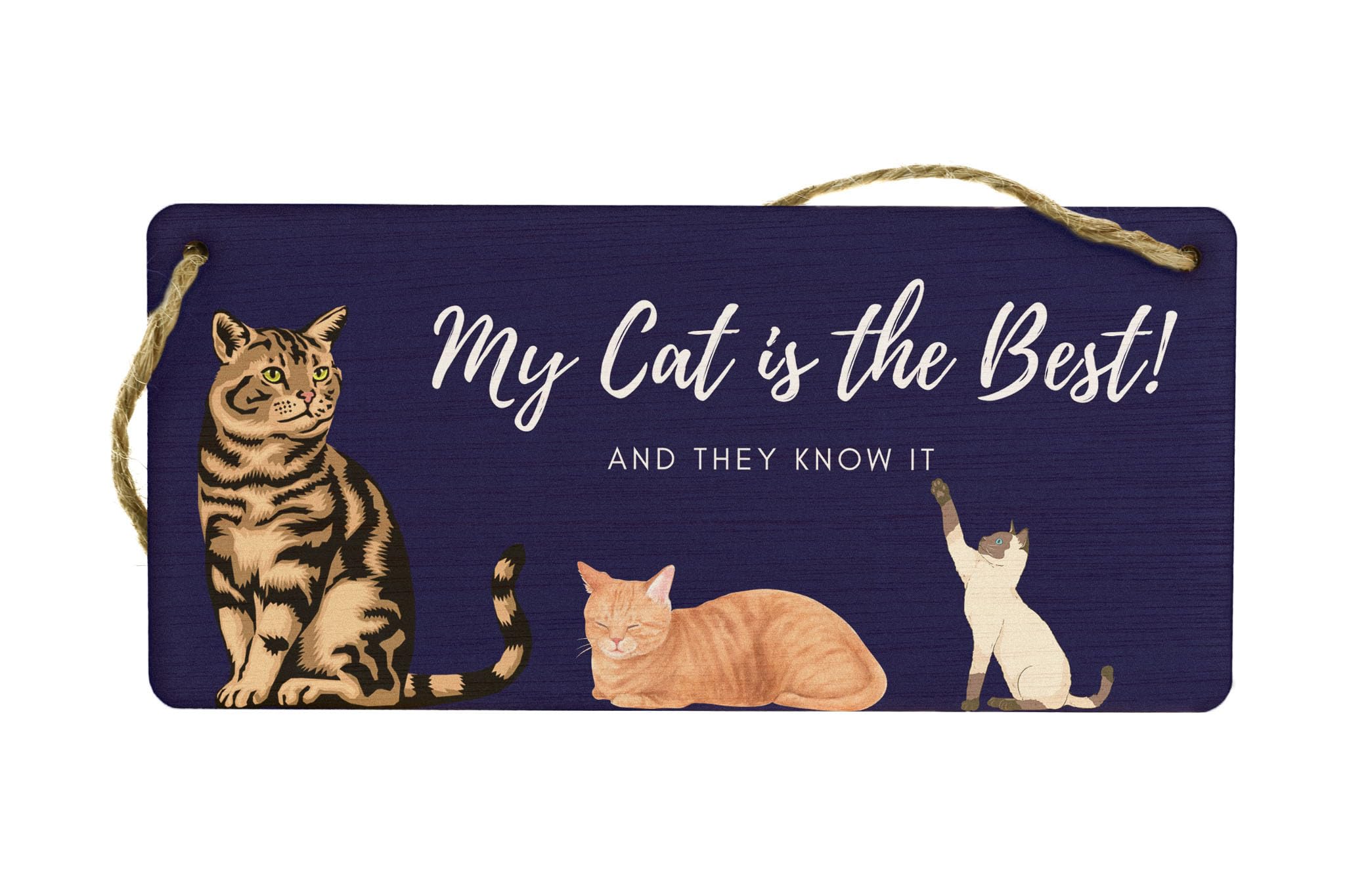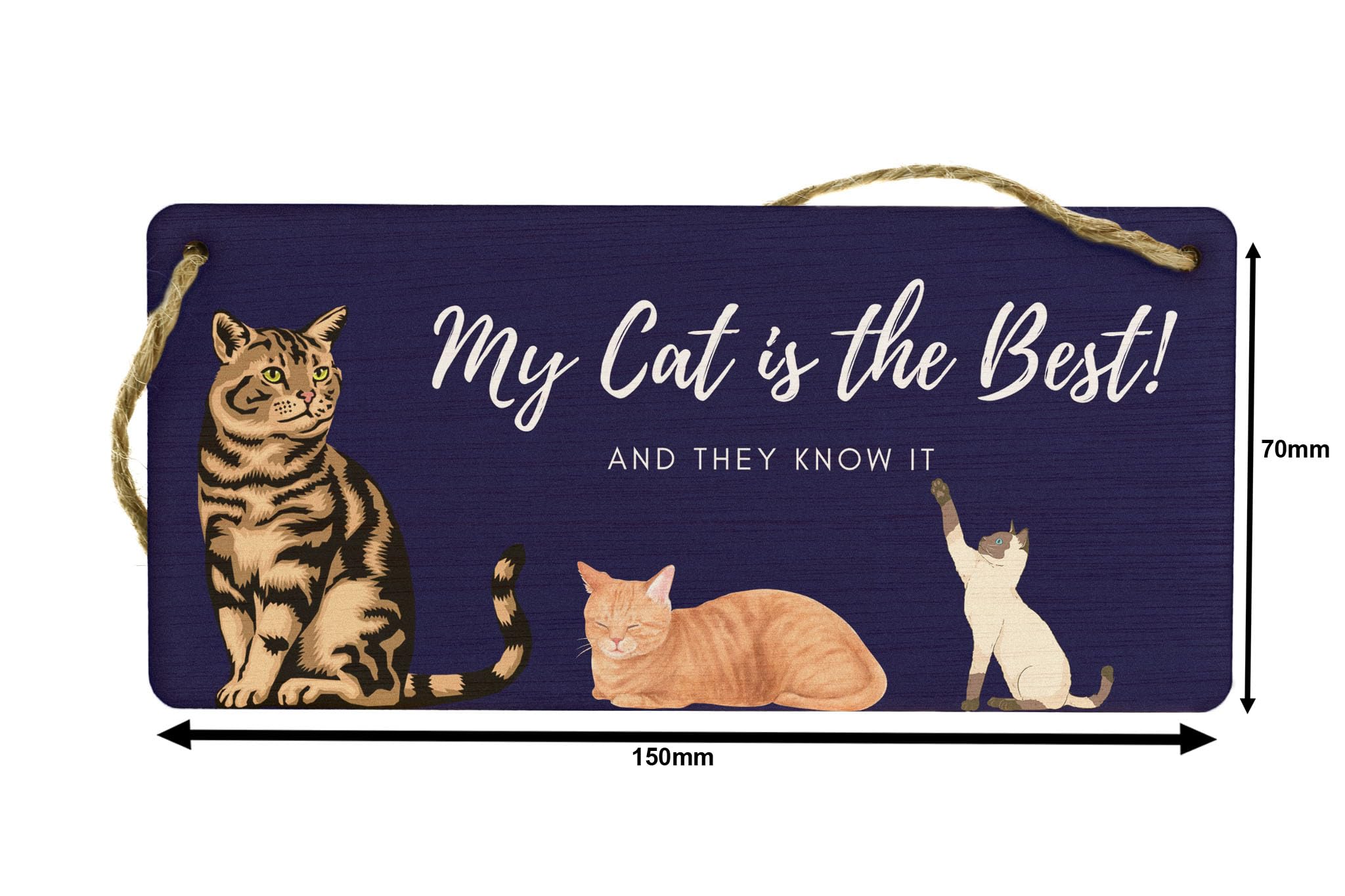 Add a touch of feline charm to your home decor with this delightful novelty hanging plywood cat sign. Perfect for cat owners and lovers, this sign is a great gift idea for family and friends. The sign features a full colour design with adorable images of cats on a dark blue background, creating a eye-catching display. The white writing boldly reads 'My Cat is the Best and They Know It', showcasing your love for your furry friend. Made from quality plywood, this sign is durable and lightweight, making it easy to hang in any room of your home. Whether you want to spruce up your own living space or surprise a loved one with a unique gift, this cat sign is sure to bring joy and a touch of whimsy to any household.