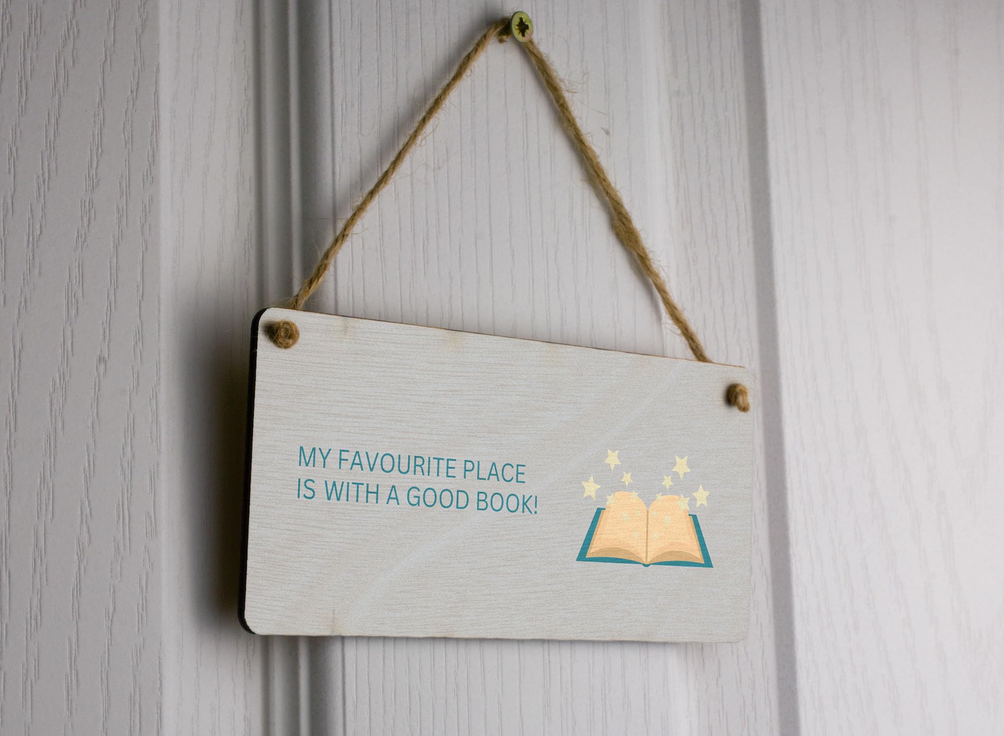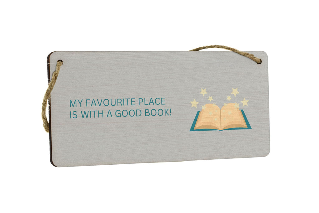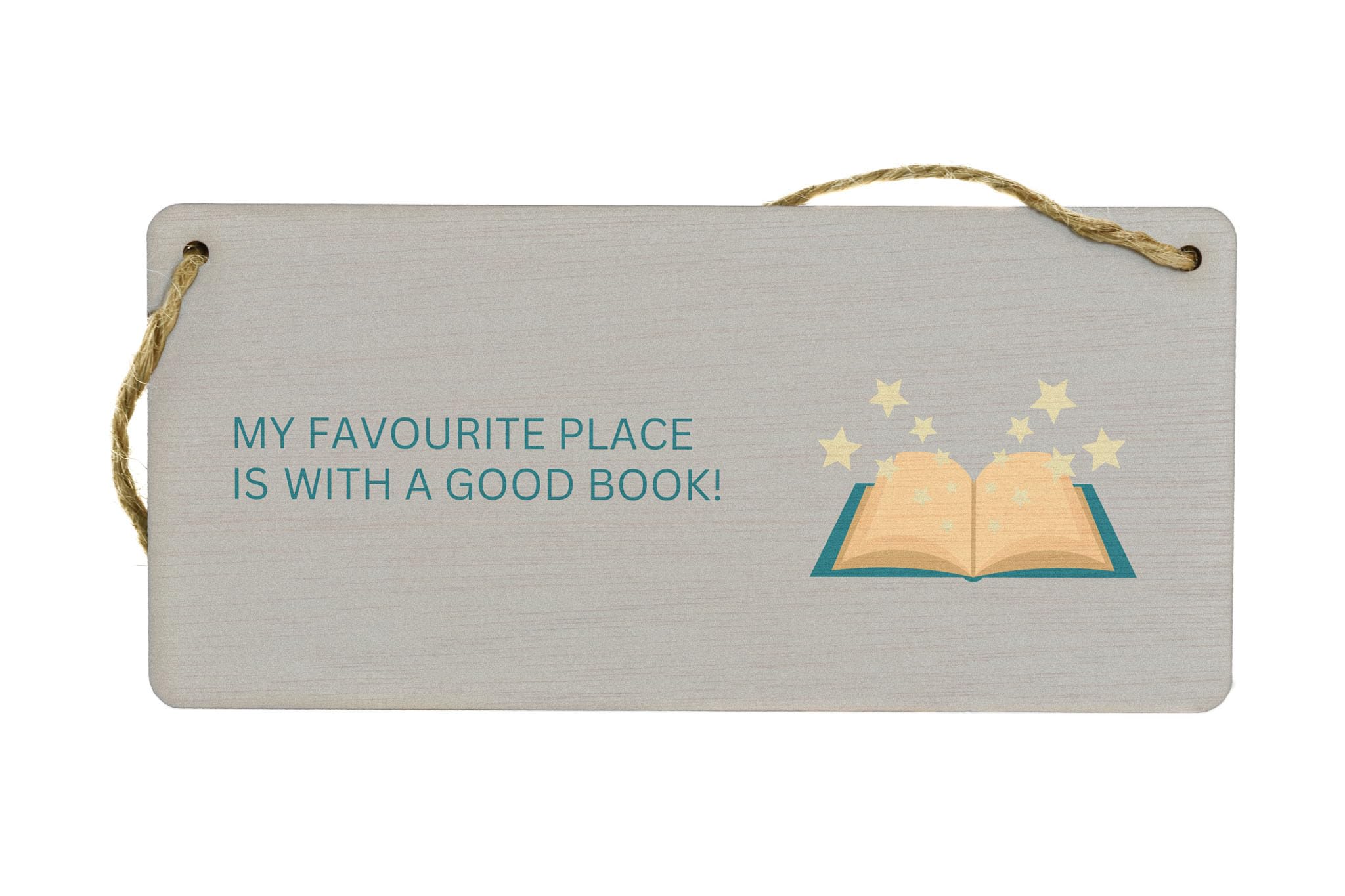 My Favourite Place is with a Good Book - Hanging Plywood Sign - Idea for Family and Friends (smlsgn-ds23-placebook)