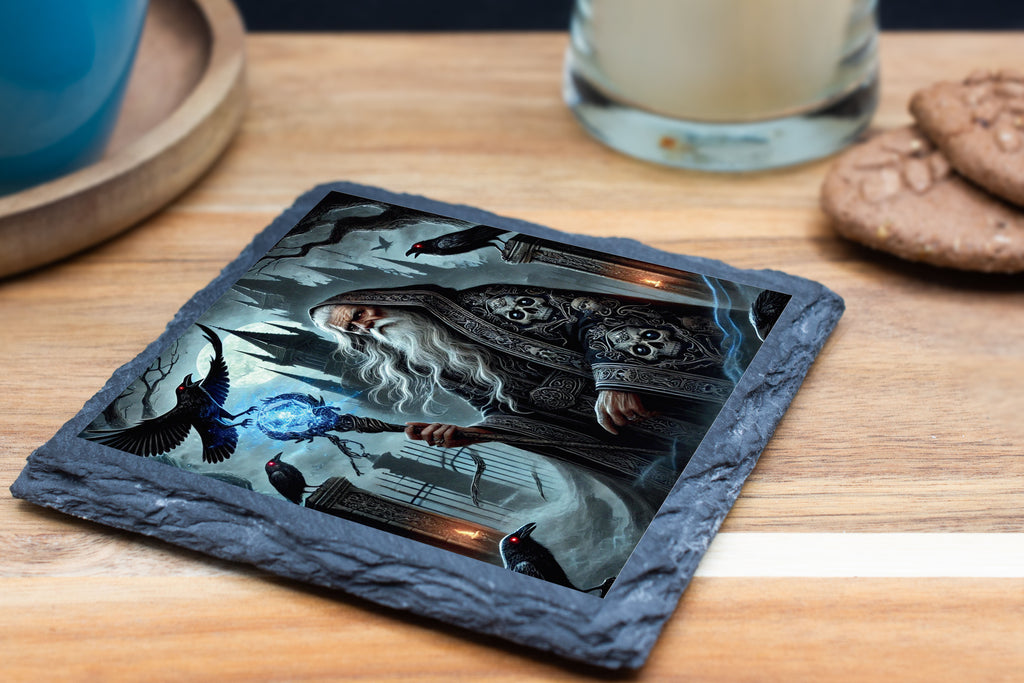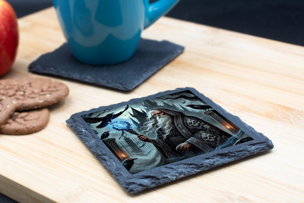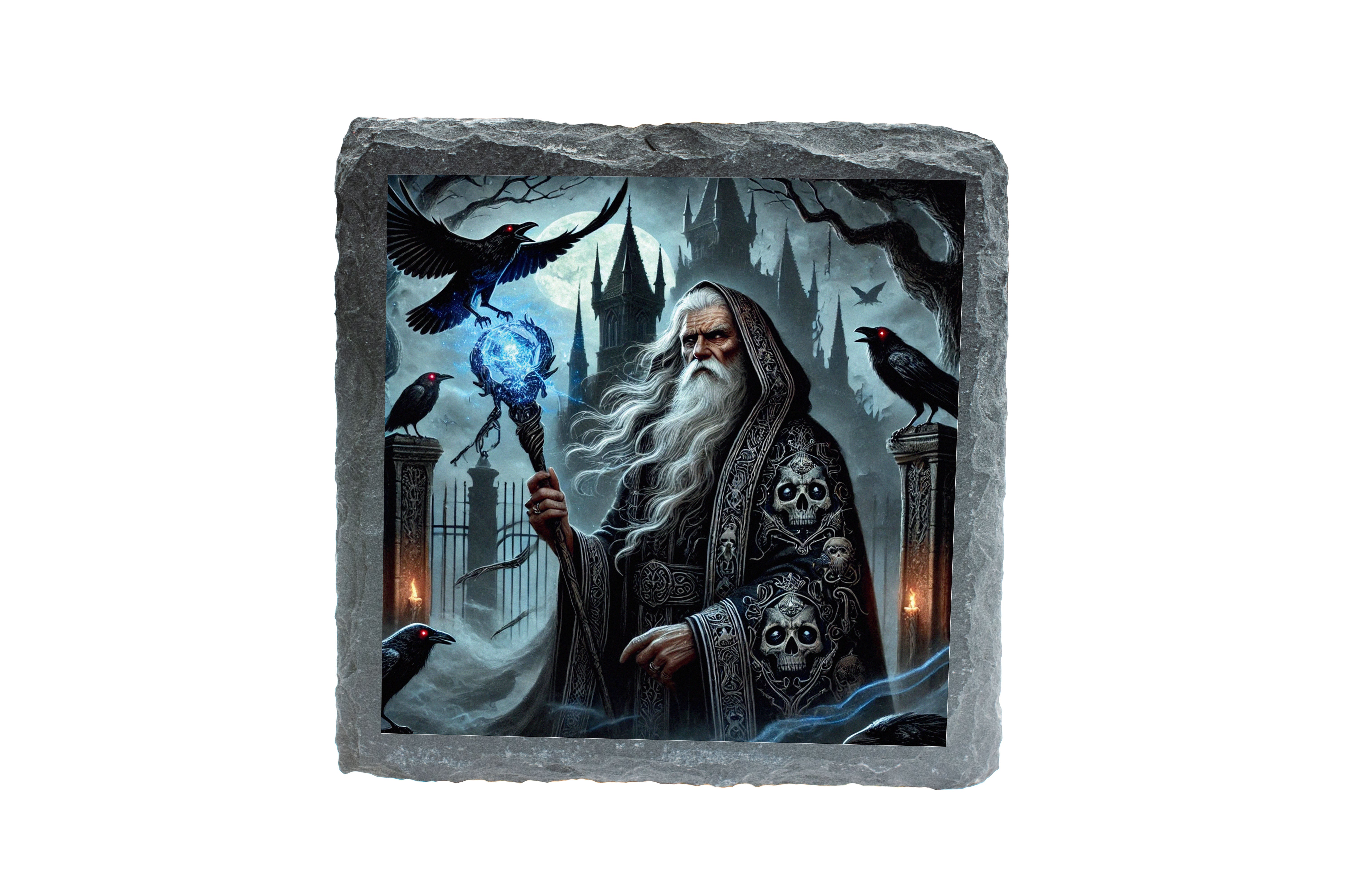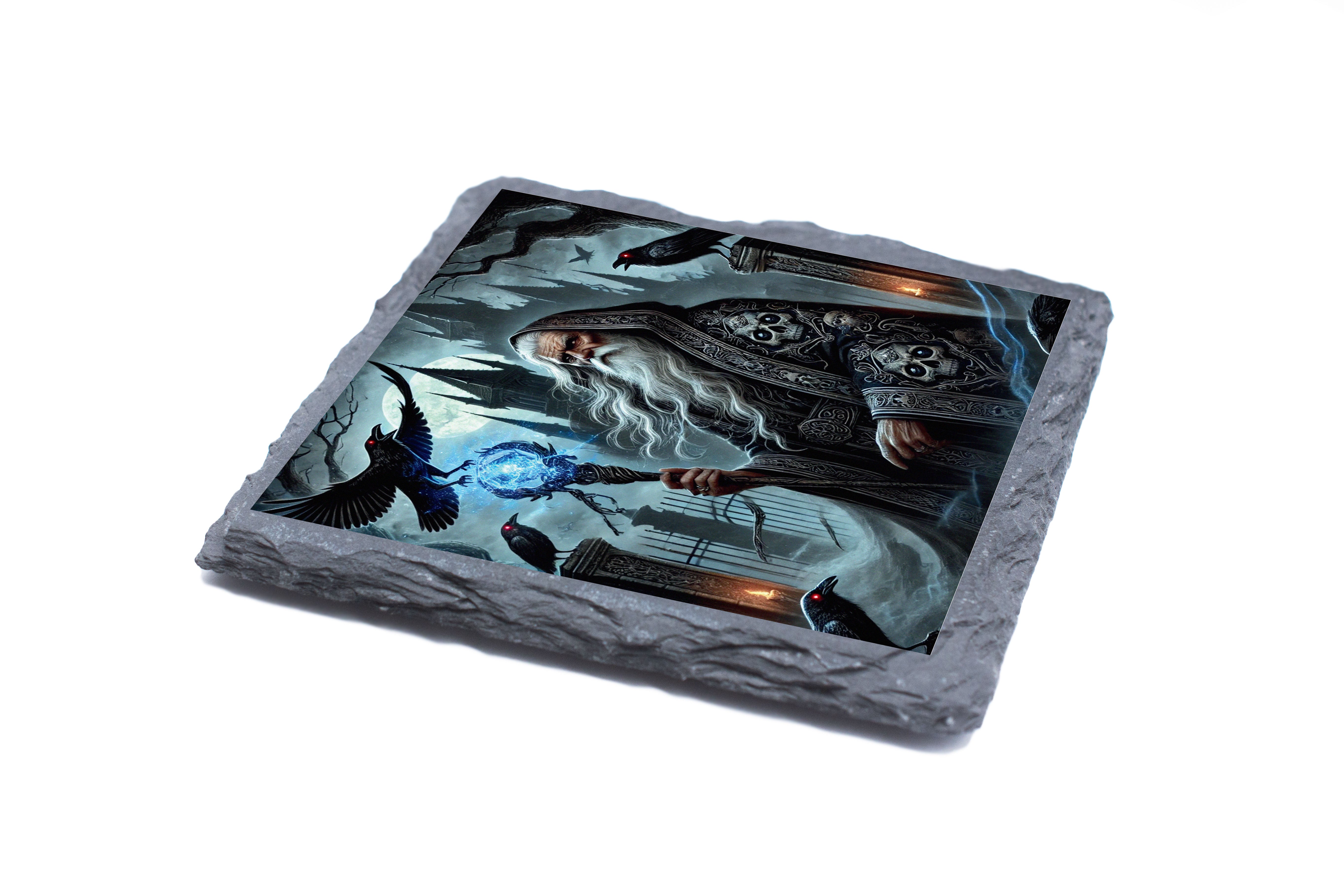 Add a touch of mystical charm to your home with this stunning slate coaster. Featuring a powerful wizard cloaked in intricate skull patterns, surrounded by ravens in a dark, enchanted setting, this coaster is perfect for any gothic or fantasy lover. Made from high-quality slate, it not only protects your surfaces but also brings an air of mystery and elegance to your space. Ideal for use at home, in the office, or as a unique gift, this coaster combines art with functionality.