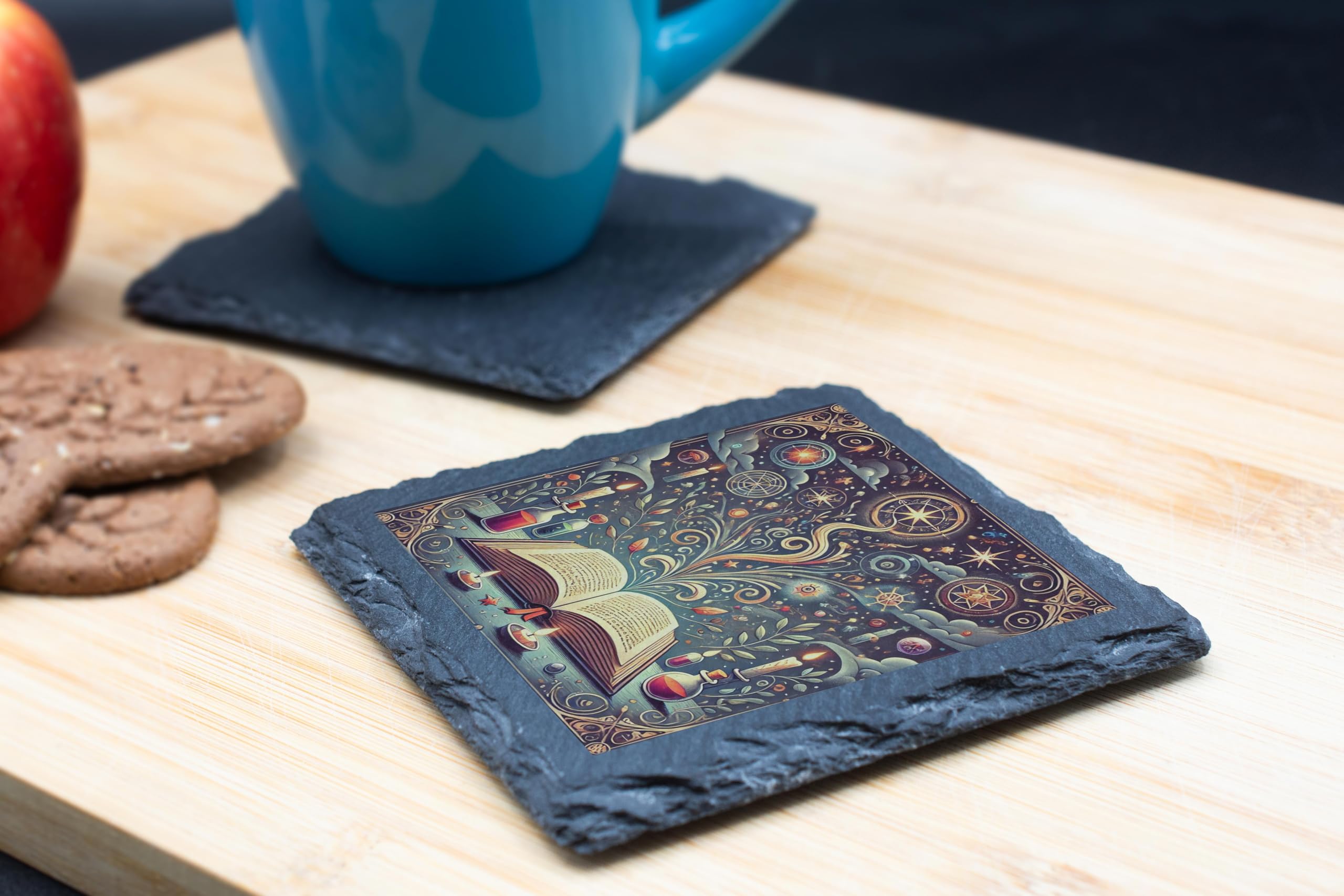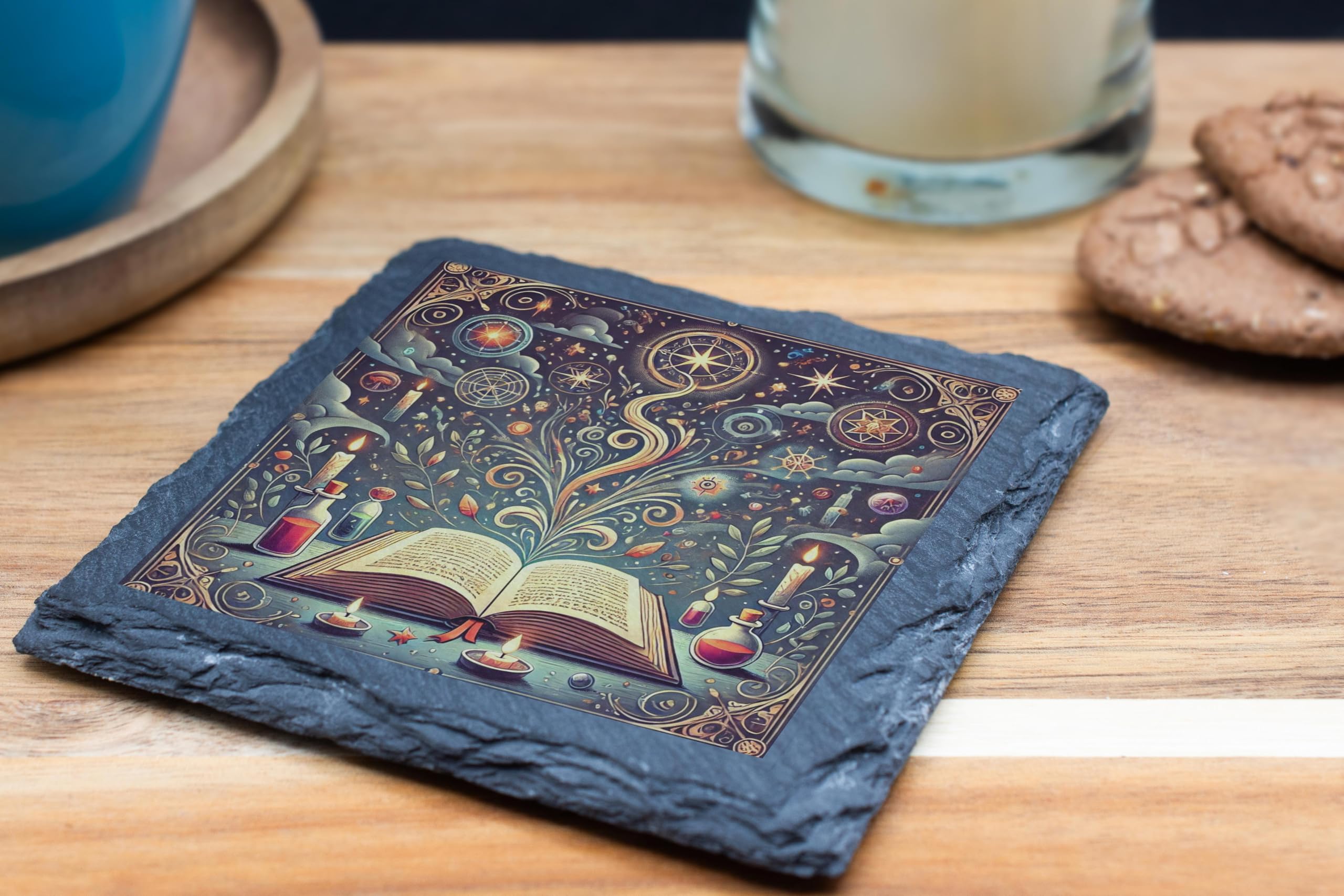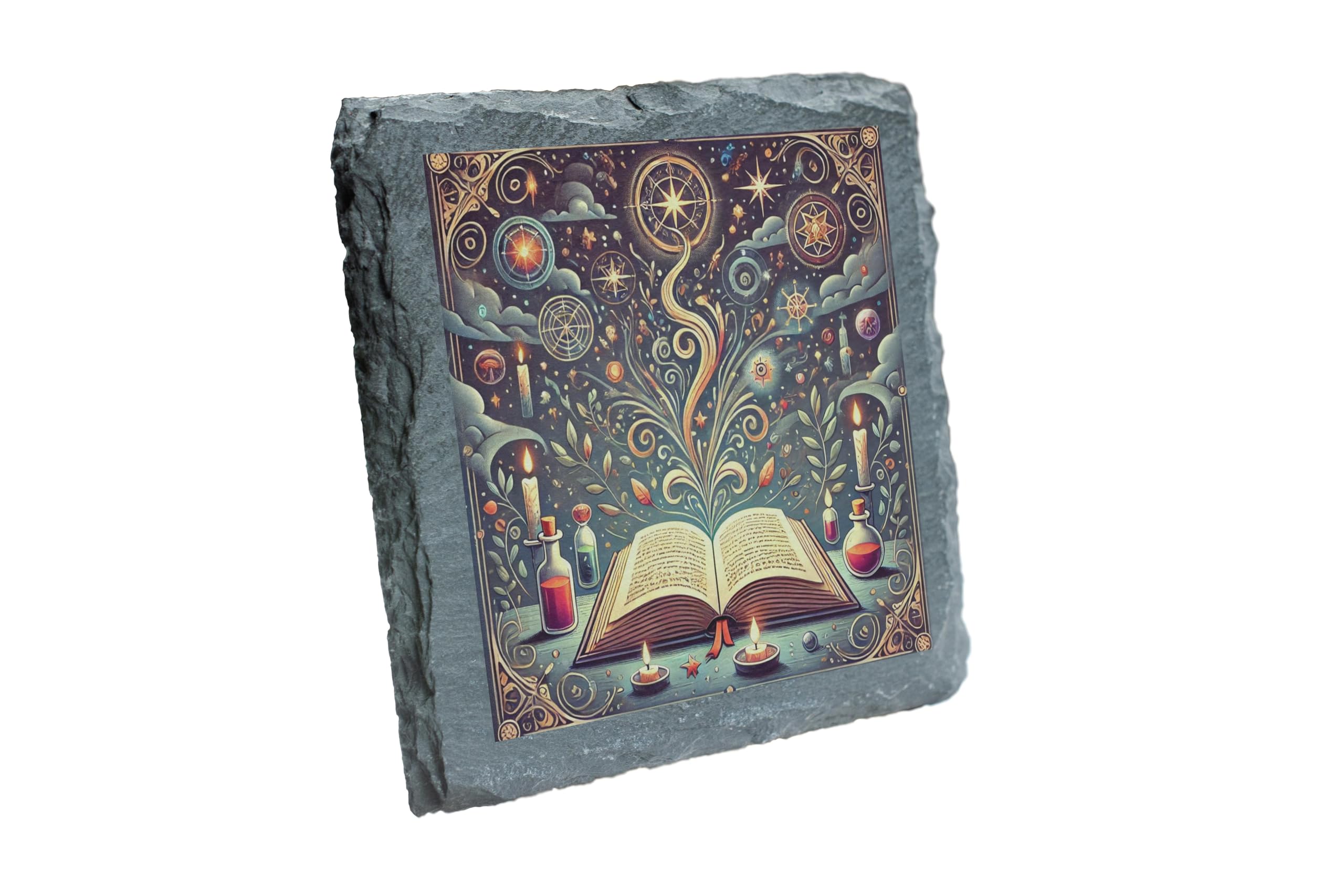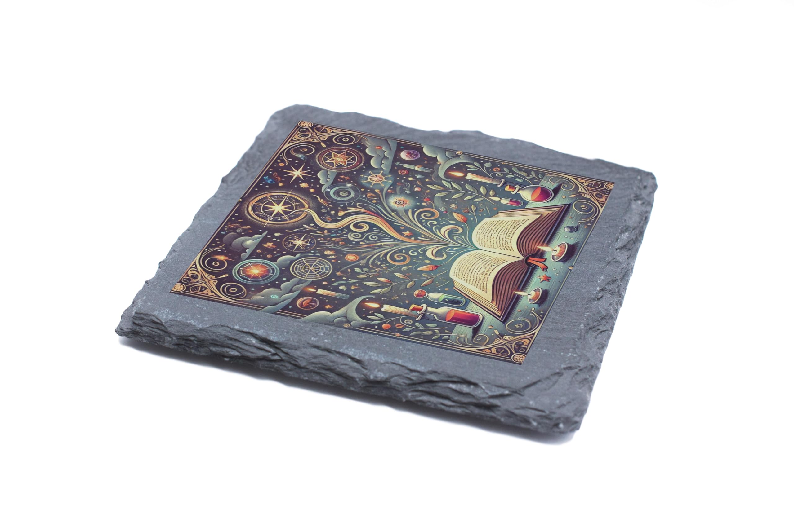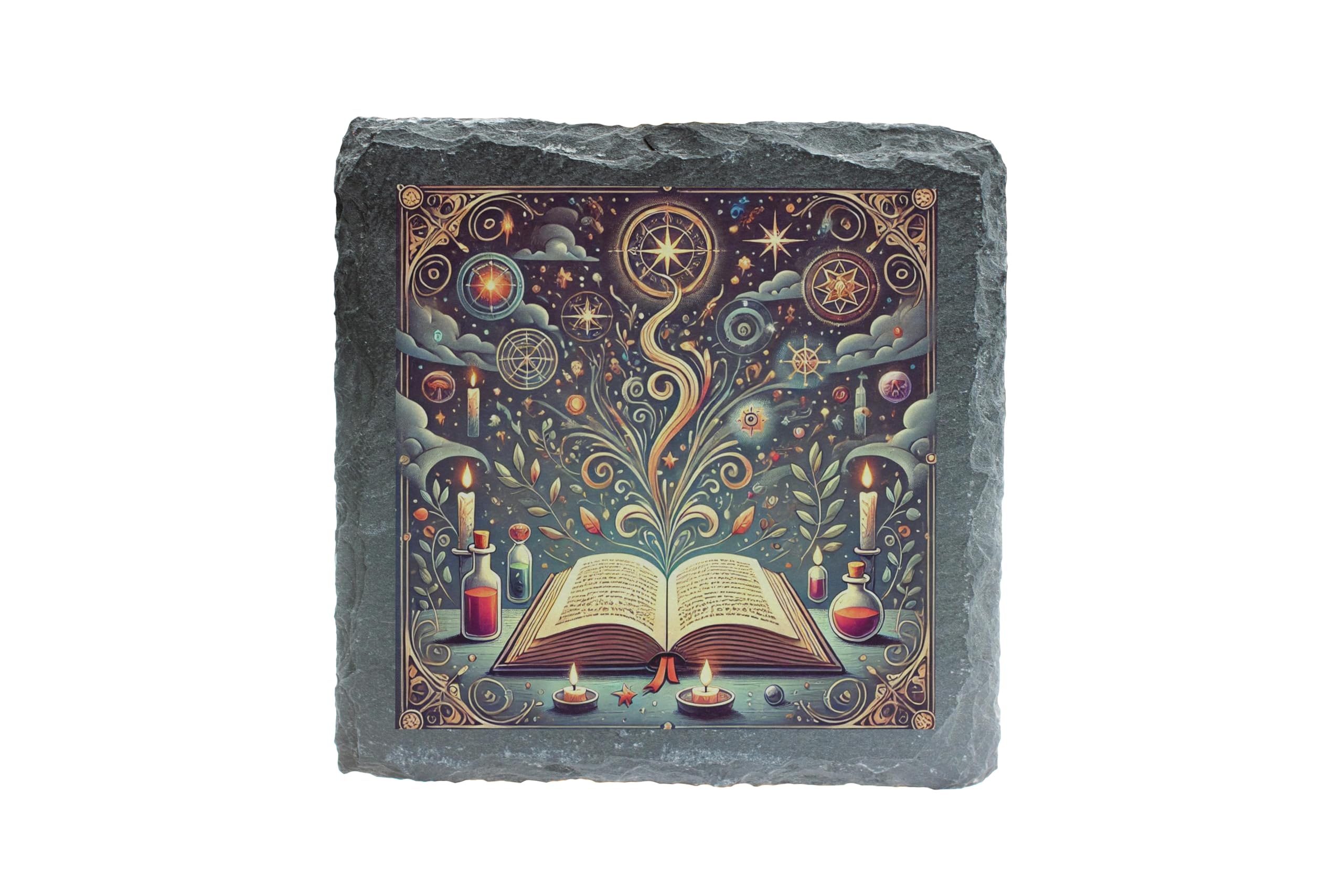 Add a touch of magic to your living space with this Mystical Book and Potions Slate Coaster. Featuring an enchanting design of an open book, surrounded by swirling mystical patterns, celestial symbols, and whimsical potion bottles, this coaster is perfect for fans of fantasy, literature, or magical aesthetics. Crafted from high-quality natural slate, its sturdy construction ensures durability and practicality while exuding a rustic charm. Equipped with anti-slip backing, it?s perfect for protecting your surfaces and adding a whimsical accent to your d?cor. Whether for personal use or as a unique gift, this coaster brings an air of enchantment to any home or office.