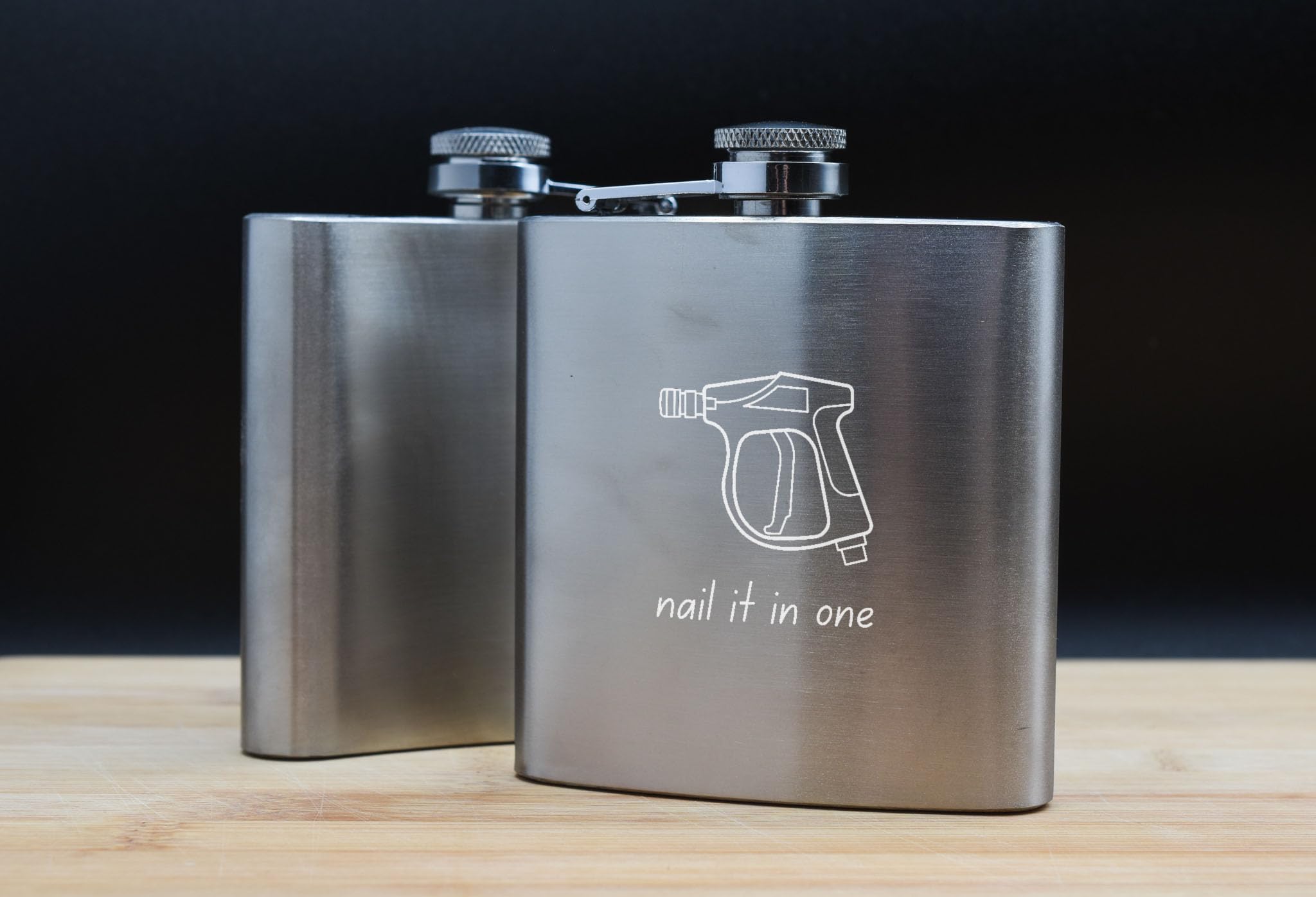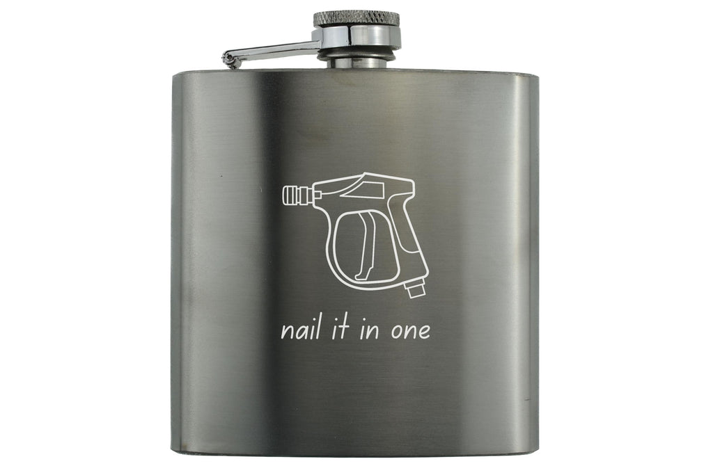 Introducing the Nail It in One Stainless Steel Flask, the perfect accessory for any DIY enthusiast or handyman! This construction-themed flask features a precision design that is sure to impress any tool lover. Made from durable stainless steel, this industrial-style flask is built to last through even the toughest worksite conditions. The full-colour printed design showcases a simple line art style with the humorous quote 'nail it in one'. Whether you're a contractor, repairman, or fixer-upper, this flask is a must-have for any builder or carpenter. Add a touch of fun and style to your next project with the Nail It in One Stainless Steel Flask!