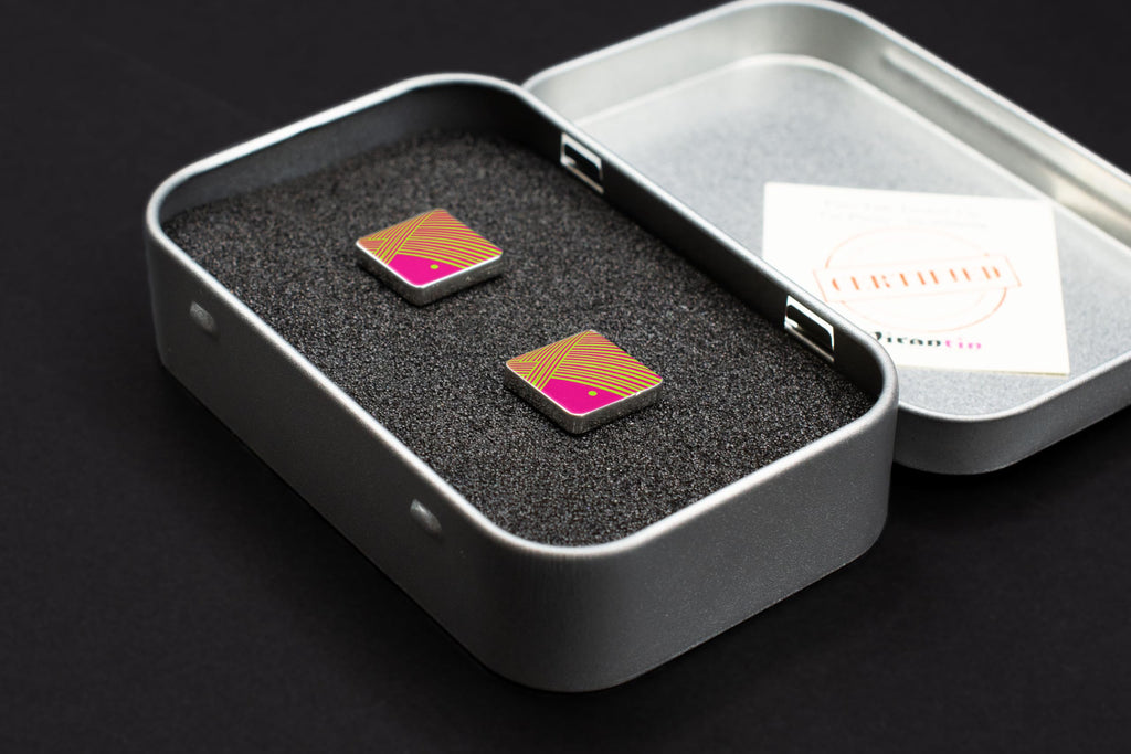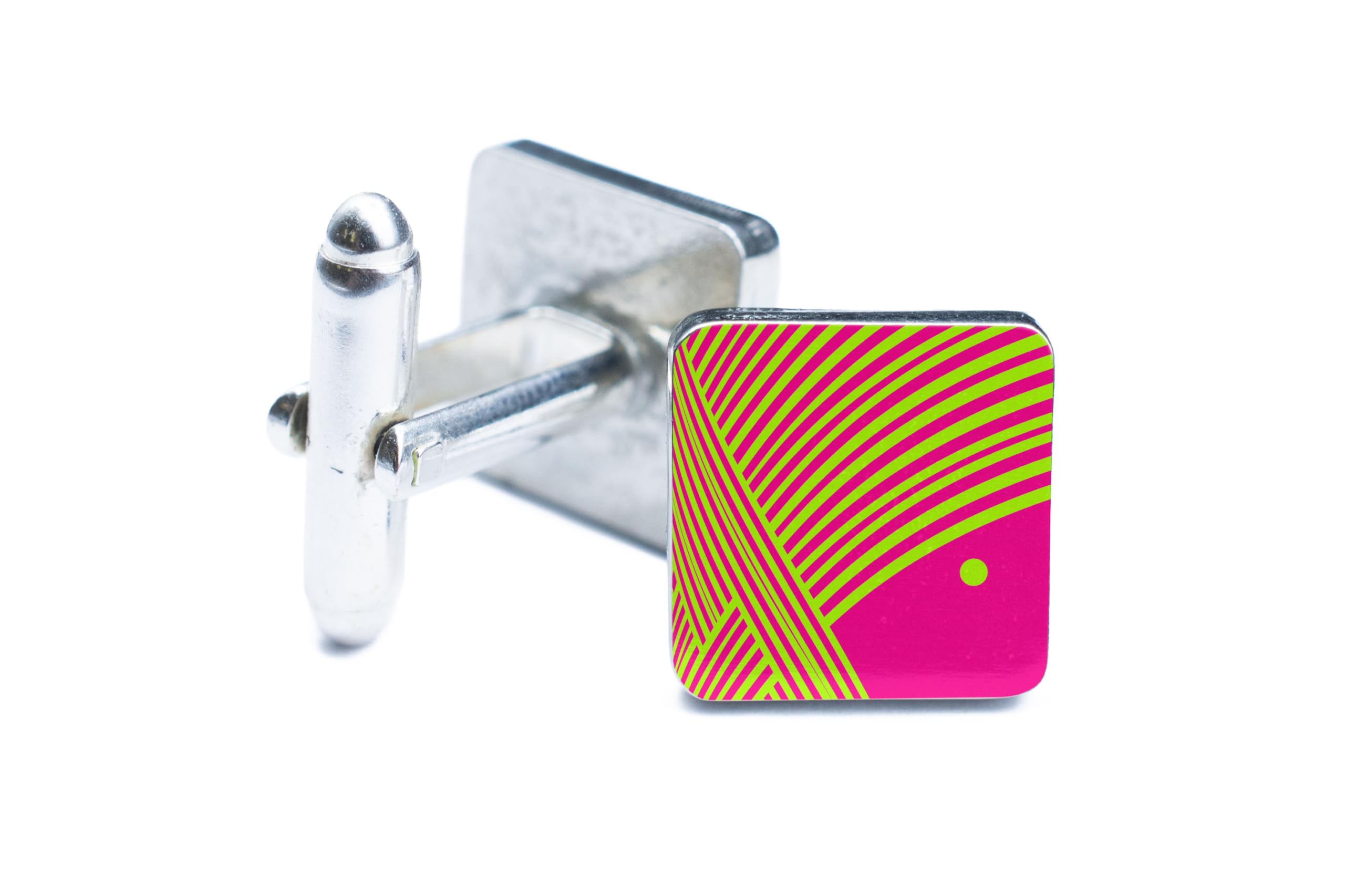 Introducing our Neon Geometric Design UV Printed Cufflinks, the perfect accessory to add a pop of vibrant colour to your formal attire. These handcrafted tin accessories feature a modern and artistic neon pink striped pattern, making them a unique fashion statement for any occasion. The abstract design cufflinks are UV printed in full colour, showcasing a bright geometric pattern that is sure to stand out. Made from quality tin and pewter, these square cufflinks are a contemporary twist on traditional men's accessories. Spice up your outfit with these eye-catching cufflinks and make a bold statement with your style.