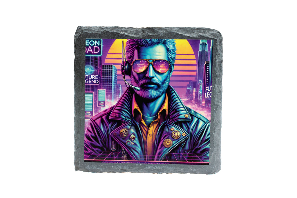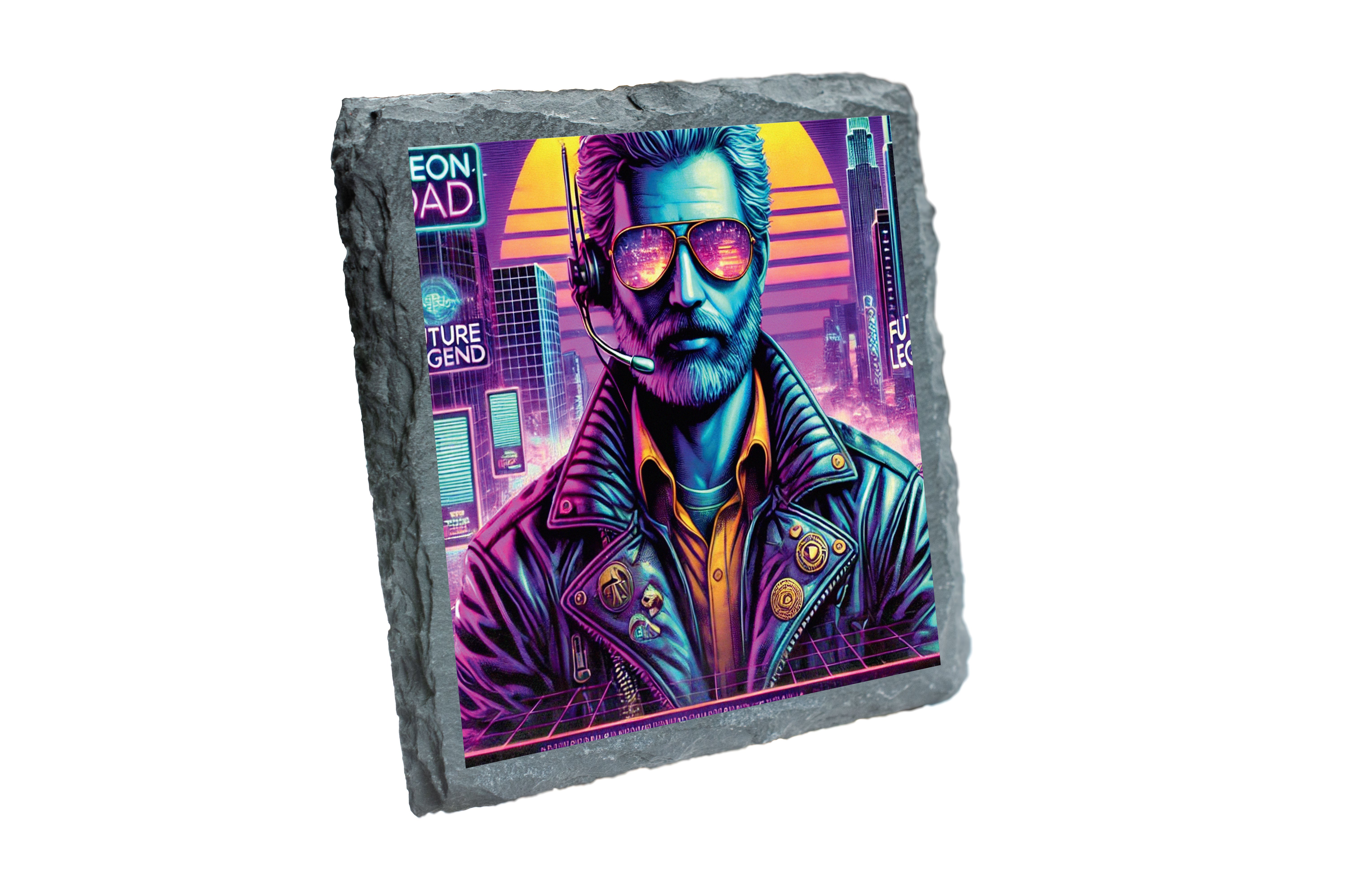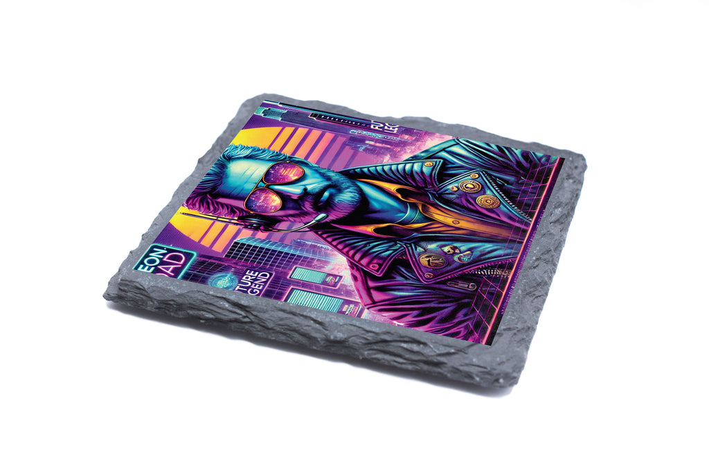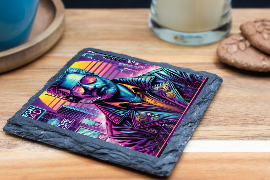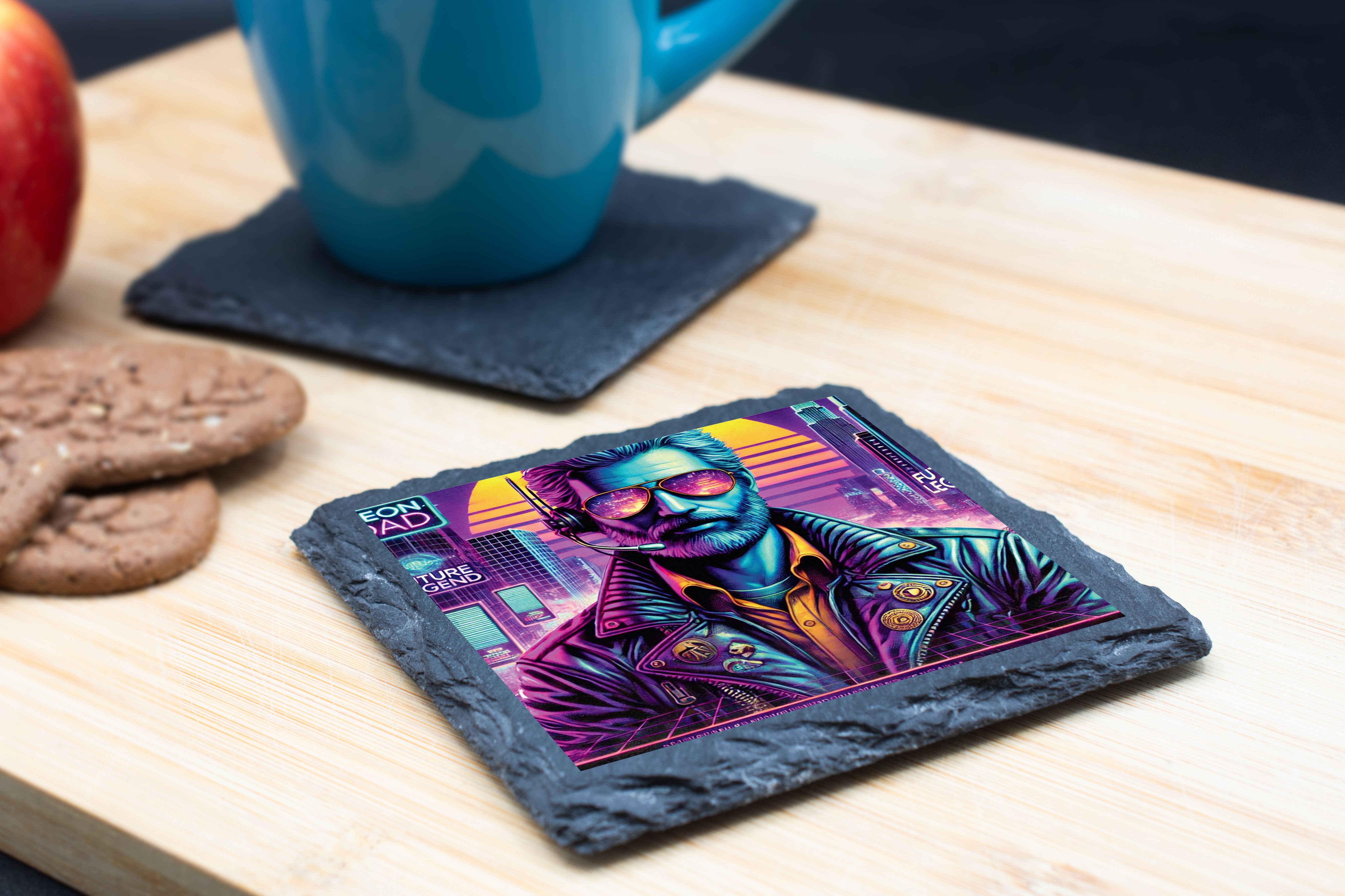 This vibrant coaster features a bold, retro-inspired design with a man in a leather jacket set against a futuristic cityscape. The high-quality print on durable slate gives it a unique and stylish look, perfect for adding a touch of personality to your home or office. Ideal for protecting your surfaces while showcasing a modern, artistic flair. A great gift for lovers of vintage aesthetics and futuristic vibes.