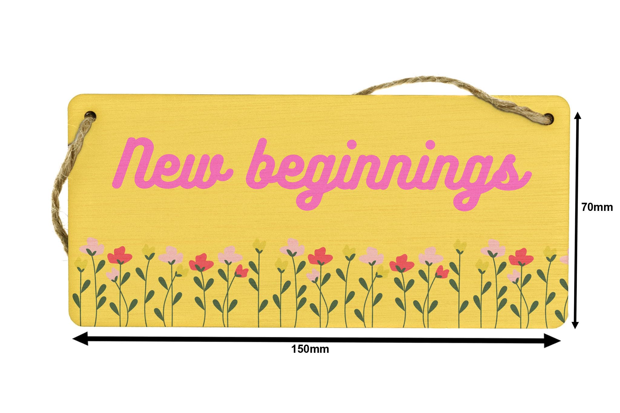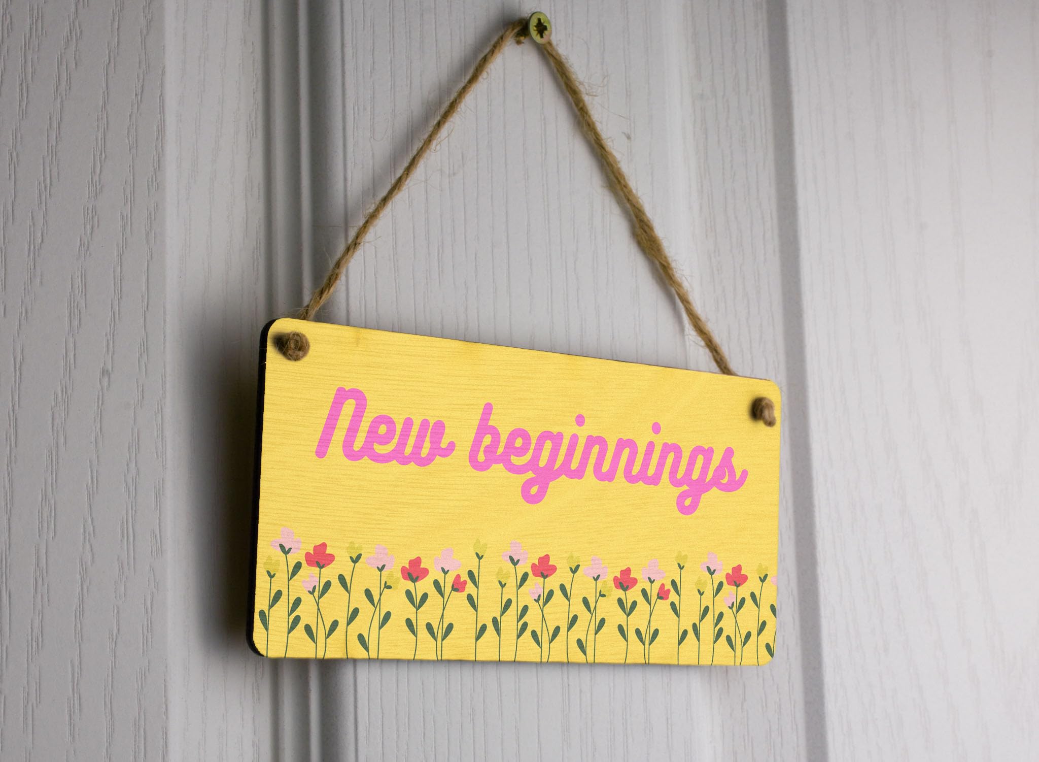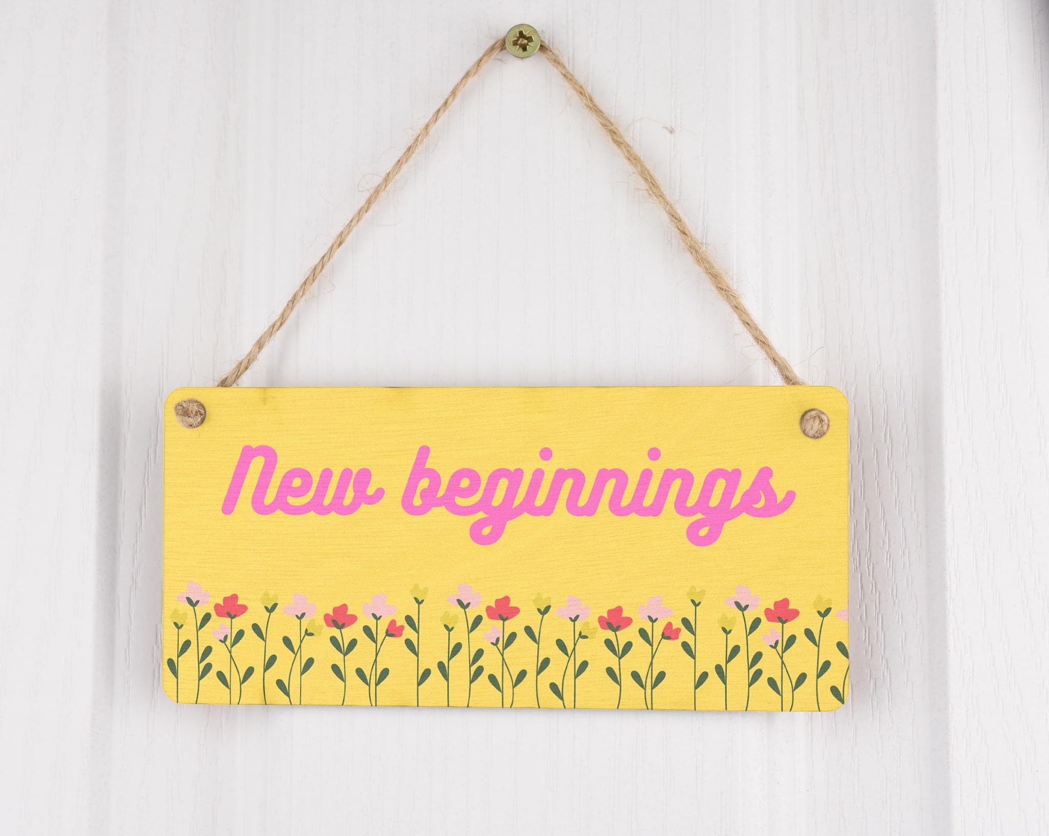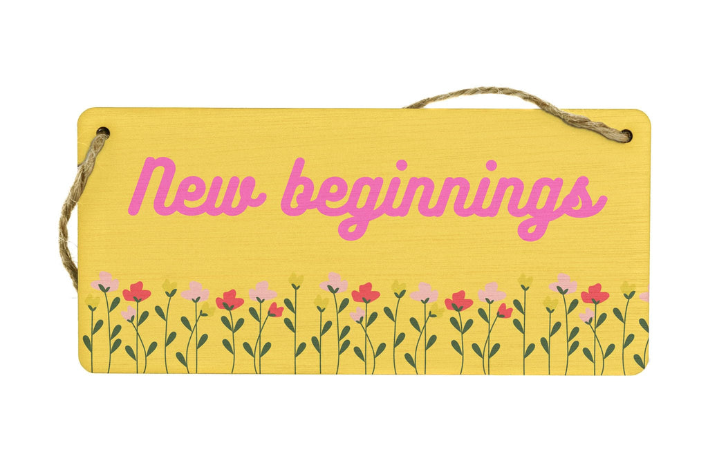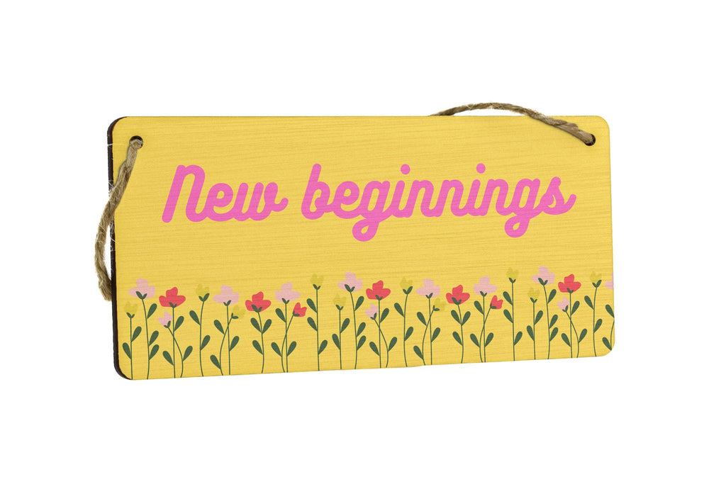 Introducing our New Beginnings - Positive Home Sign, the perfect addition to your home decor! Made from quality plywood, this hanging room sign is designed to bring positivity and warmth to any space. The vibrant yellow orange background with pink writing and full-color design adds a touch of brightness to your surroundings. The sign features beautiful flower images, symbolizing growth and new beginnings. It reads 'New Beginnings', serving as a constant reminder of the endless possibilities that await you. Whether you're gifting it to your wife, husband, girlfriend, boyfriend, son, daughter, or siblings, this sign is sure to make a thoughtful and meaningful present. Hang it on a wall, door, or in any room that needs a burst of positivity. Embrace the power of positive energy and create an inviting atmosphere in your home with our New Beginnings - Positive Home Sign.