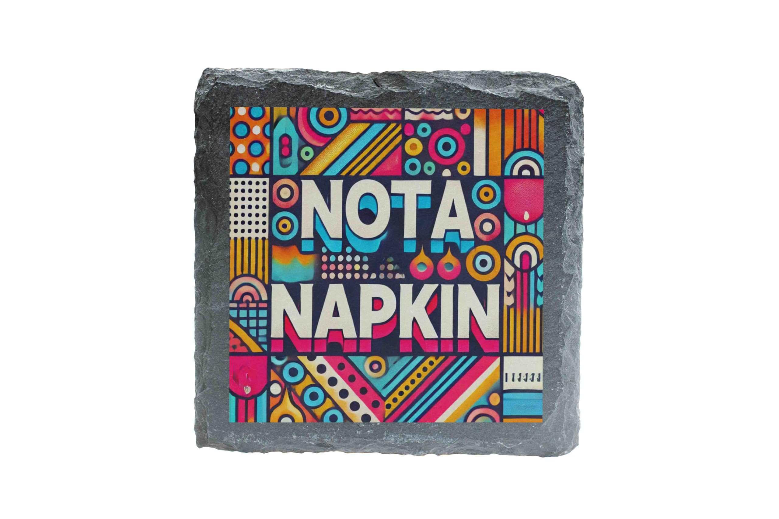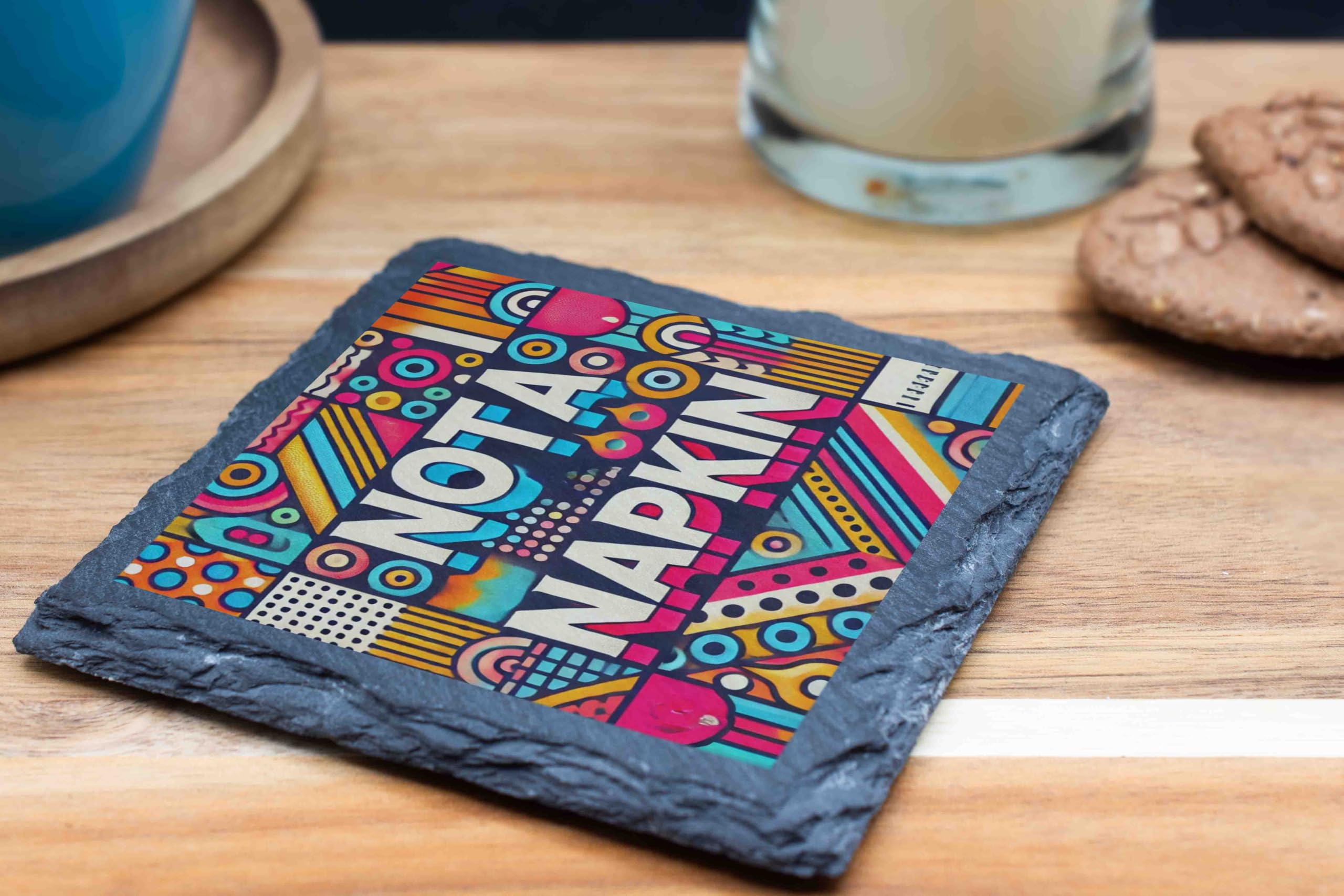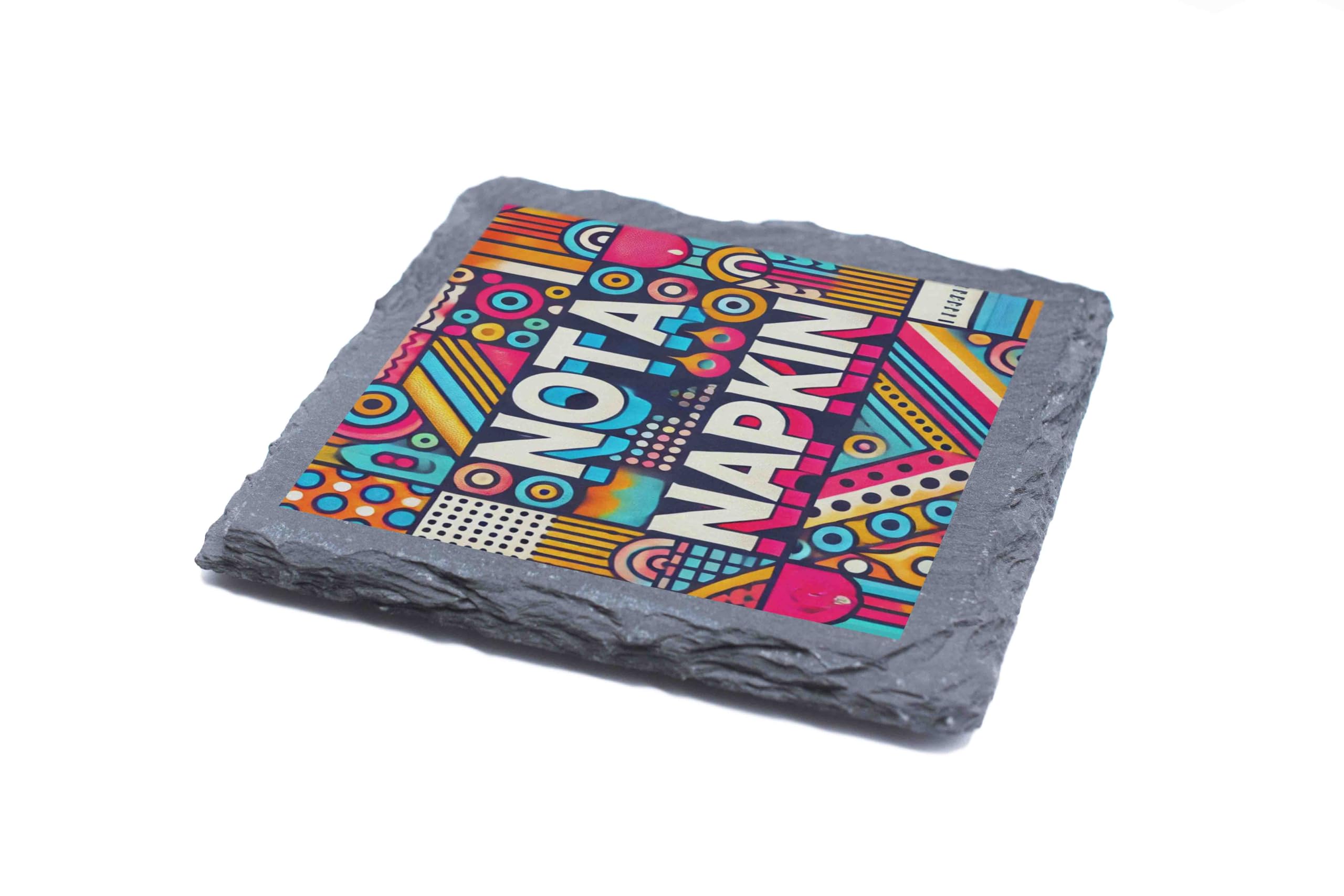 Add bold style to your table with the "Not a Napkin" Slate Coaster. Featuring a vibrant geometric design paired with a playful phrase, this coaster is as functional as it is visually striking. It's the perfect addition to coffee tables, desks, or bars, combining artistic flair with practicality. Crafted from premium natural slate with rugged edges, this coaster protects surfaces from heat, moisture, and scratches while enhancing your d?cor. Whether for your own home or as a thoughtful gift for someone with a taste for bold design, this coaster stands out in any setting. Easy to maintain and built to last, it's the ideal blend of fun and functionality!