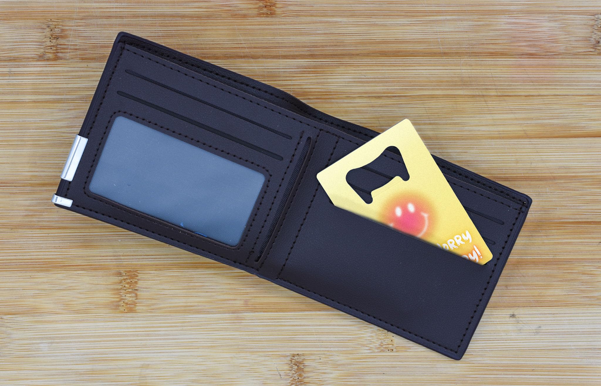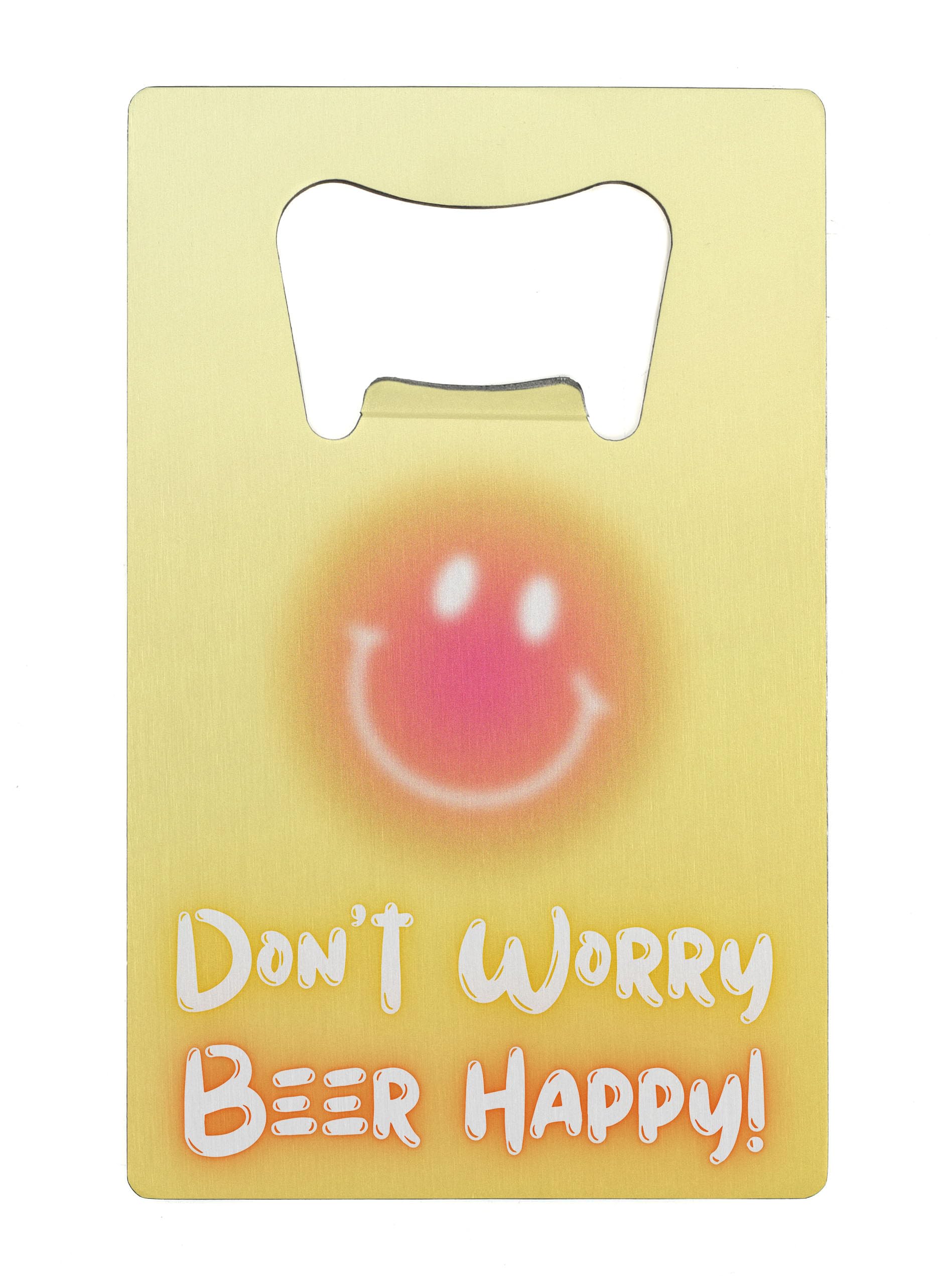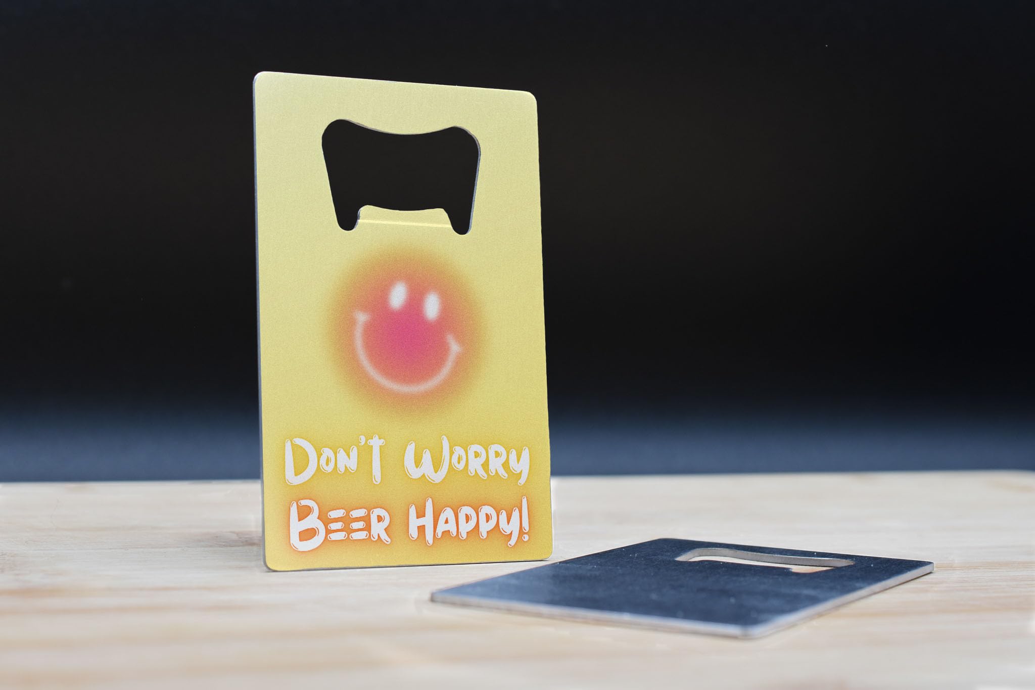 Introducing our Novelty Credit Card Bottle Opener in a vibrant yellow and orange design that reads 'Don't Worry Beer Happy'. This sleek and stylish bottle opener is made from quality brushed stainless steel, making it both durable and strikingly attractive. Measuring at credit card size, this novelty bottle opener easily fits in your wallet, making it convenient to carry around wherever you go. Perfect for beer enthusiasts, this bottle opener is not just a practical tool, but also a fun and unique beer gift idea. Treat yourself or surprise a friend with this novelty gift that is sure to bring a smile to their face whenever they crack open a cold one.