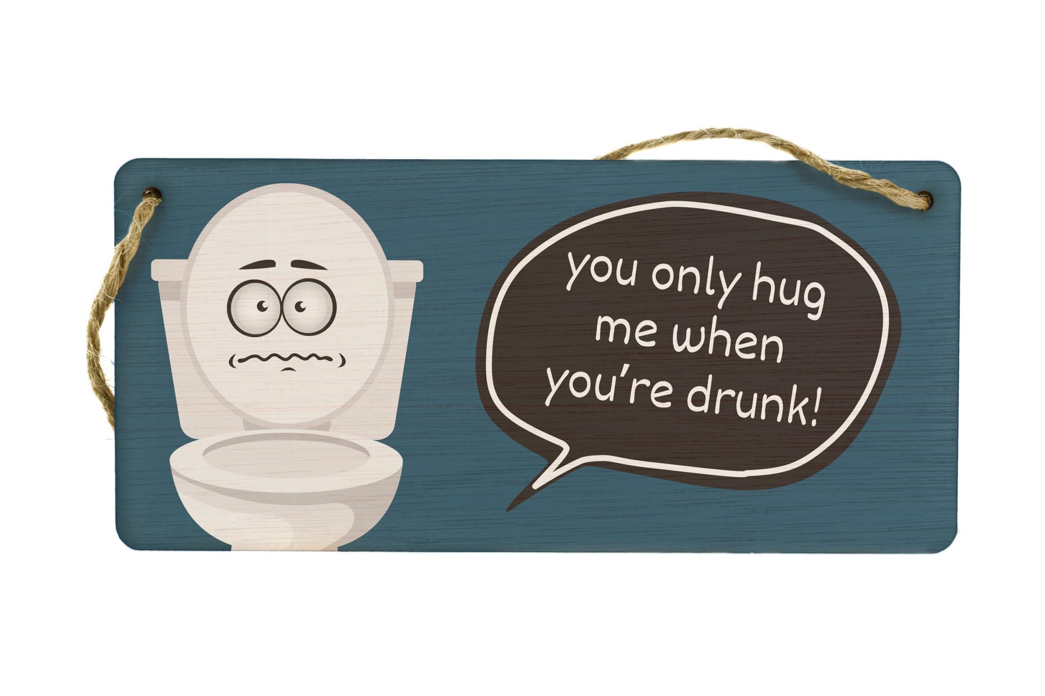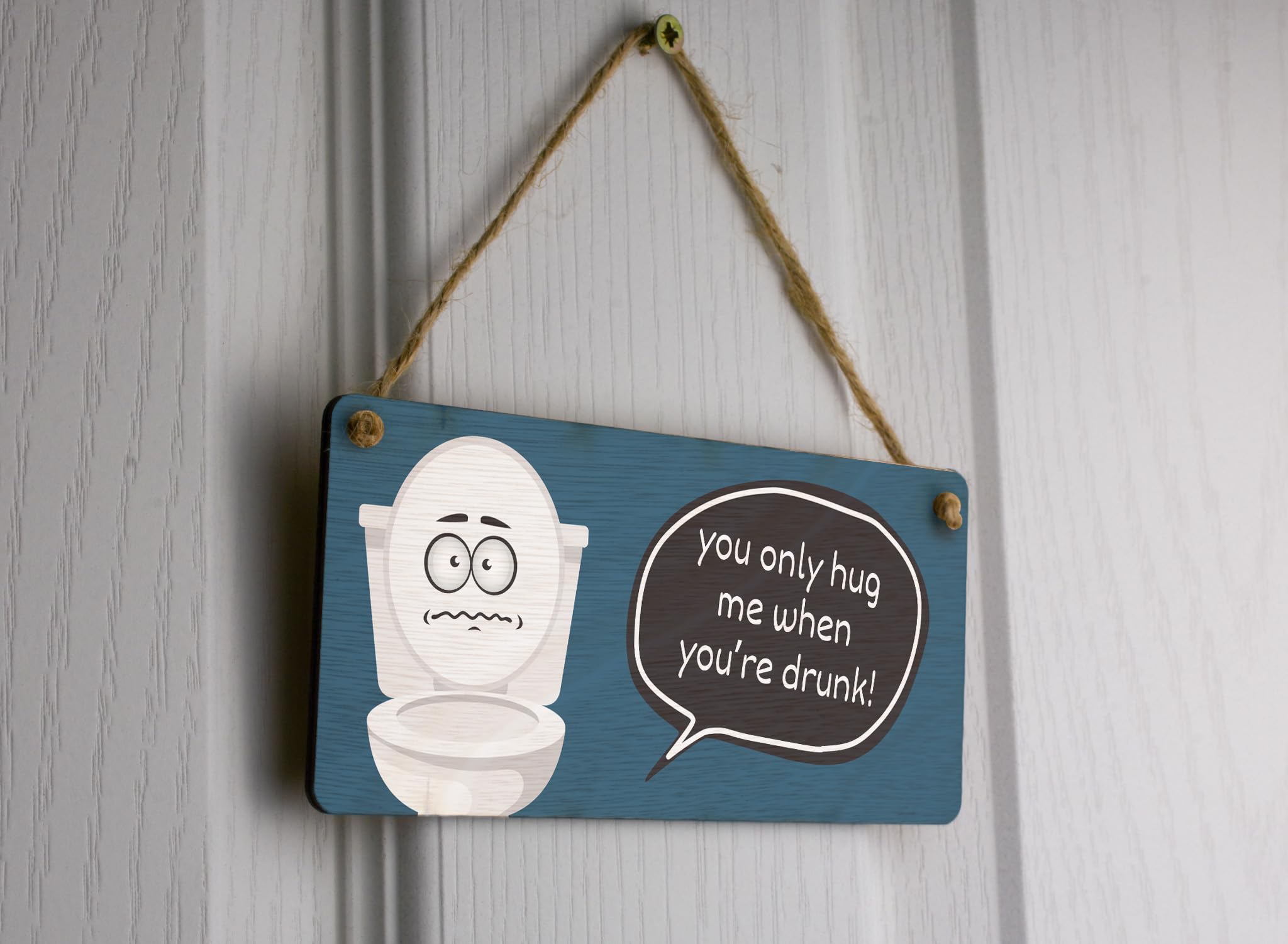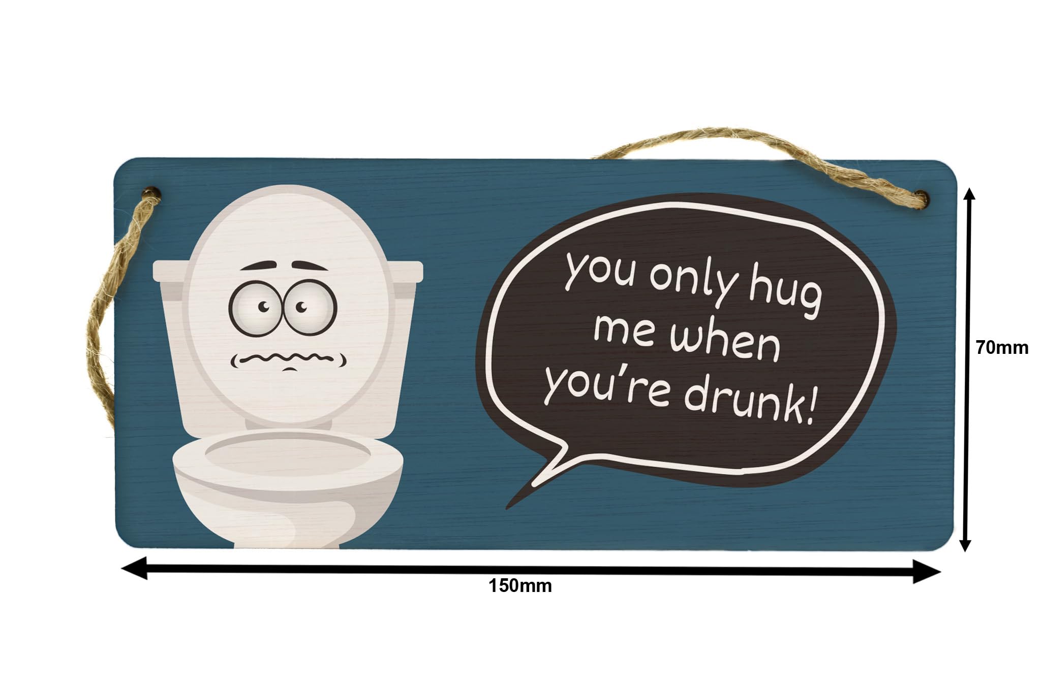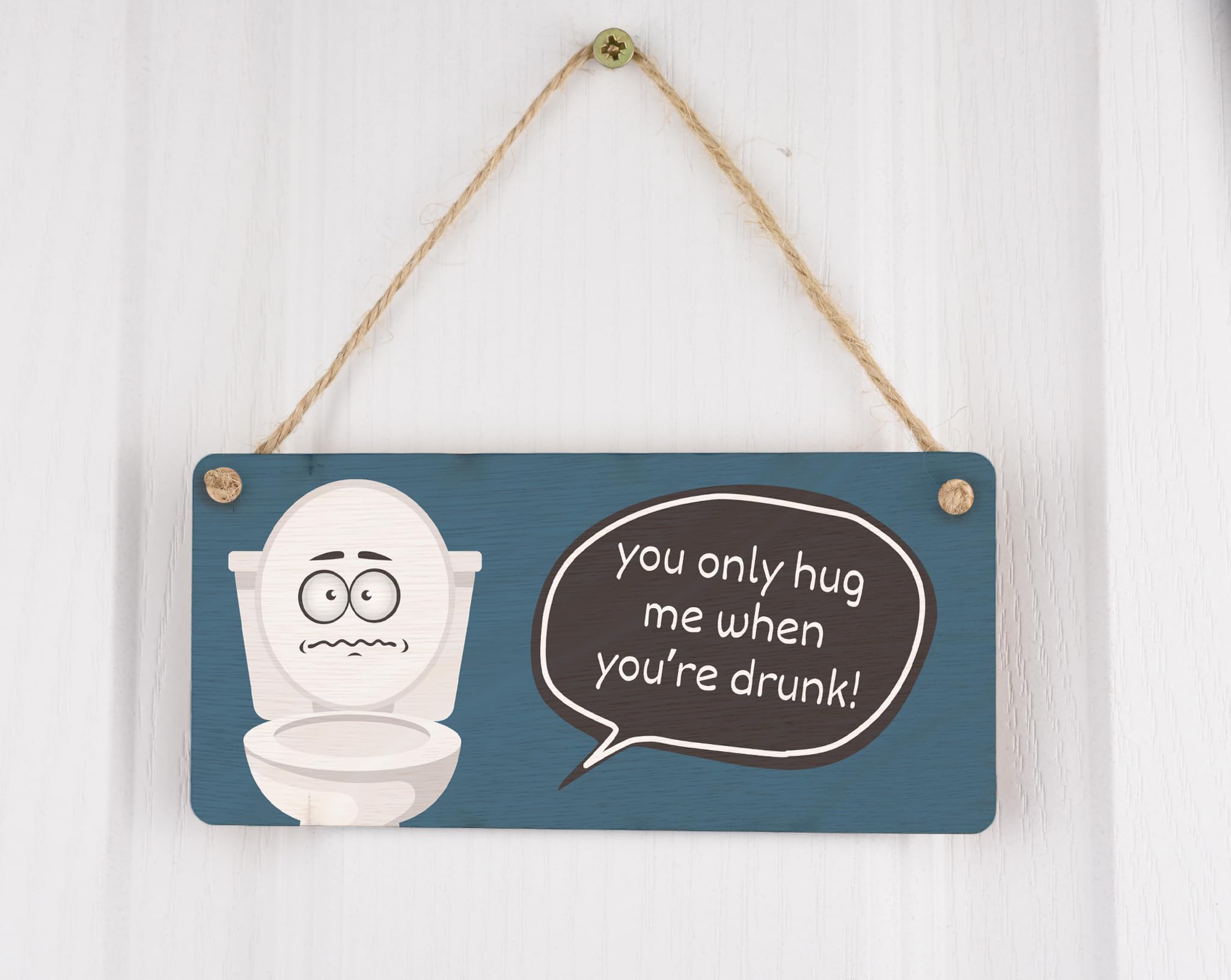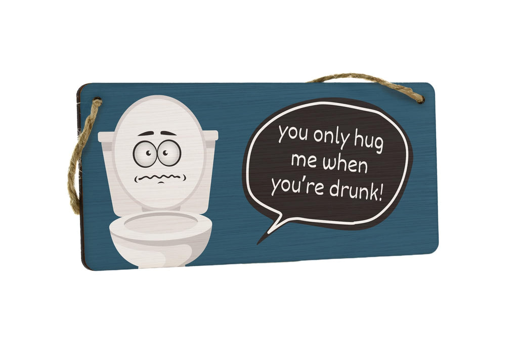 Introducing our hilarious Novelty Hanging Plywood Sign! This funny bathroom sign is the perfect gift for anyone with a sense of humor, making it an ideal choice for your husband, wife, girlfriend, or boyfriend. With its full-colour design and witty message, this sign is sure to bring a smile to their face every time they see it hanging in the bathroom. The sign reads 'You Only Hug Me When You're Drunk' and features an image of a toilet, making it a great gift for drinking enthusiasts or anyone who enjoys a good laugh. Made from quality plywood, this hanging sign is both durable and lightweight, making it easy to hang on any wall or door. Brighten up your bathroom and add a touch of humor with this funny and unique novelty gift!
