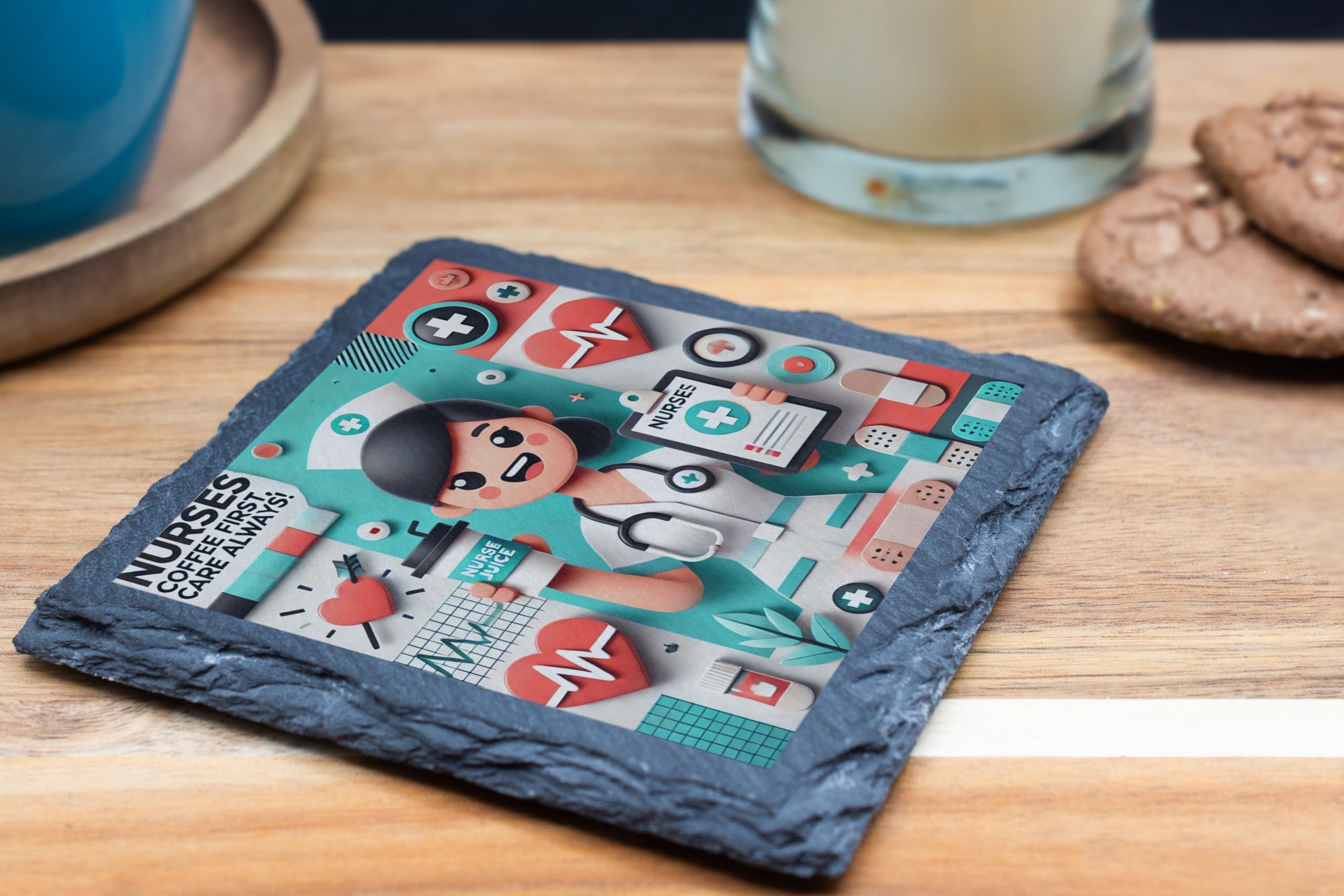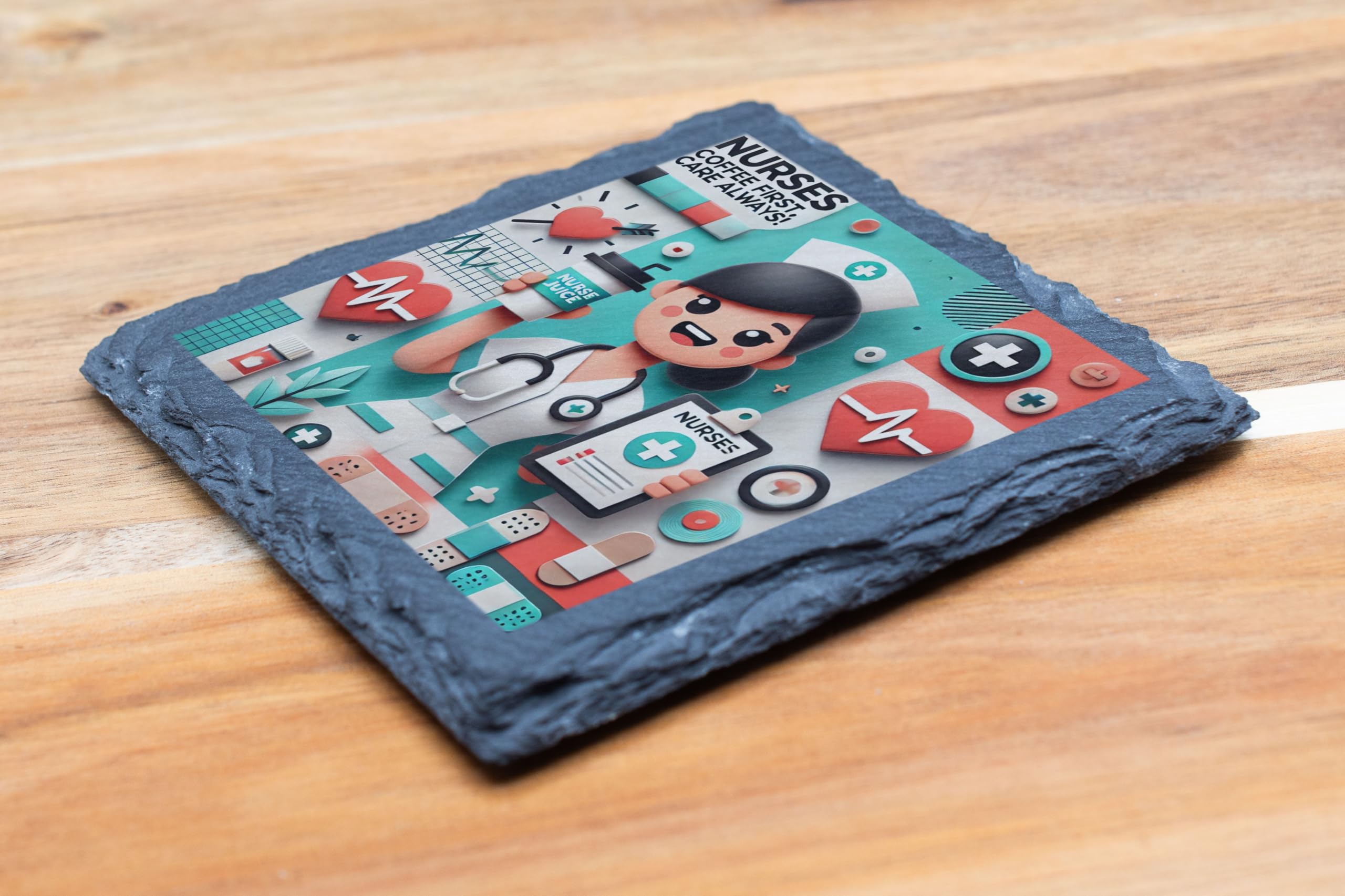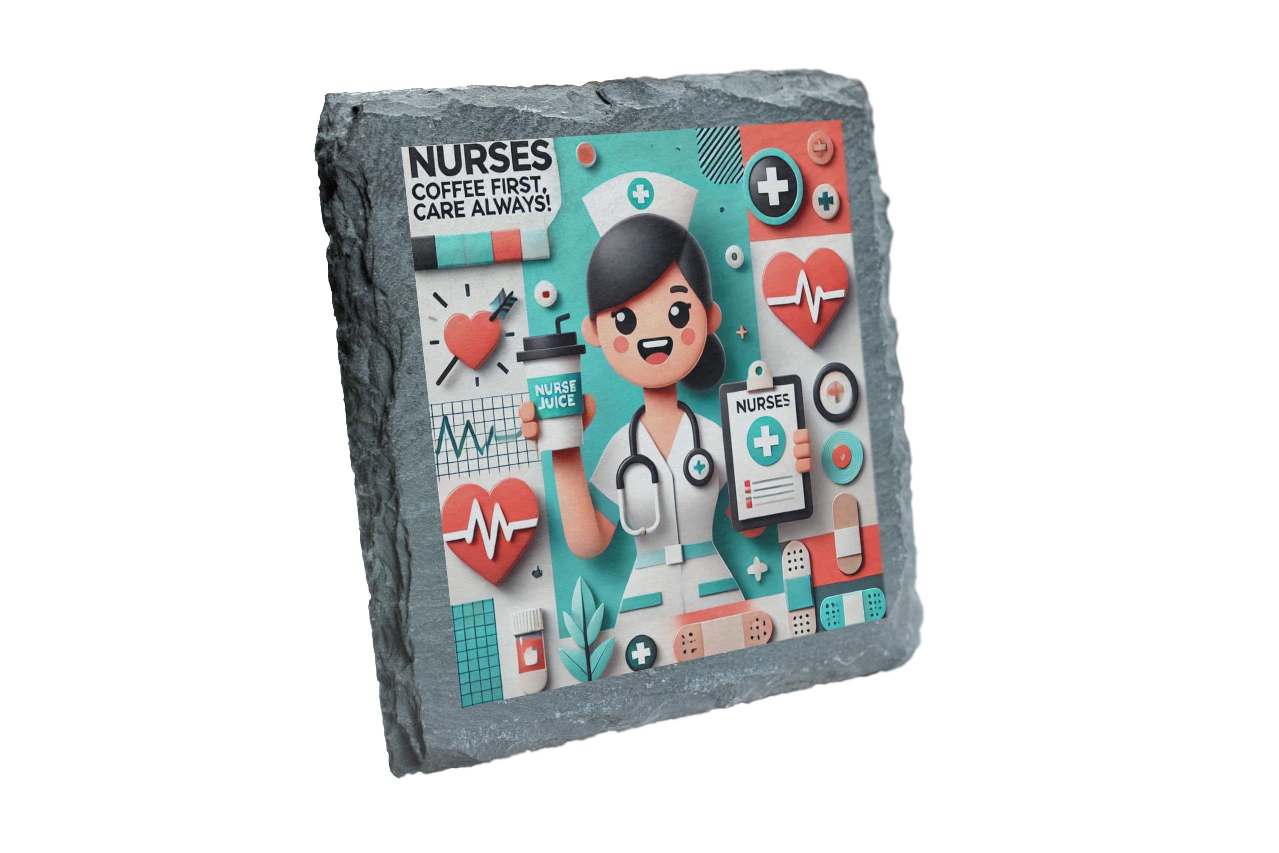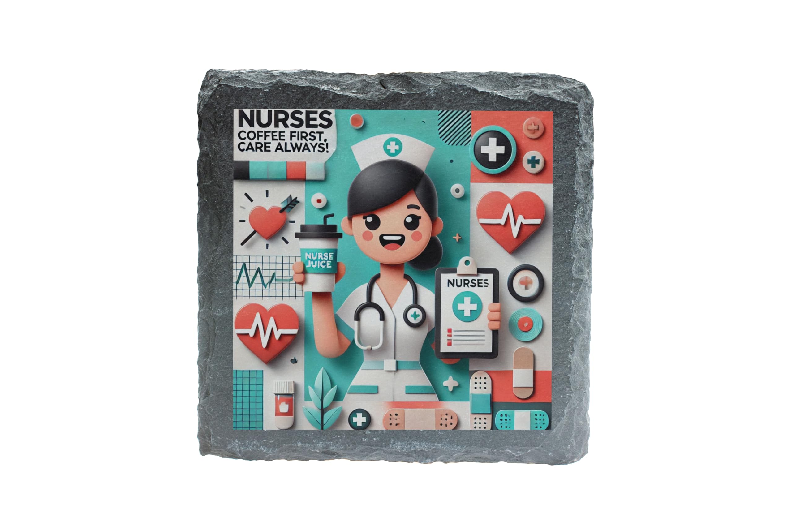 Show appreciation for nurses with this Nurses Slate Coaster, featuring the playful "Coffee First, Care Always" slogan and a dynamic teal and red color palette. Perfect for hardworking nurses who deserve a break, this coaster combines functionality and flair. Crafted from premium slate, this coaster not only protects surfaces but adds a stylish touch to any space. Whether it?s a nurse's station, desk, or coffee table, this coaster is both a practical accessory and a heartfelt tribute to the selfless care nurses provide. A thoughtful gift for any occasion to show love and appreciation for the heroes in scrubs!
