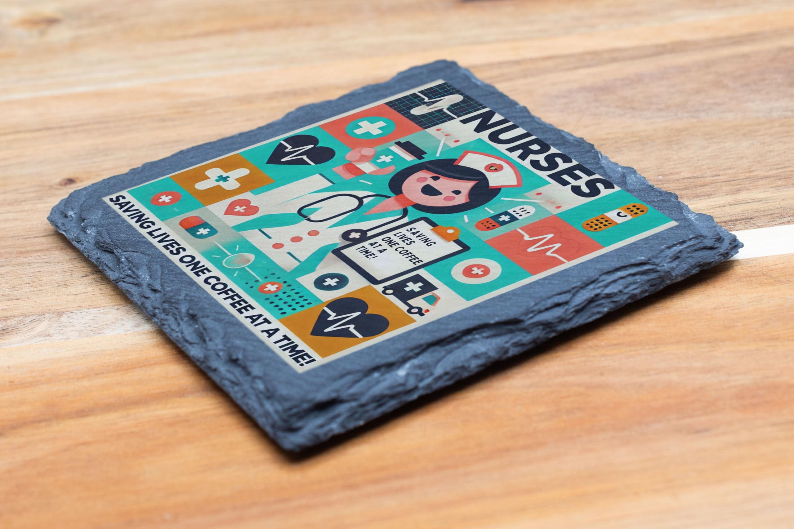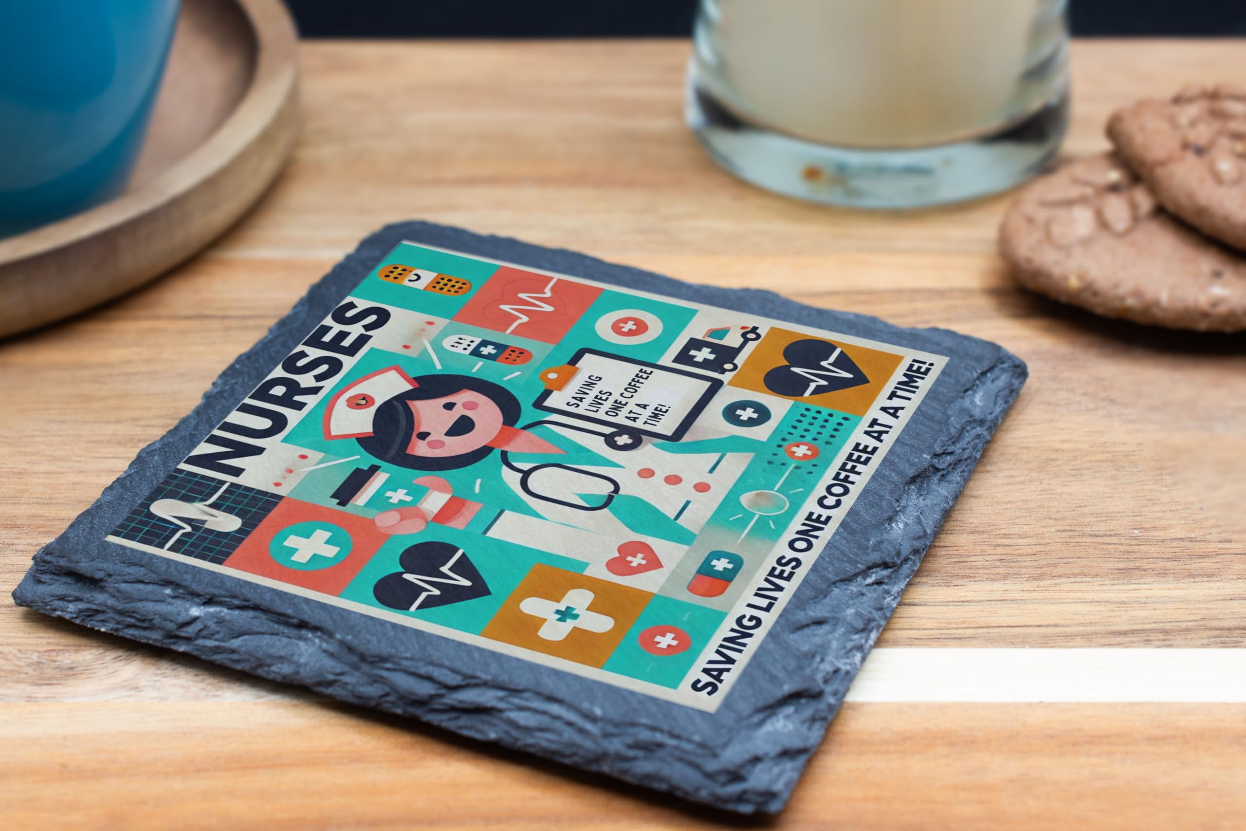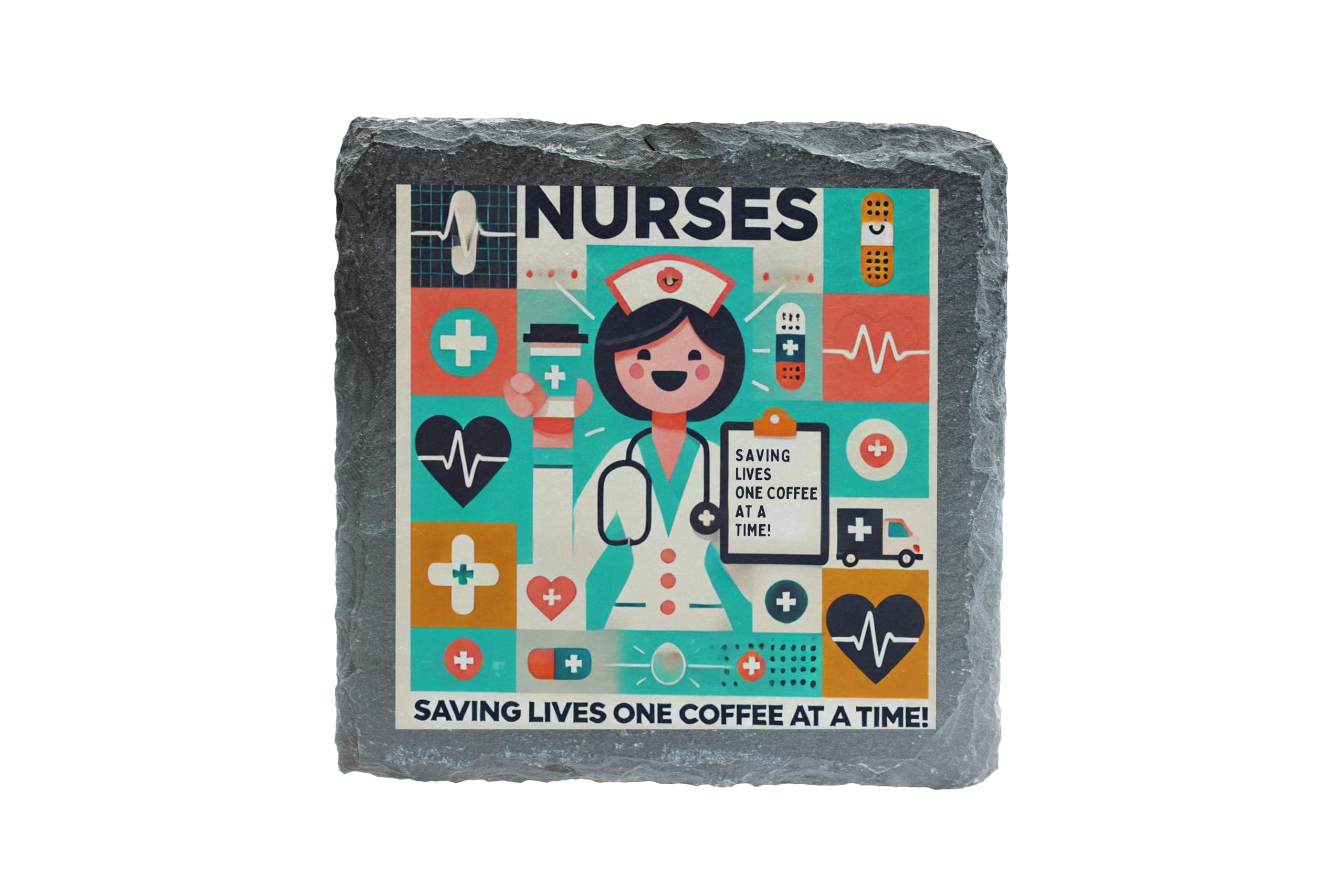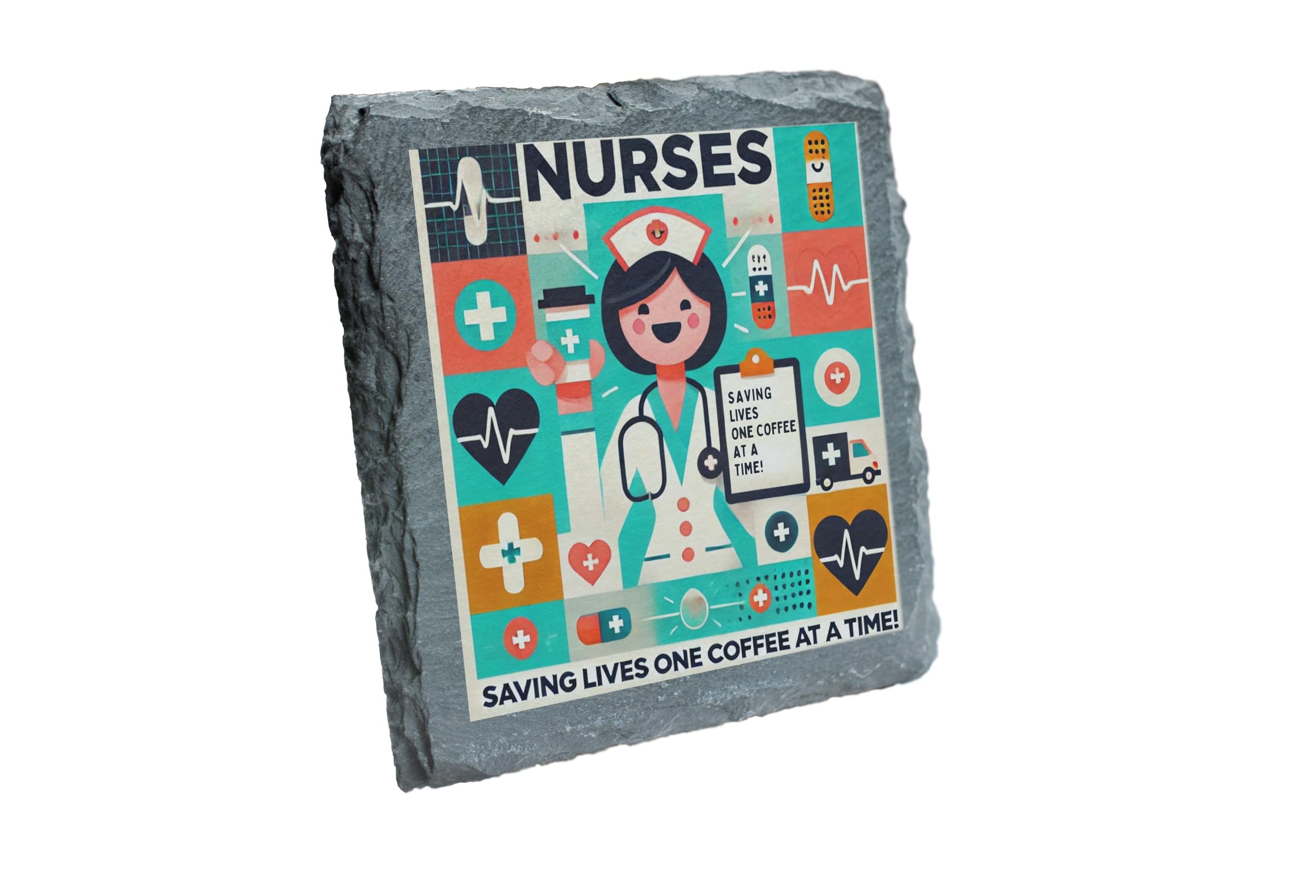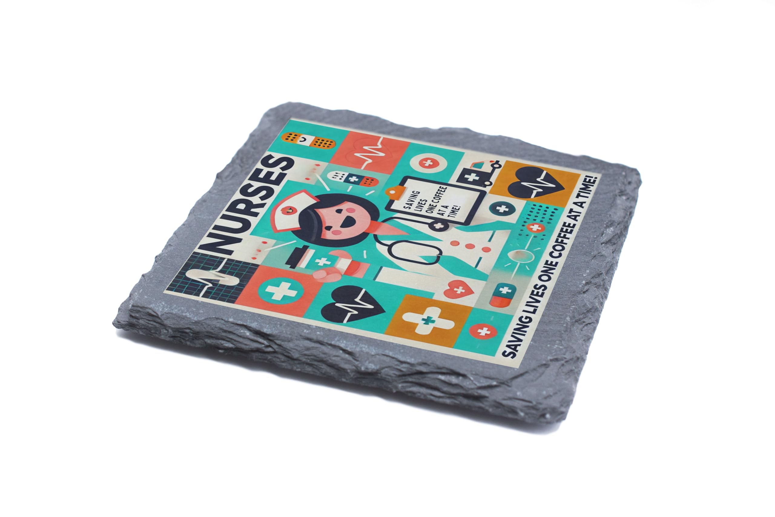 Celebrate the dedication and passion of nurses with this Nurses Slate Coaster. The fun and colorful design honors their vital role, featuring the phrase: "Saving Lives One Coffee at a Time." Whether as a token of appreciation or a practical addition to your home or office, this coaster is perfect for any nurse or healthcare worker. Crafted from high-quality natural slate, it offers durability and functionality while adding a touch of personality to your decor. The non-slip base ensures surfaces stay protected, making it ideal for coffee tables, desks, or breakroom setups. A thoughtful gift for any occasion, this coaster is both meaningful and practical.