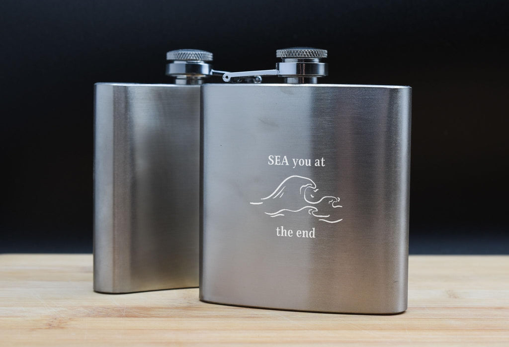 - Ocean wave design stainless steel flask with a fun quote 'SEA You at the End'