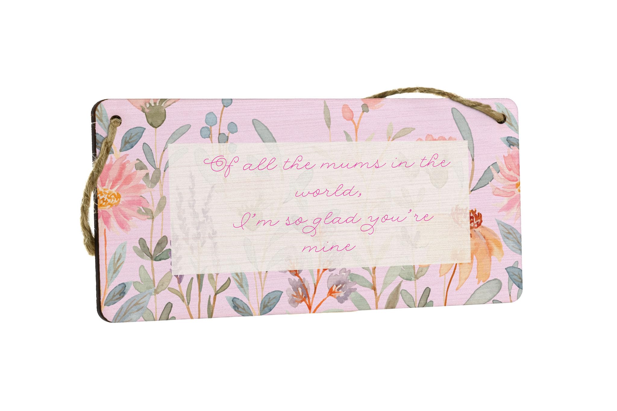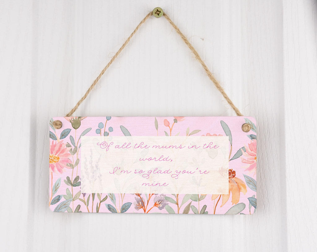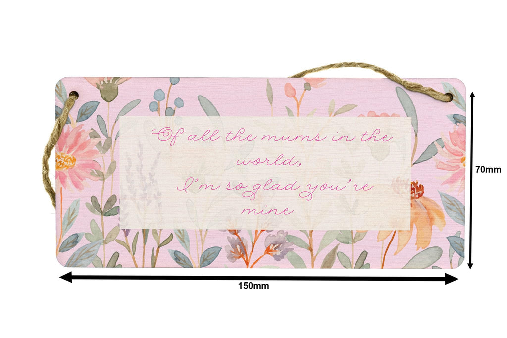 Introducing our Of All the Mums in the World, I'm So Glad You're Mine - Novelty Plywood Hanging Sign! This exquisite home decor piece is a must-have for every mum out there. Made from quality plywood, this hanging sign is not only durable but also visually appealing. The full colour design features charming images of flowers that add a touch of elegance to any living space. With its heart-warming message that reads 'Of All the Mums in the World, I'm So Glad You're Mine', this sign is a perfect way to show your appreciation and love for your mum. The pink writing and background further enhance the beauty of this family sign, making it truly eye-catching and a conversation starter. Place it in the centre of attention in your living room and let it brighten up your home!