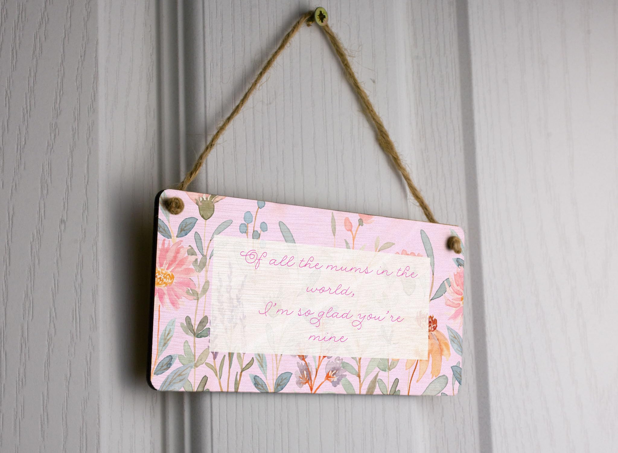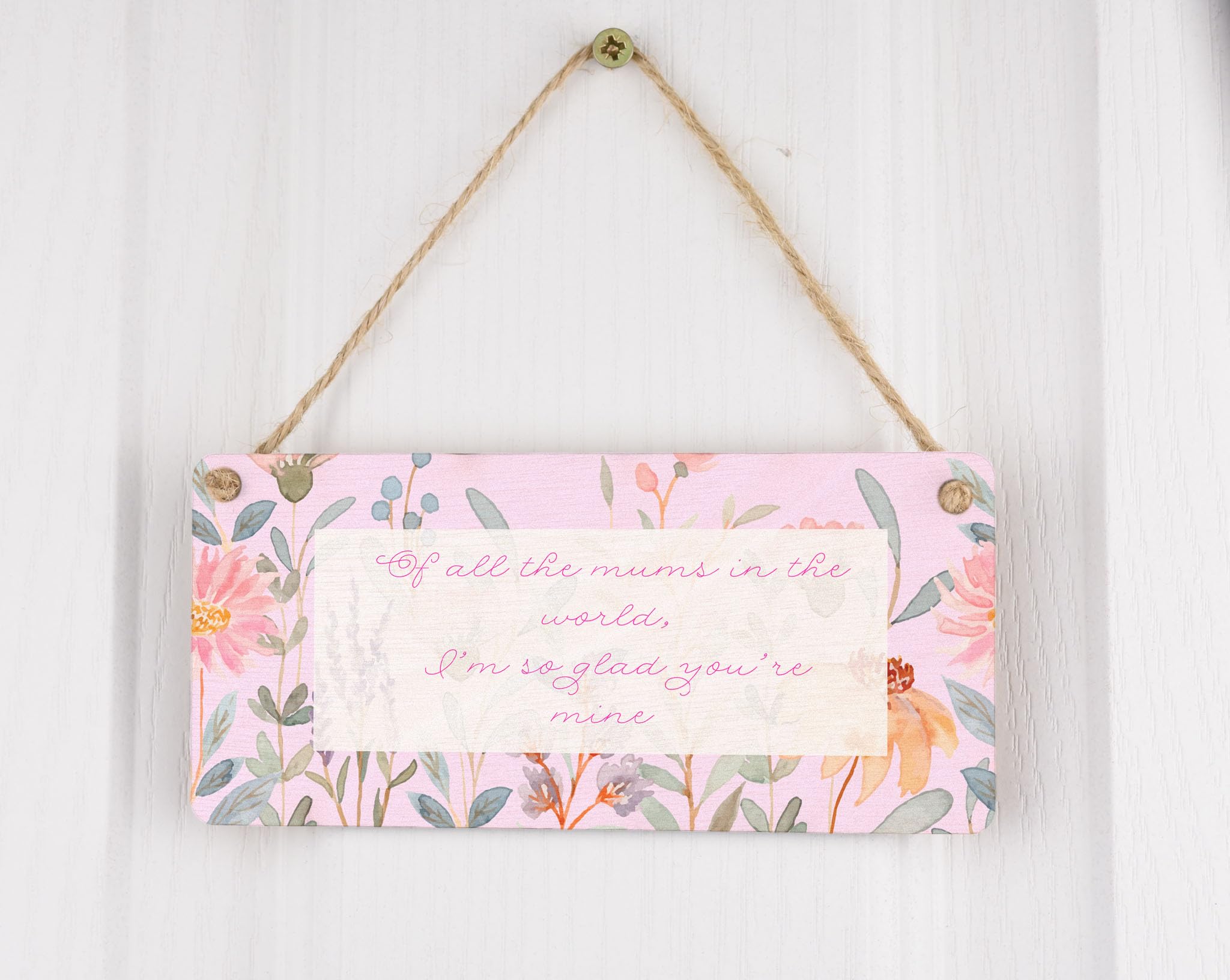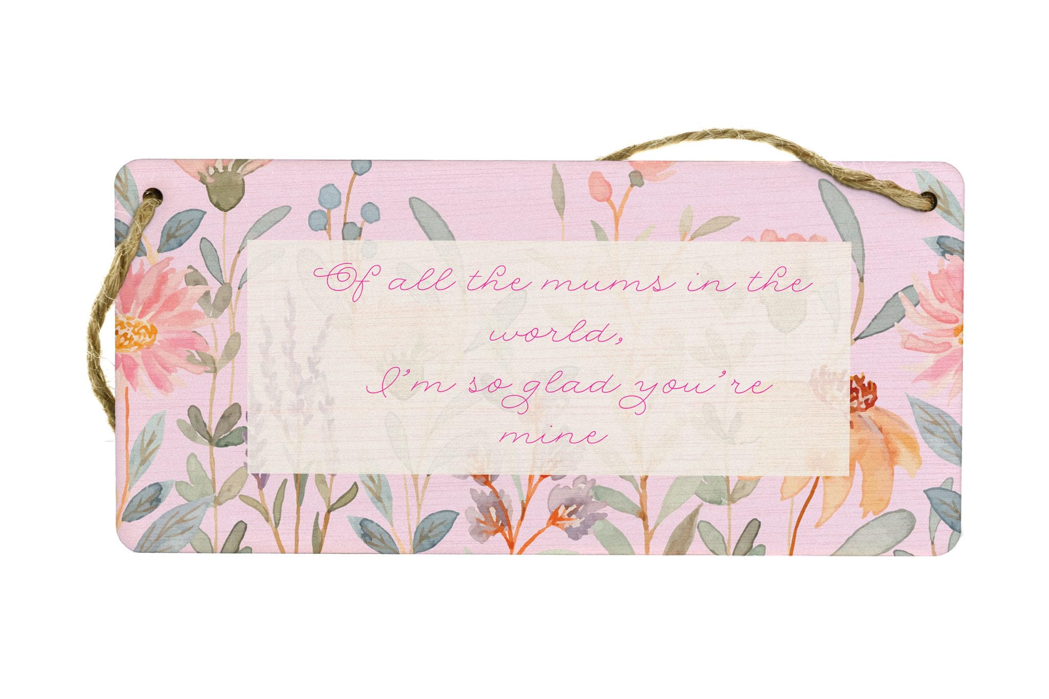 Introducing our Of All the Mums in the World, I'm So Glad You're Mine - Novelty Plywood Hanging Sign! This exquisite home decor piece is a must-have for every mum out there. Made from quality plywood, this hanging sign is not only durable but also visually appealing. The full colour design features charming images of flowers that add a touch of elegance to any living space. With its heart-warming message that reads 'Of All the Mums in the World, I'm So Glad You're Mine', this sign is a perfect way to show your appreciation and love for your mum. The pink writing and background further enhance the beauty of this family sign, making it truly eye-catching and a conversation starter. Place it in the centre of attention in your living room and let it brighten up your home!