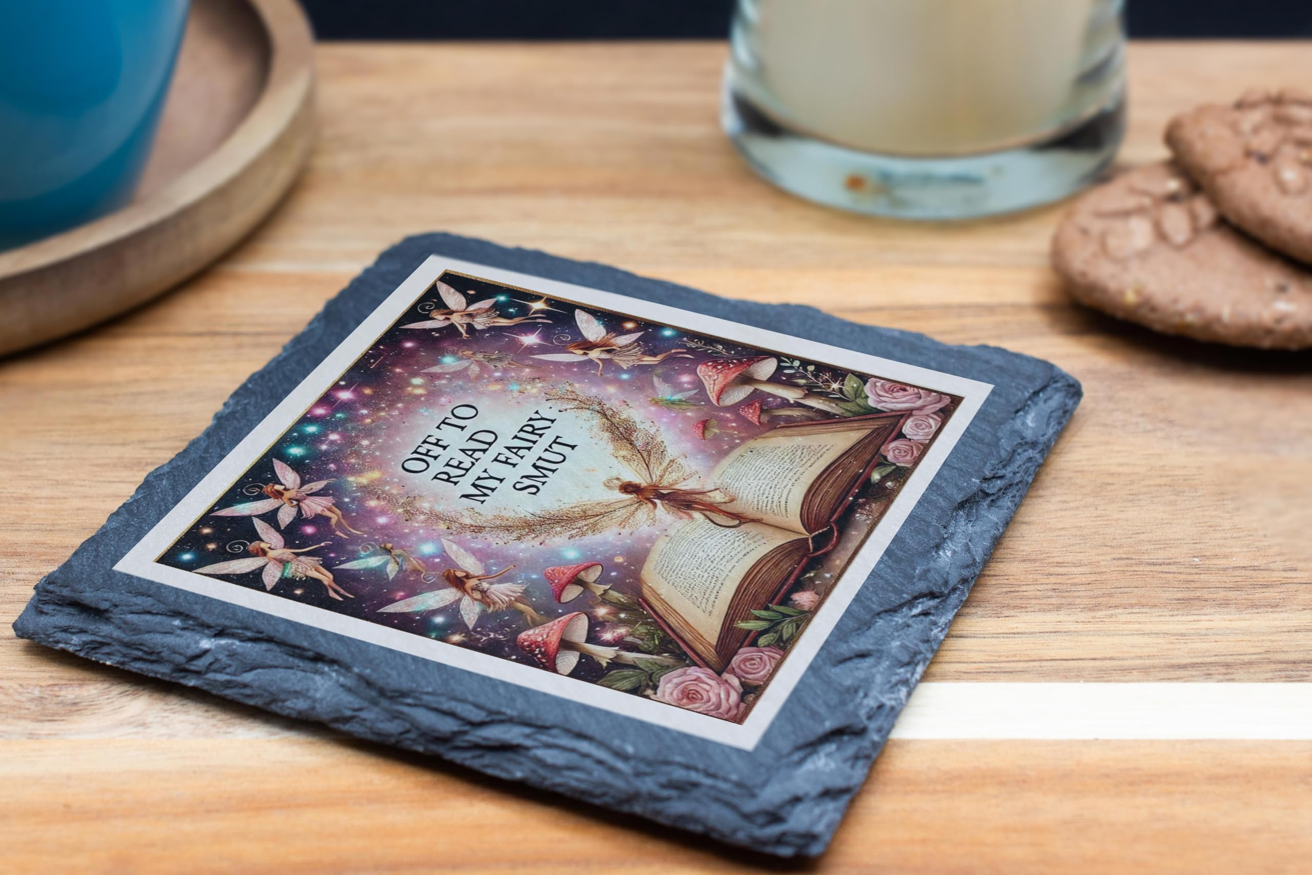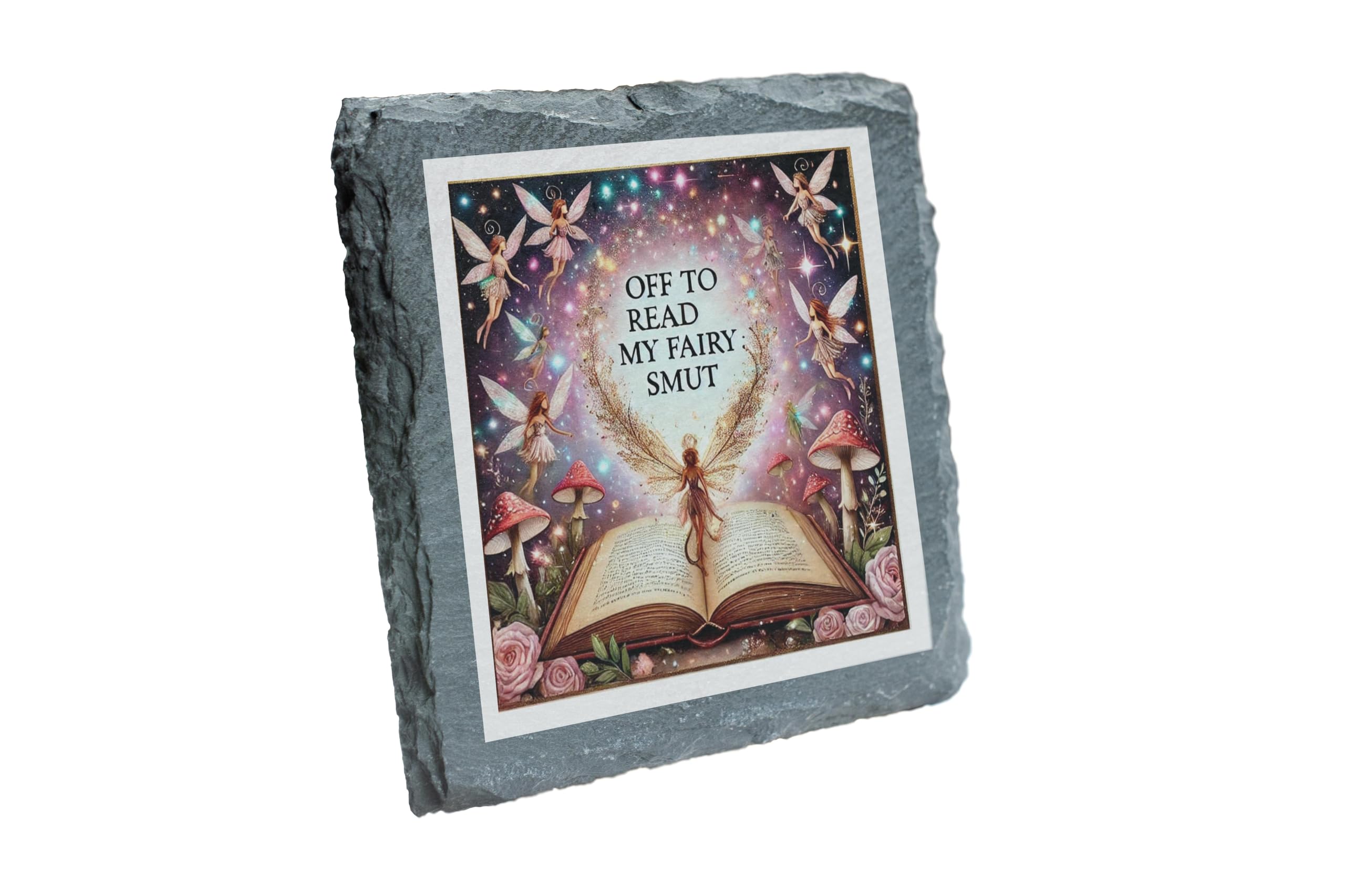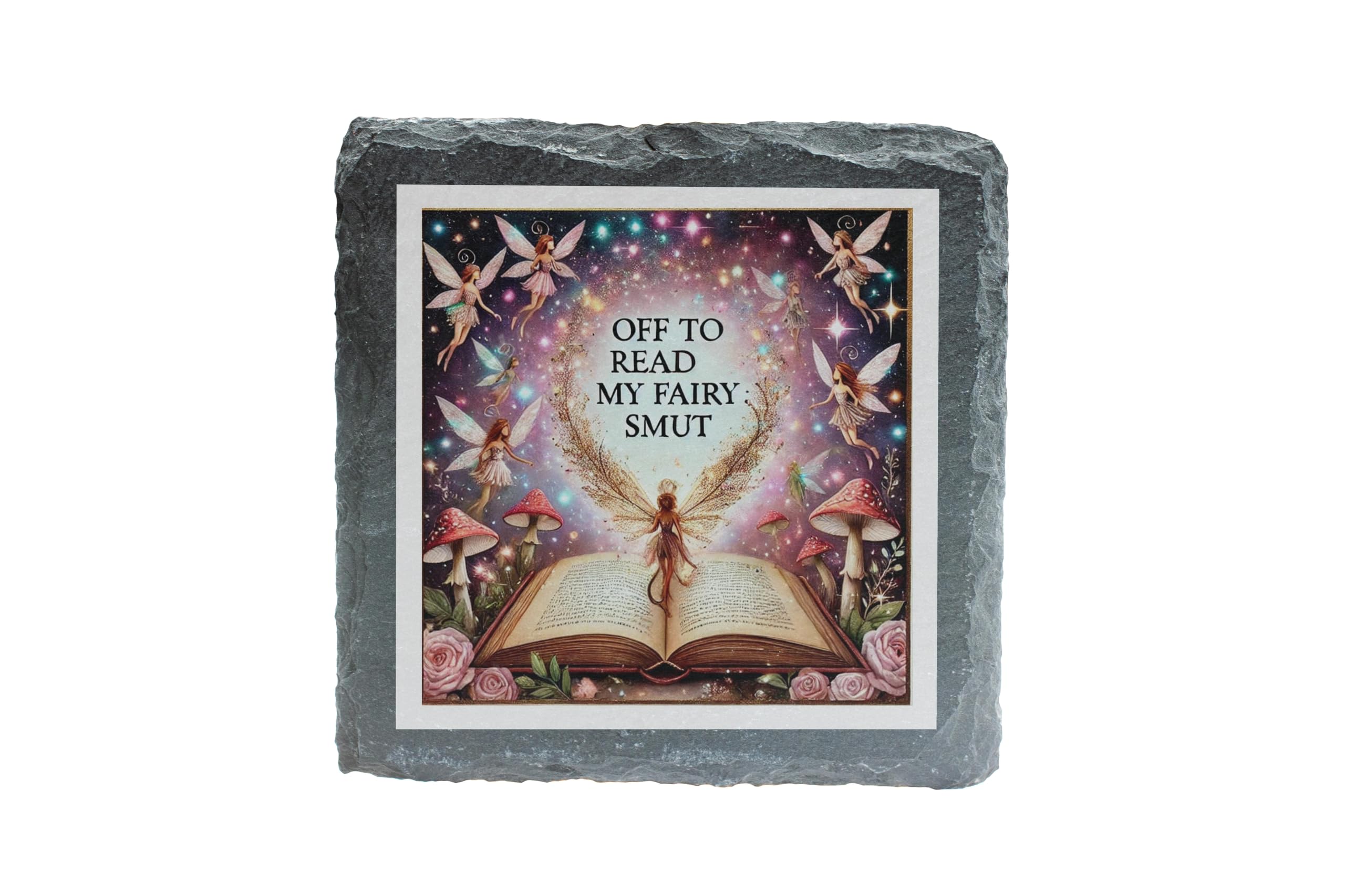 Unleash your whimsical side with the "Off to Read My Fairy Smut" Slate Coaster. This delightfully cheeky design is perfect for fantasy lovers and book enthusiasts alike, combining humor with a magical aesthetic. The artwork showcases radiant fairies, glowing toadstools, and roses surrounding an open book, creating a dreamy and enchanting scene. Made from natural slate, this coaster is both durable and stylish, featuring rugged edges that add a rustic charm. Its non-slip backing ensures your furniture remains scratch-free and stable, making it not only a conversation starter but also highly functional. Whether you're gifting it to a fairy tale lover or keeping it as a fun addition to your reading nook, this coaster is sure to sprinkle a little magic into everyday life.