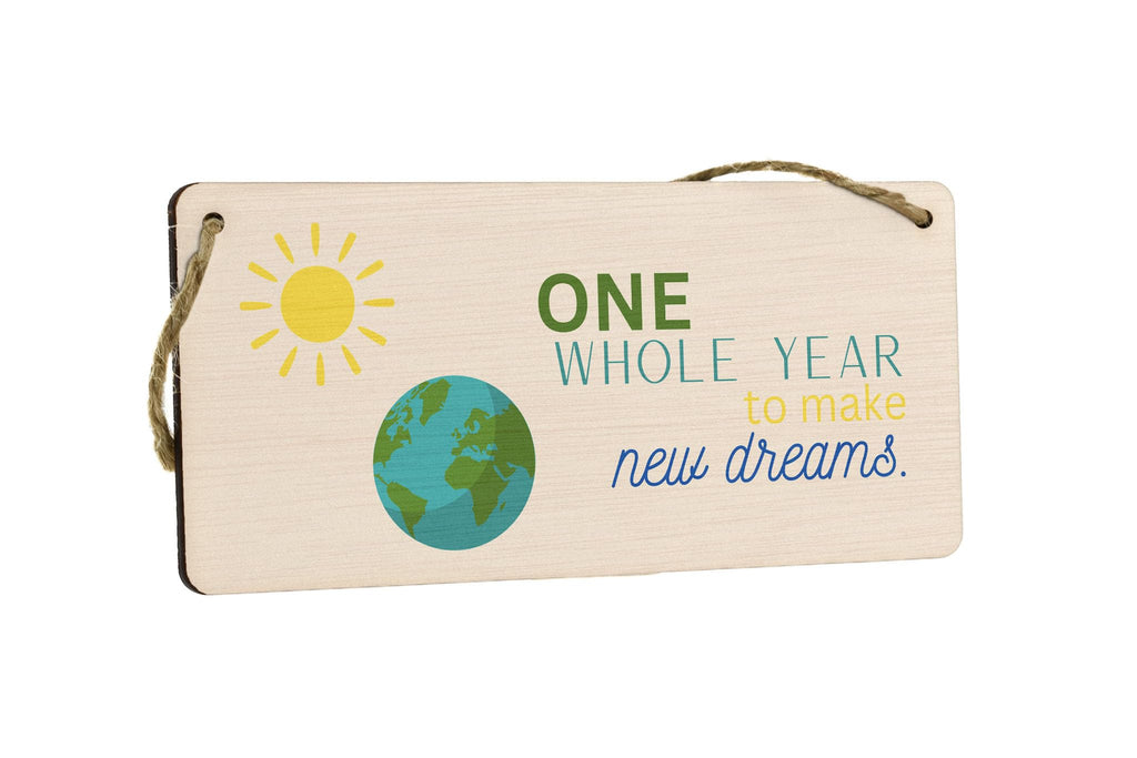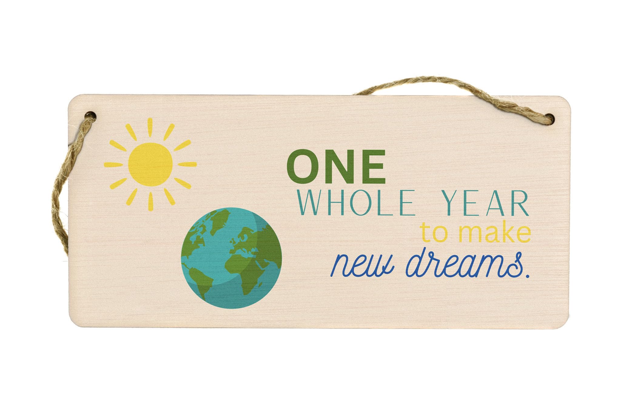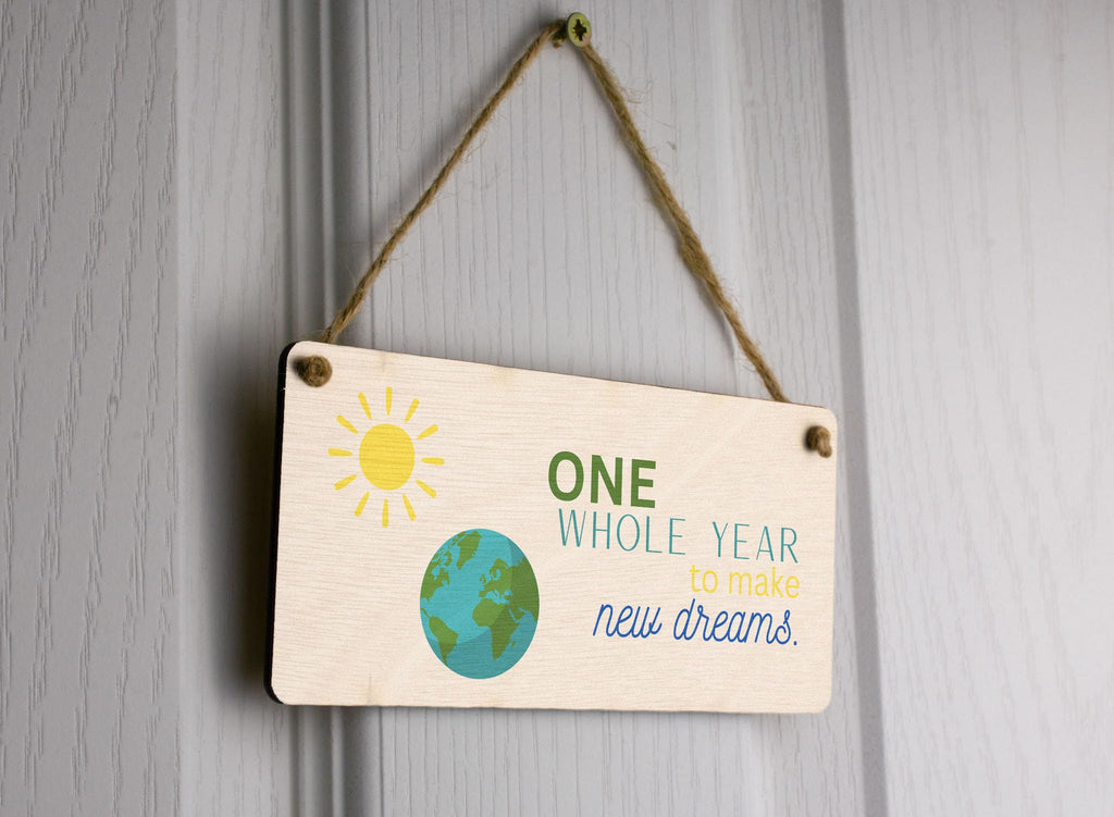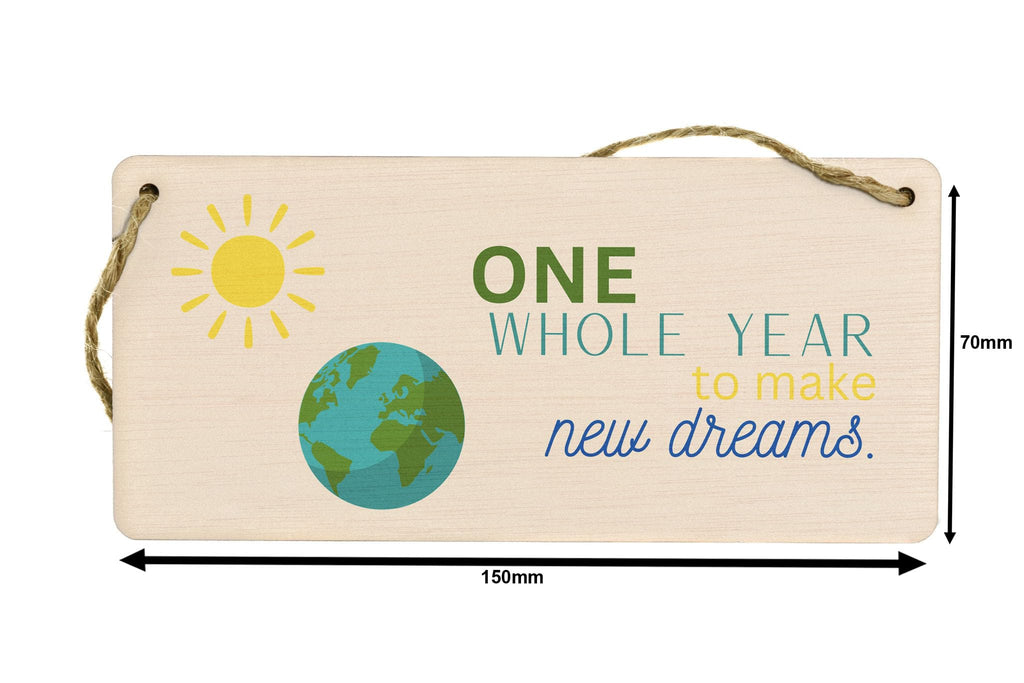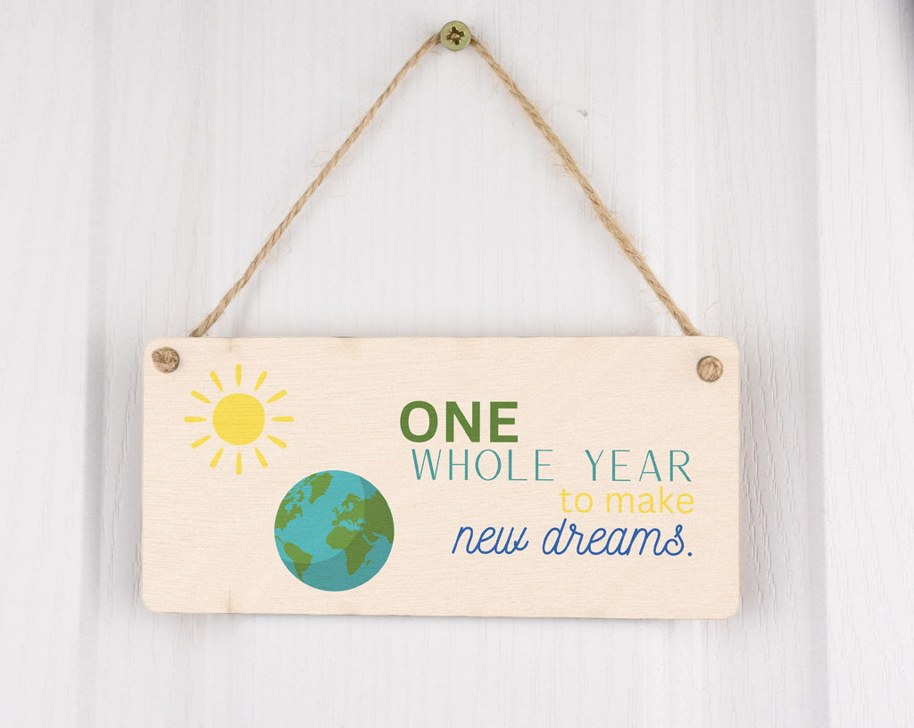 Add a touch of warmth and inspiration to your home with our Plywood Hanging Room Sign. Crafted from quality plywood, this beautiful sign features a light brown background that blends seamlessly with any home decor. The sign is designed with an image of the Earth and Sun, symbolizing the endless possibilities of a new year. The words 'One Whole Year to Make New Dreams' are elegantly written in green, yellow, blue, and teal, creating a stunning full-colour design. Make this hanging sign a thoughtful and meaningful gift for your family and friends. Whether it's for your wife, husband, girlfriend, boyfriend, son, daughter, or siblings, this sign will bring joy and inspiration to their lives. It's a perfect gift to celebrate special occasions like birthdays, anniversaries, or the start of a new year.