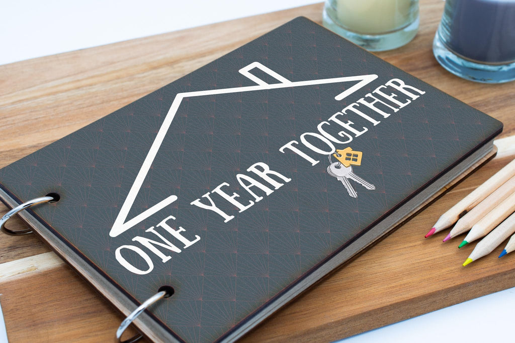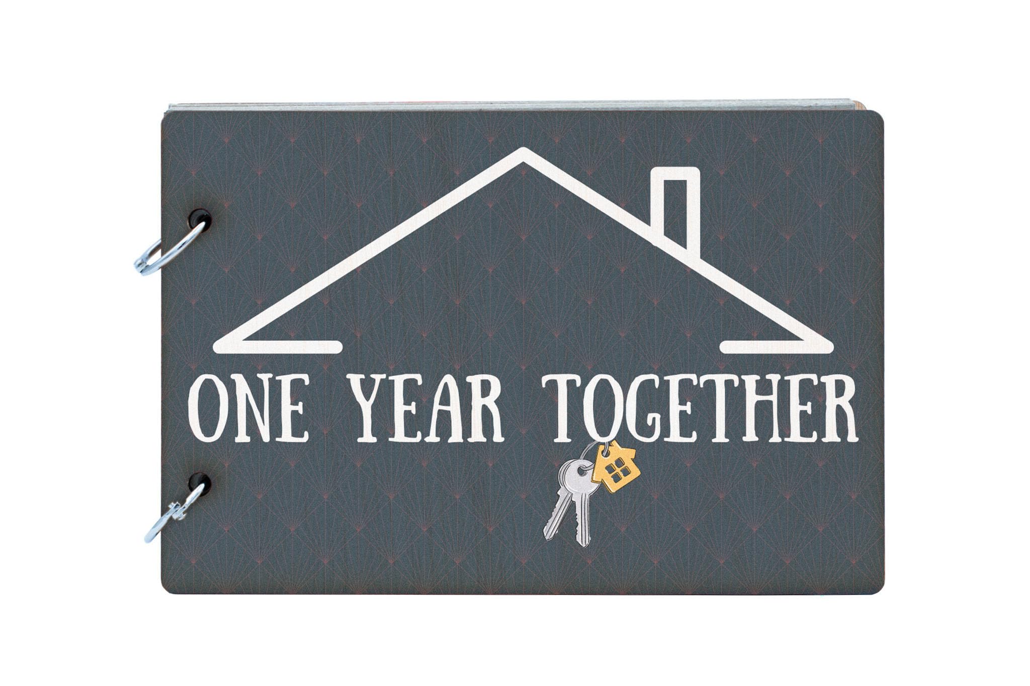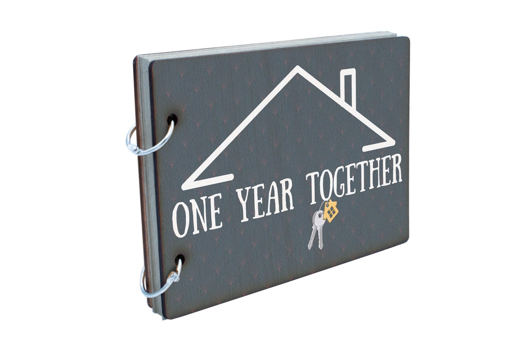 - Dark wooden cover with a modern design and 'One Year Together' inscription