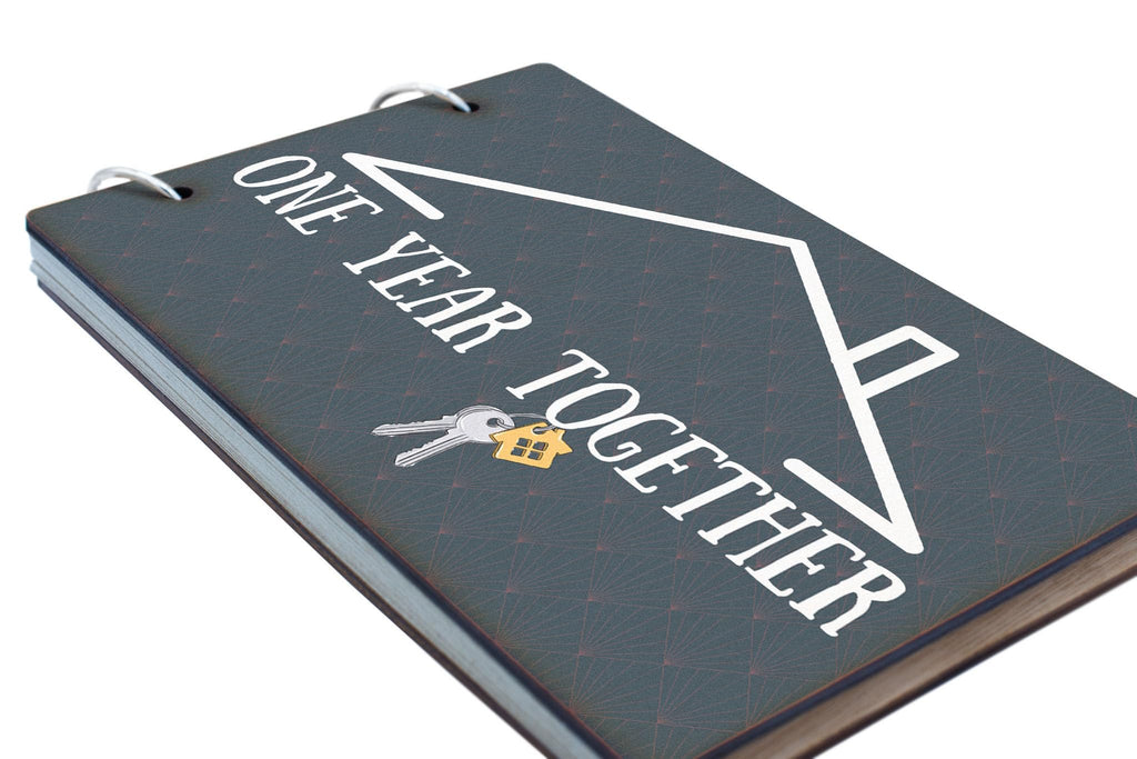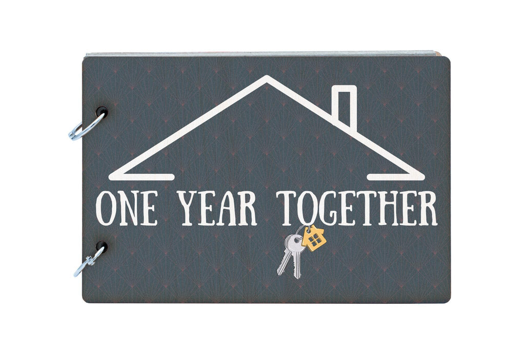 Celebrate your one-year milestone with this beautifully crafted Couple's Keepsake Memory Book. This unique memory book is the perfect way to commemorate your relationship and the love you share. The dark wooden cover reads 'One Year Together' in a simple and modern design, symbolising your togetherness. The full colour front cover features a house design on a grey background, making it a thoughtful gift idea for housewarming, anniversary, or engagement celebrations. Inside, you'll find 25 recycled pages waiting to be filled with your memories, photos, and special moments. Prioritise your relationship and cherish your love with this Couple's scrapbook, designed to bring joy and nostalgia to your home.