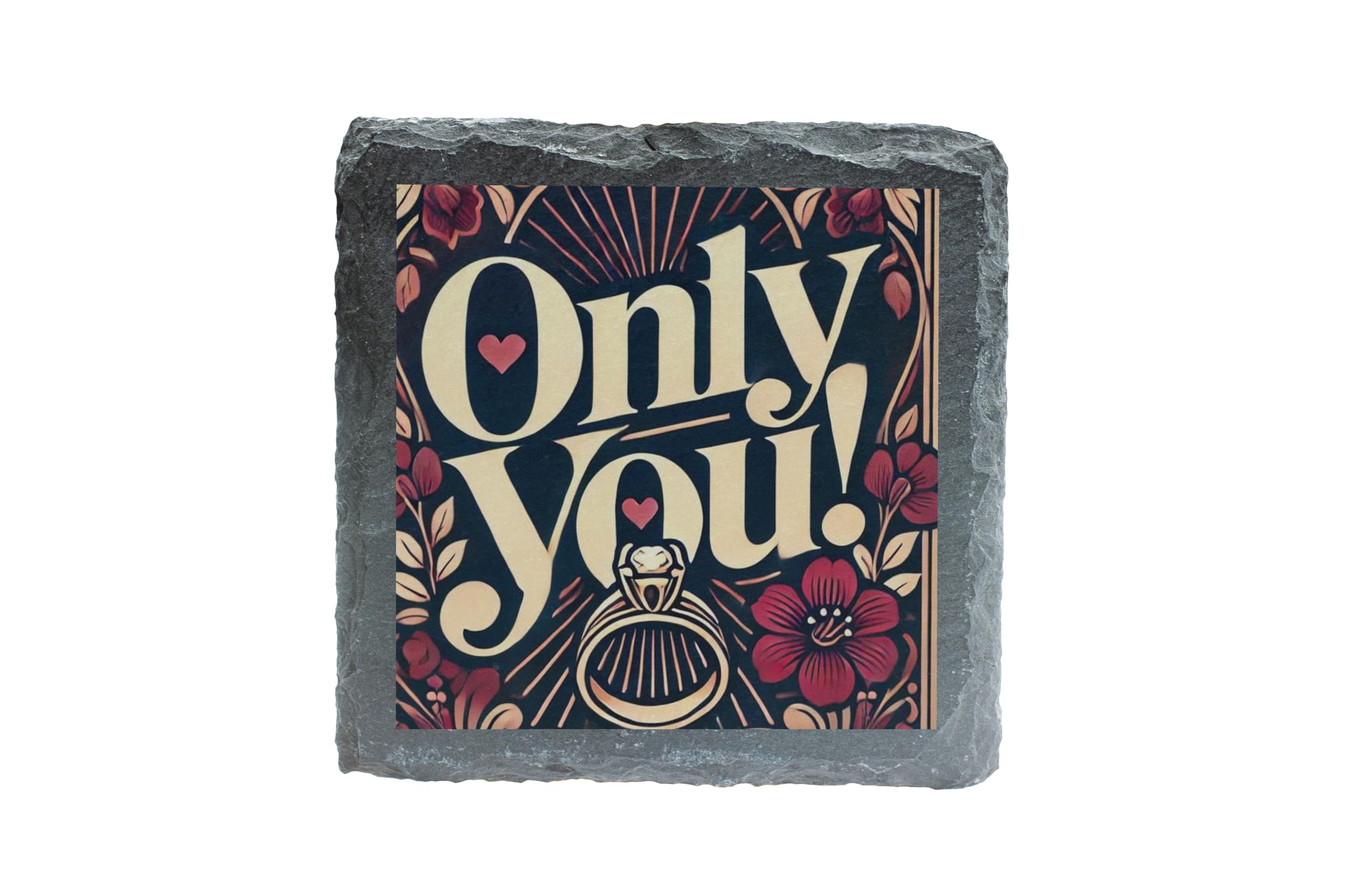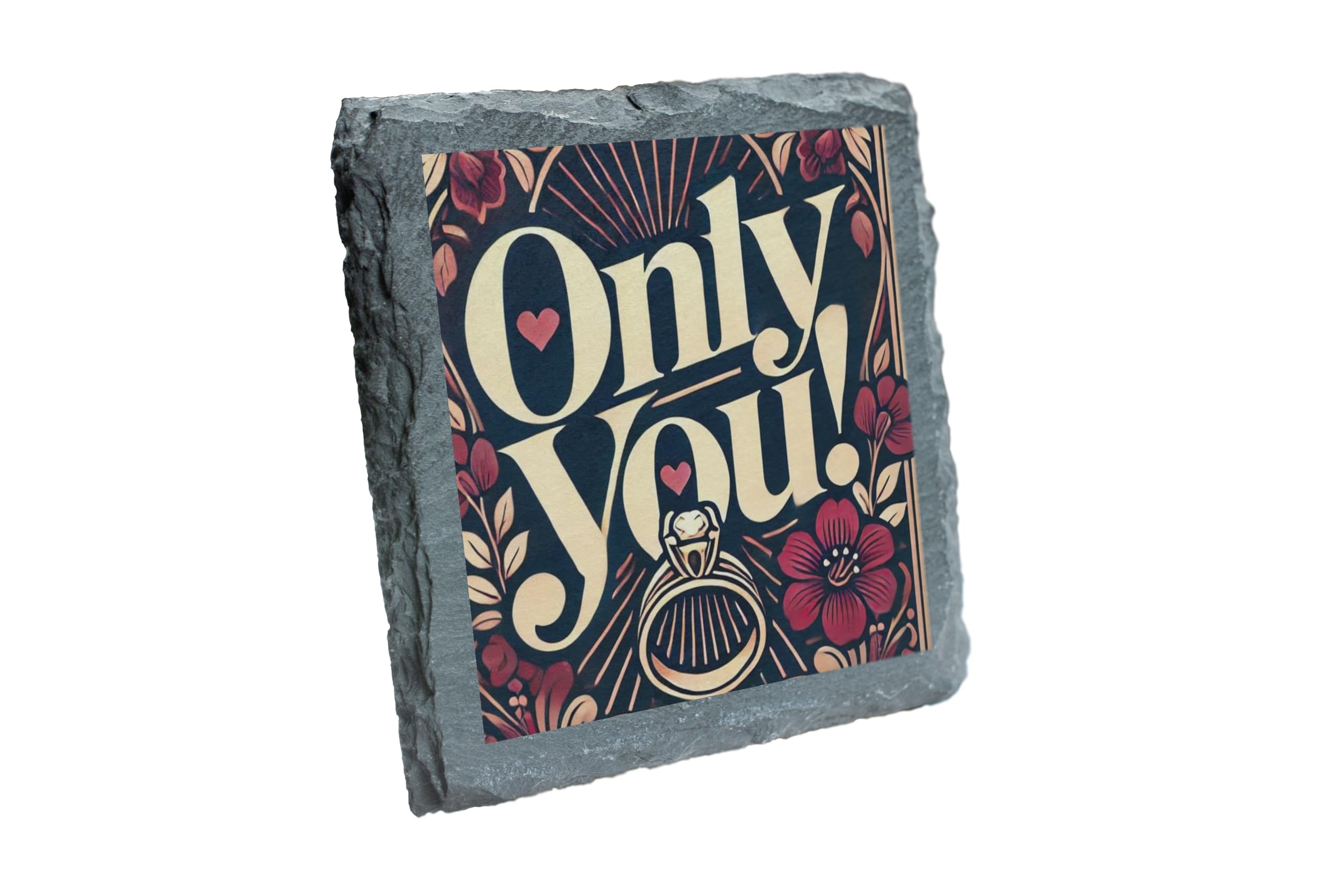 Celebrate love with this beautifully crafted "Only You!" slate coaster. Its romantic design, complete with floral accents and a diamond ring motif, makes it a standout addition to any table. Perfect for romantic dinners, engagement parties, or as a thoughtful gift for newlyweds and couples. Crafted from high-quality natural slate, this coaster combines functionality with elegance, protecting surfaces while adding a heartfelt touch. Whether you're toasting to a special moment or looking for the perfect gift to express your love, this coaster is a meaningful choice that captures the essence of commitment and romance.