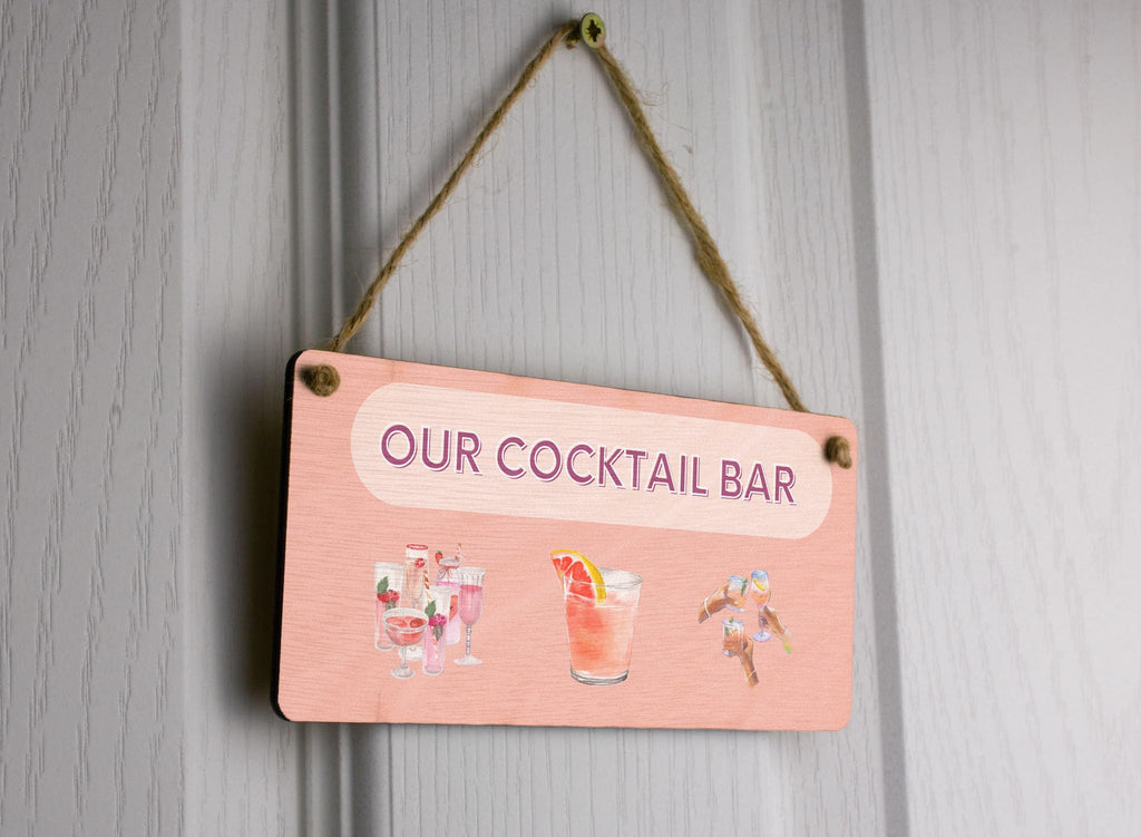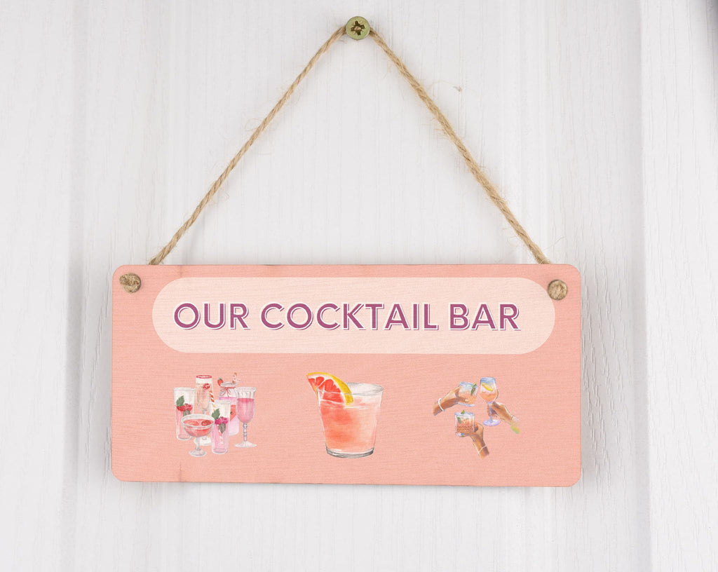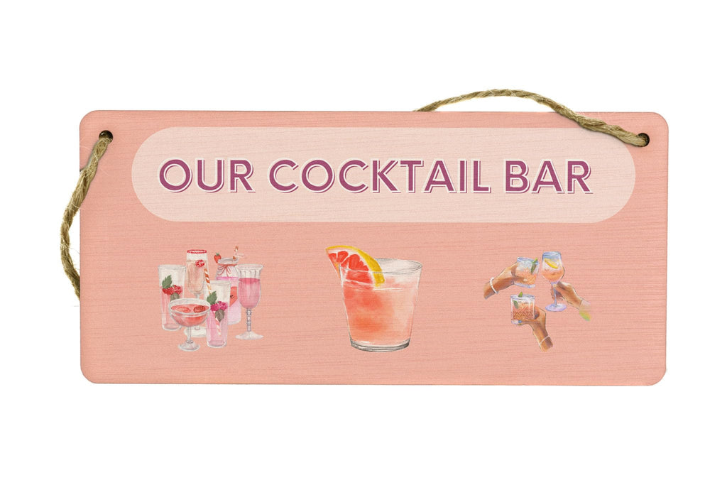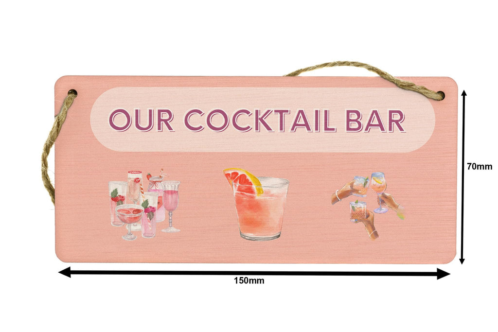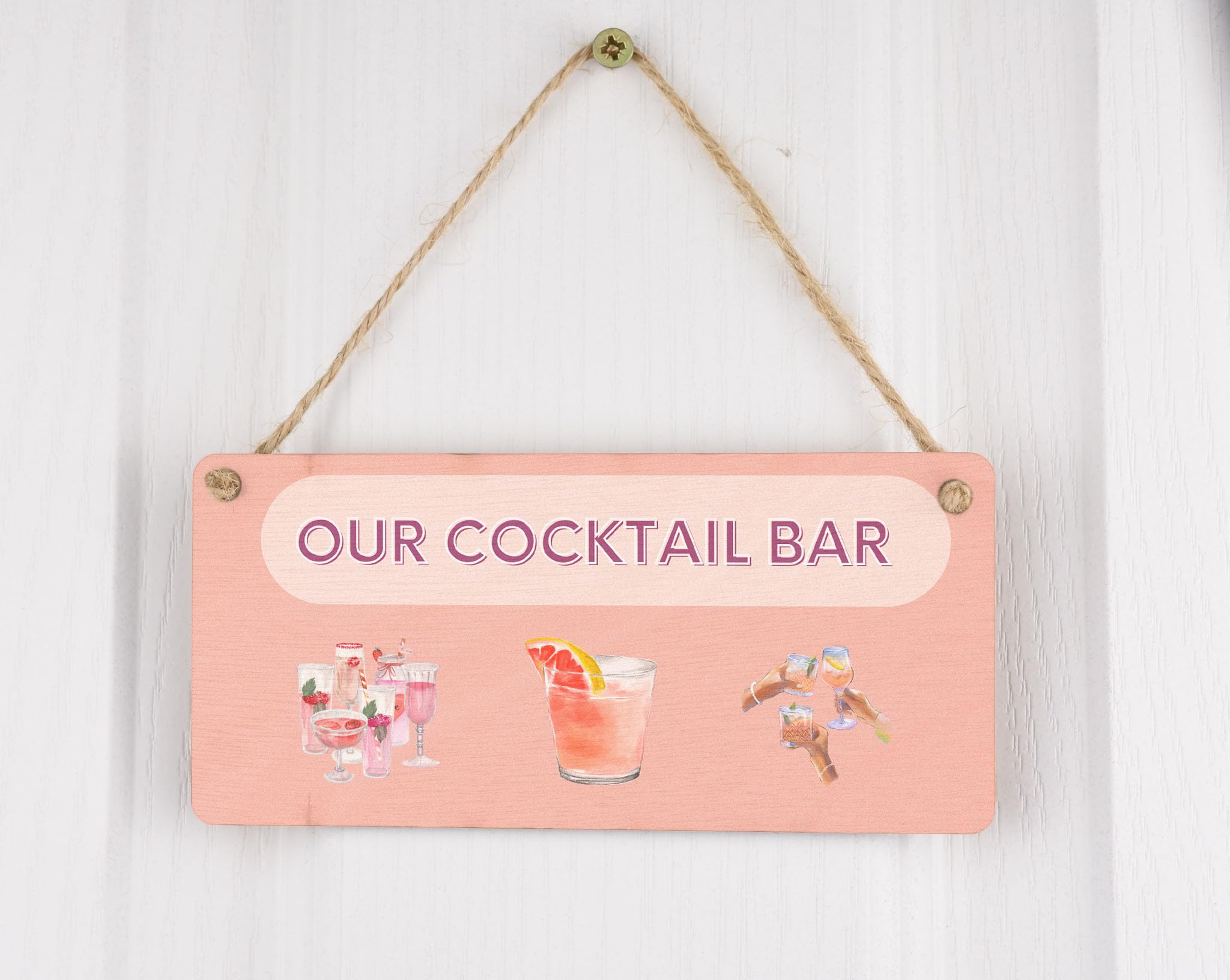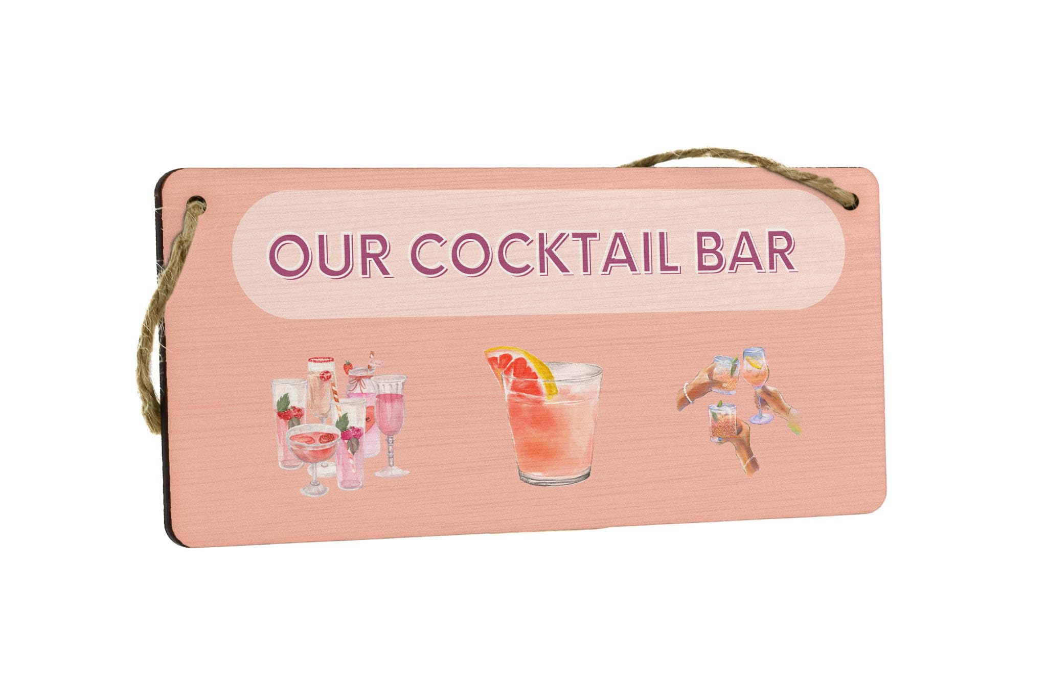 Introducing our Our Cocktail Bar - Plywood Hanging Bar Sign, the perfect addition to your cocktail bar at home! This beautifully designed sign reads 'Our Cocktail Bar' in striking purple writing on a soft pink background. Made from quality plywood, this sign is durable and long-lasting, ensuring it will be a cherished piece in your home for years to come. The full-colour design features images of different cocktails, adding a fun and vibrant touch to your space. Whether you're looking to treat yourself or find a thoughtful gift for a loved one, this hanging sign is sure to impress. Hang it in your kitchen, dining room, or any space where you and your family and friends gather to enjoy a drink together. Surprise your wife, husband, girlfriend, boyfriend, son, daughter, or siblings with this unique home decor piece that truly makes a statement.