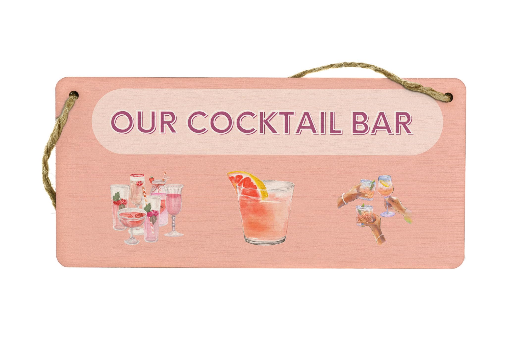 - Reads 'Our Cocktail Bar' in striking purple writing on a soft pink background