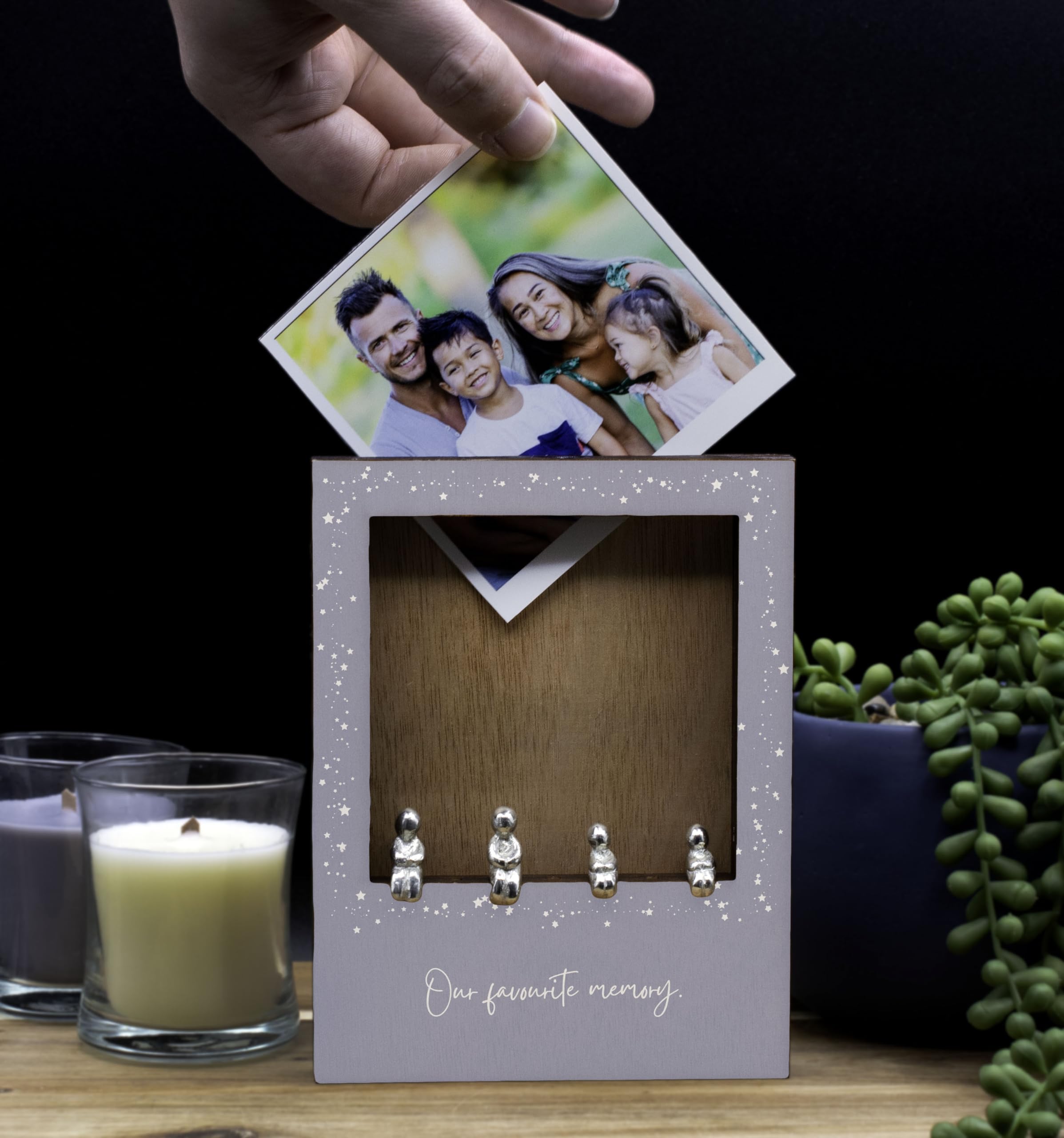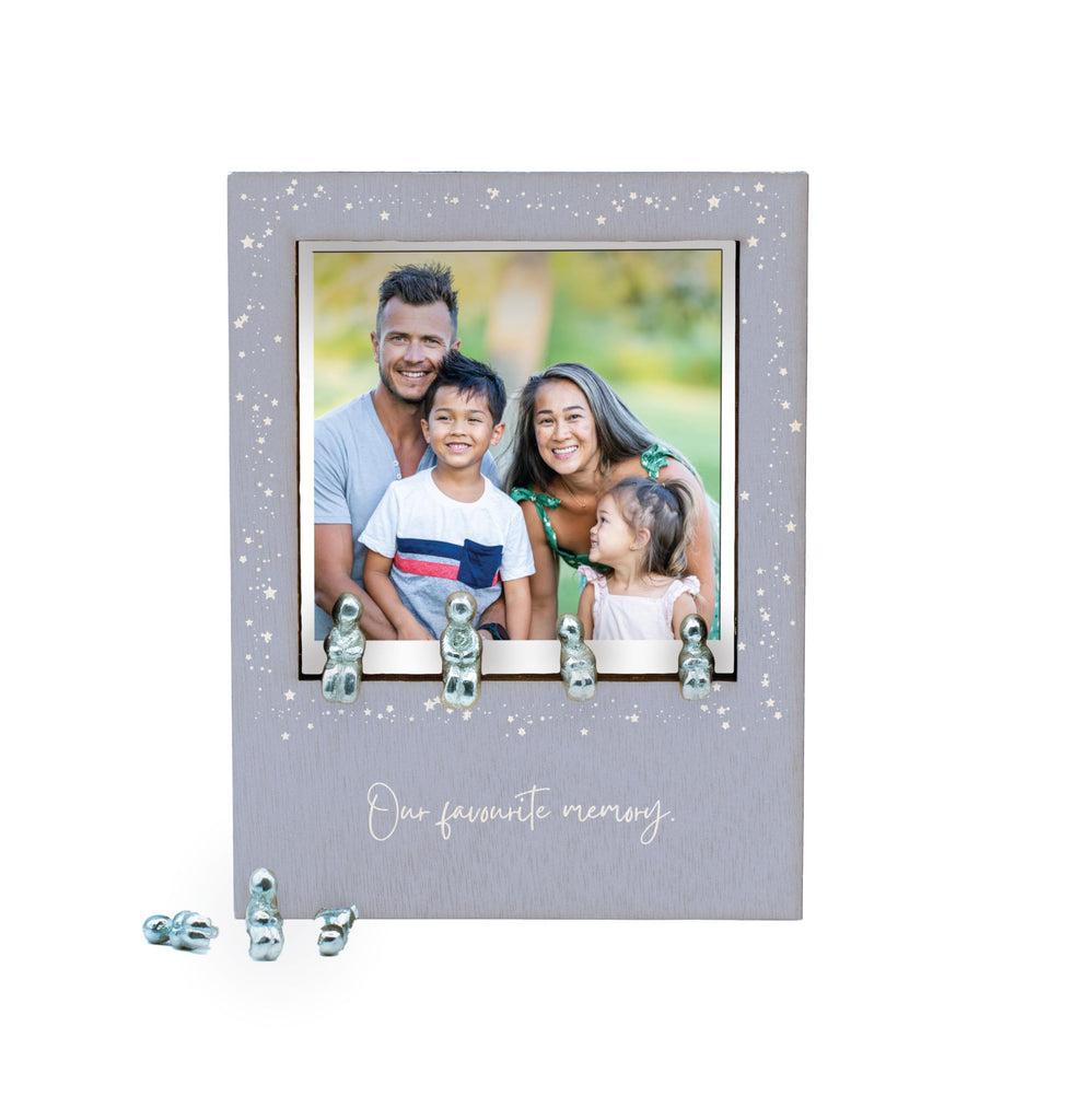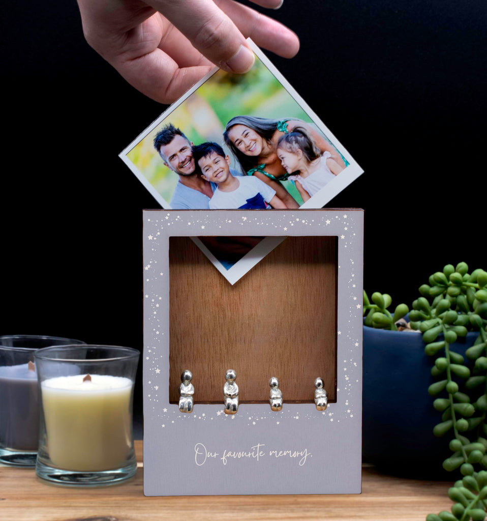 Introducing our 'Our Favourite Memory - Family Plywood Ornament' - the perfect way to cherish and display your favourite family memories. This unique photo frame ornament reads 'our favourite memory' and can hold a picture of your choice at its centre. It serves as a beautiful centre piece in any home, adding a personal touch to your decor. Made from quality plywood, this free standing ornament comes with a set of 7 metal people that can be arranged to represent your own family combination. The metal people fit perfectly within the frame, adding a 3D element to your photo. The ornament is printed in full colour with a white starry pattern background on a blue background, making it a lovely gift for any family or a wonderful addition to your own home decor.