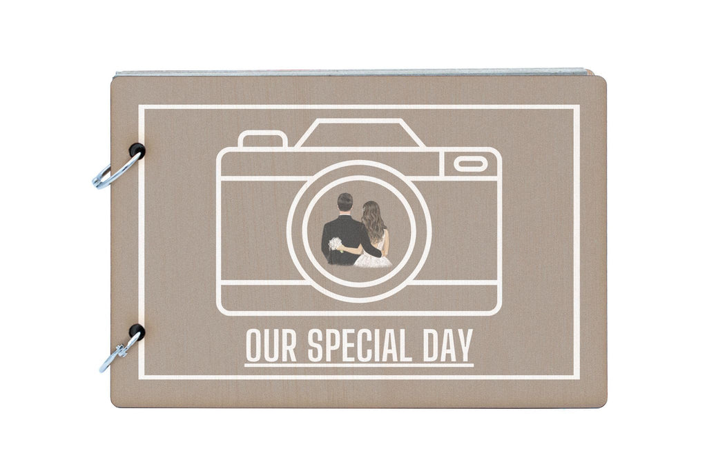 Capture and cherish your wedding memories with 'Our Wedding Day Memories: A Special Photography Album for Couples'. This beautifully crafted album is the perfect keepsake to preserve the special moments of your love story. From engagement photos to the big day itself, this bridal scrapbook is designed to hold all your romantic memories in one place. The wooden cover adds a touch of elegance, while the full colour front cover depicts a wedding-inspired design of a camera and a married couple, setting the tone for this celebration book. With 25 recycled pages, you can prioritise sustainability while reliving your marriage journey through your newlywed memories. Whether it's from your bridal shower or your wedding day photos, this album is the perfect event keepsake to commemorate your special day together.