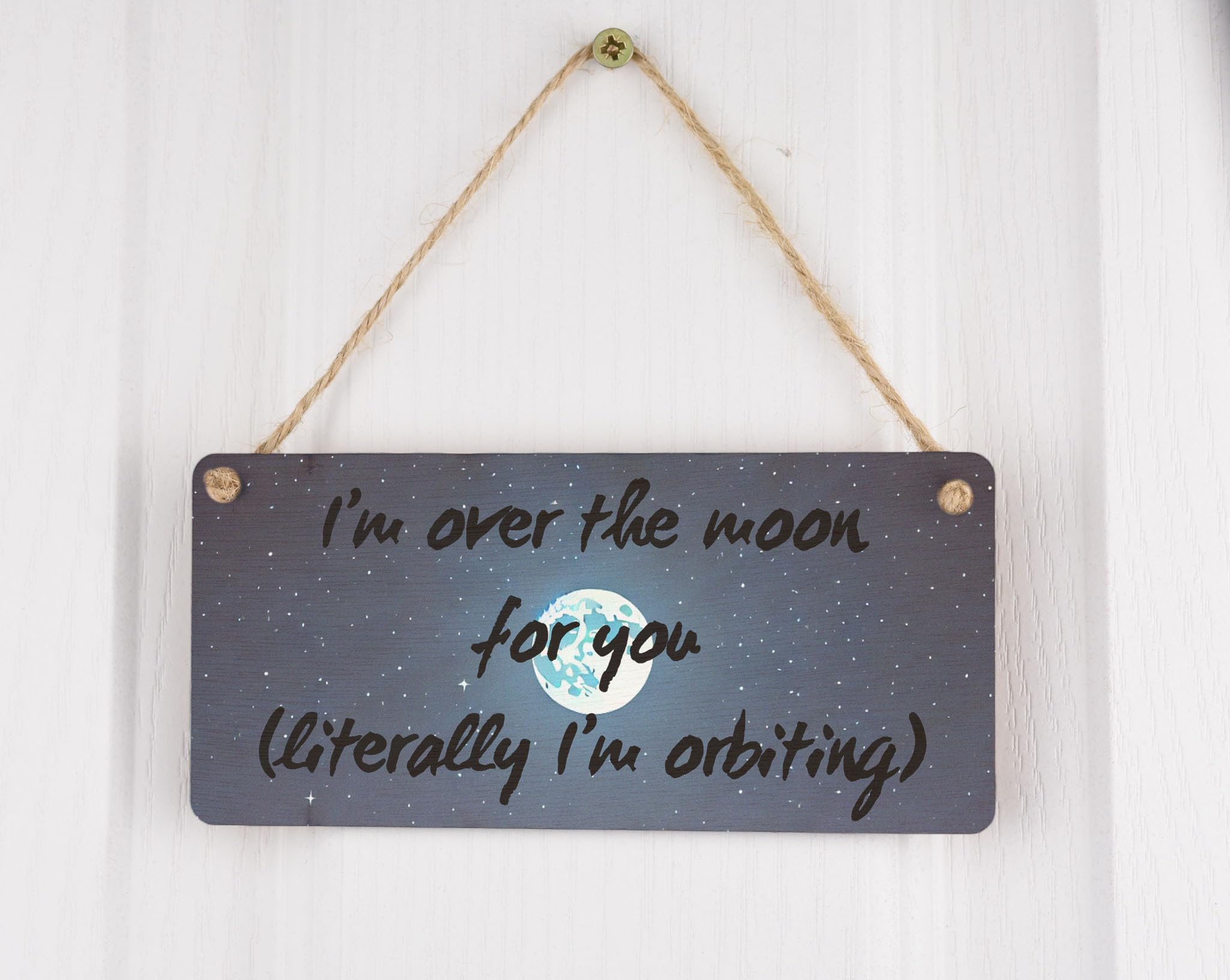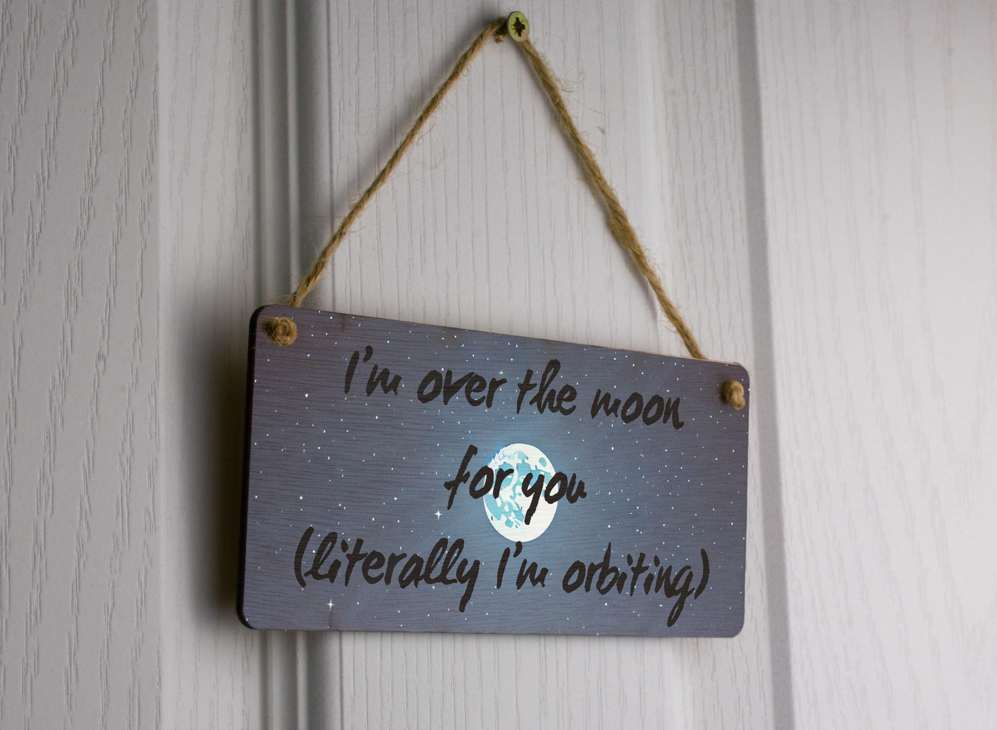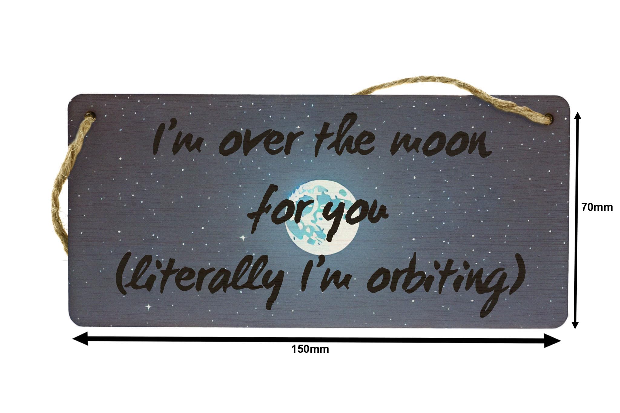 Transform your bedroom into a magical oasis with our 'Over the Moon Celestial Love Plywood Wall Art Sign'. This stunning piece features a night sky filled with twinkling stars and a brilliant full moon, creating a celestial theme that is perfect for anyone who loves all things space-inspired. The romantic design includes a love message that reads 'I'm over the moon for you, literally I'm orbiting', making it an inspirational addition to your decor. The whimsical sign is crafted from handcrafted laser-cut plywood, with a full-colour design that showcases blue tones reminiscent of the deep night sky. Whether you're looking for a decorative sign to hang in your own home or searching for a sentimental gift for a loved one, this astronomy-themed wall art is sure to impress. The UV-printed design is brought to life with AI-generated art, ensuring a quality finish that will last for years to come. Twine is included for easy hanging, making it a breeze to add a touch of magic to any room.