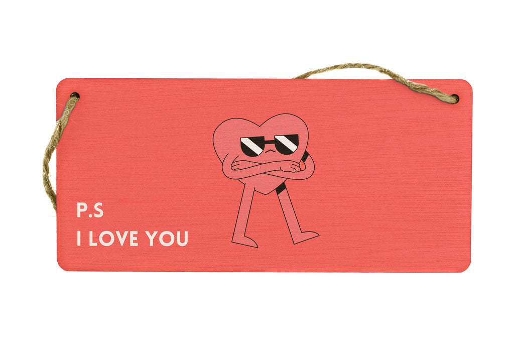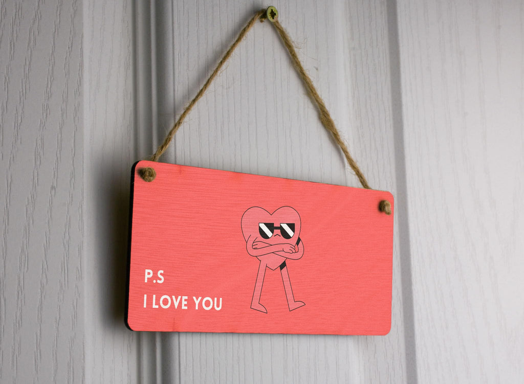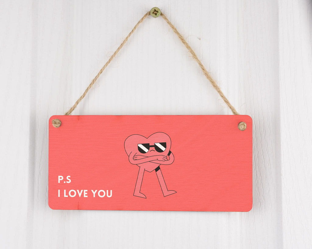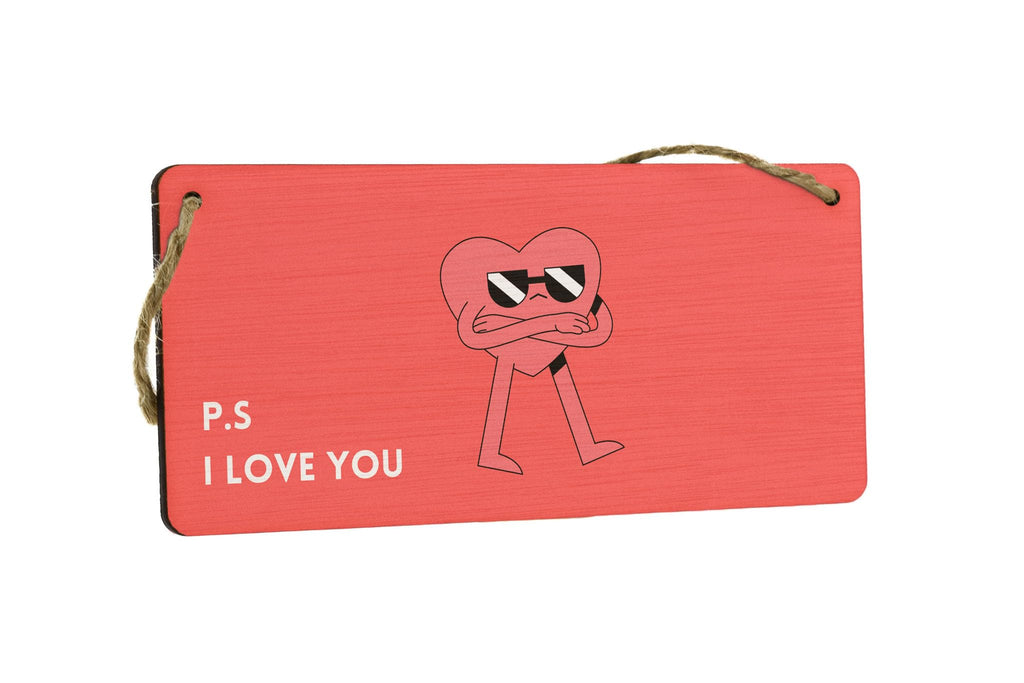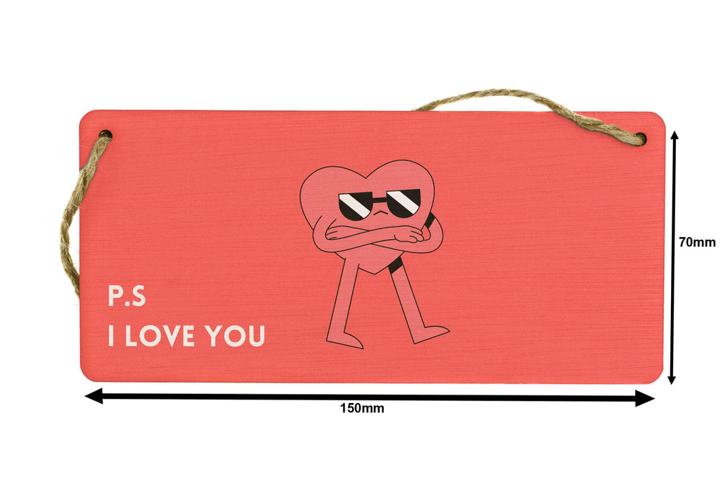 Add a touch of romance to your home decor with this charming plywood hanging sign that reads 'P.S. I Love You'. This novelty gift is perfect for your wife, husband, girlfriend or boyfriend, making it a thoughtful and heartfelt present for any occasion. The sign features a striking red background with crisp white writing, creating a bold contrast that will catch the eye in any room. The design includes a cute heart with sunglasses and arms crossed, adding a playful touch to the overall look. Whether you hang it in the living room, hallway, bedroom or any other space, this sign is sure to brighten up your home and remind your loved ones of your affection every day.