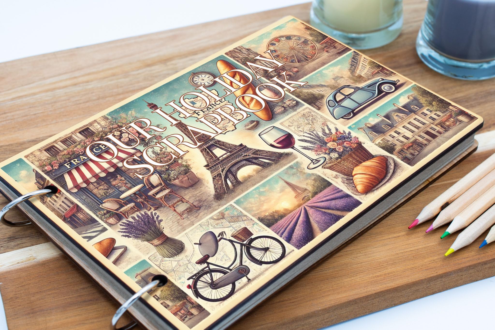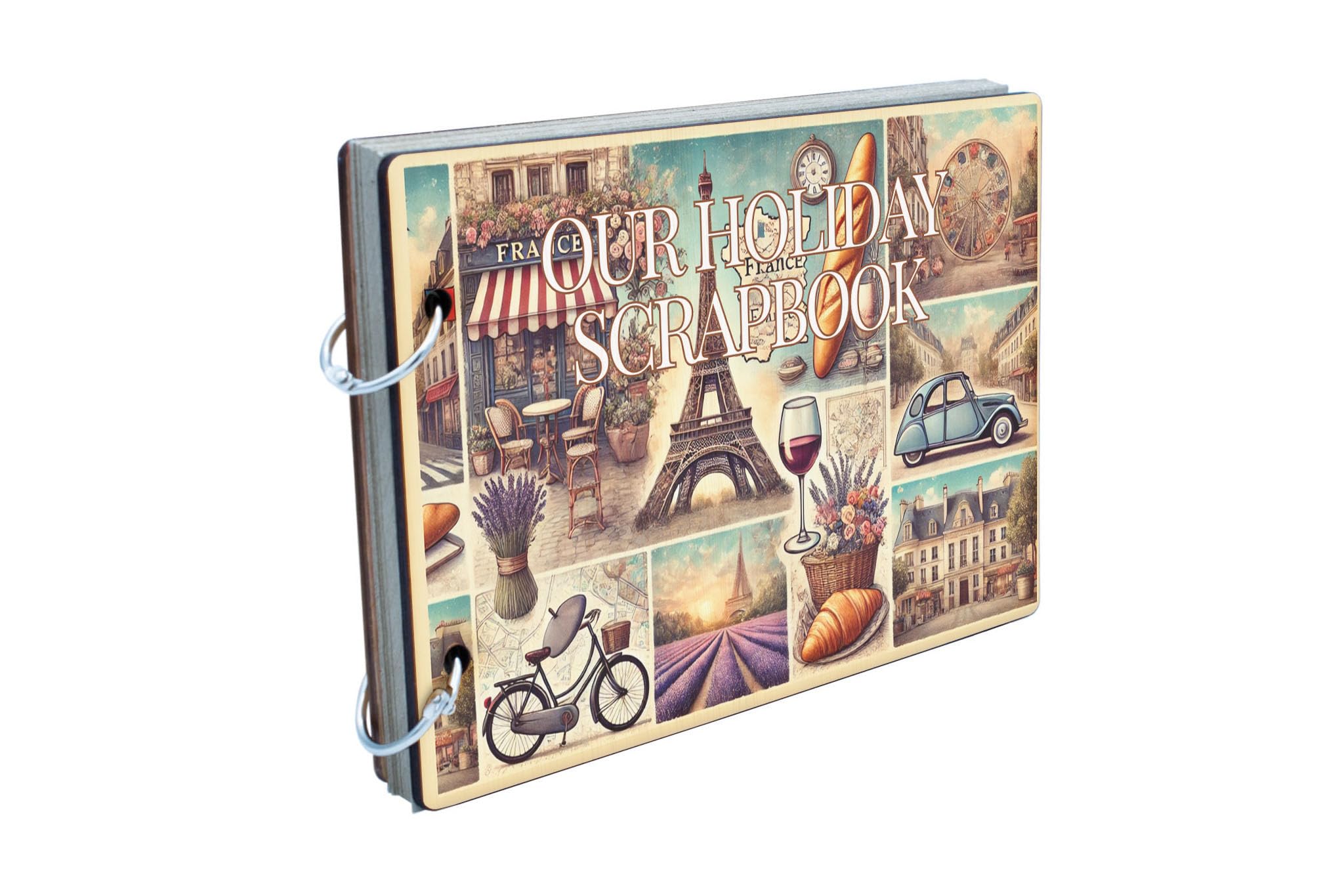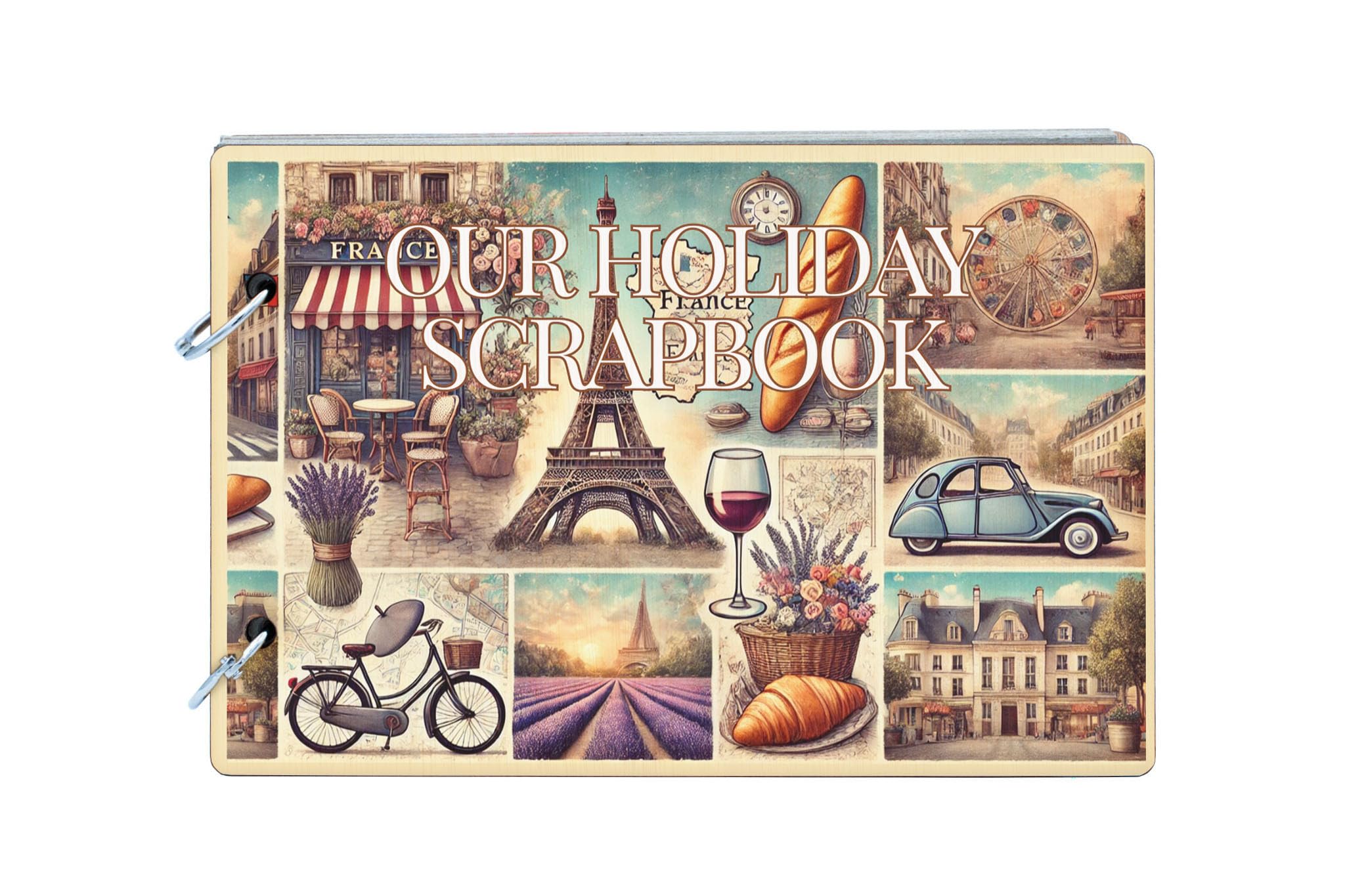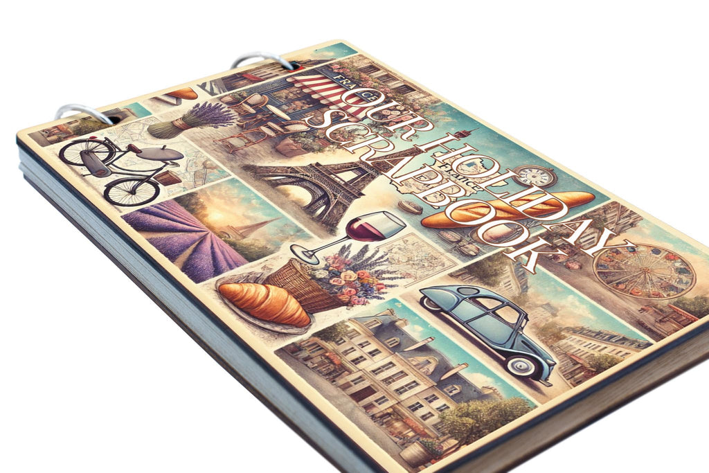 Capture your Parisian memories in this beautifully crafted travel keepsake, featuring a classic French style with a vintage charm. The wooden cover is adorned with AI-generated art, giving it a unique and artistic touch. With 25 recycled pages, this memento reads 'Our Holiday Scrapbook' and is the perfect way to reminisce about your romantic getaway to the City of Love. From baguettes and wine to cosy caf? scenes, lavender fields to scenic streets, this journal is a celebration of French culture and European adventure. The full colour front cover showcases a colourful France-inspired collage, making it a stylish addition to your collection of travel memories.