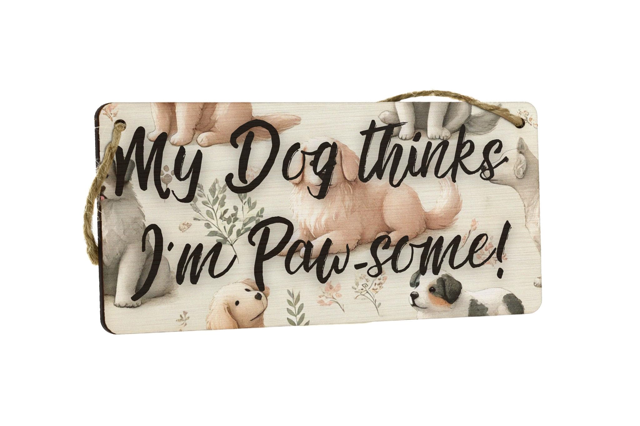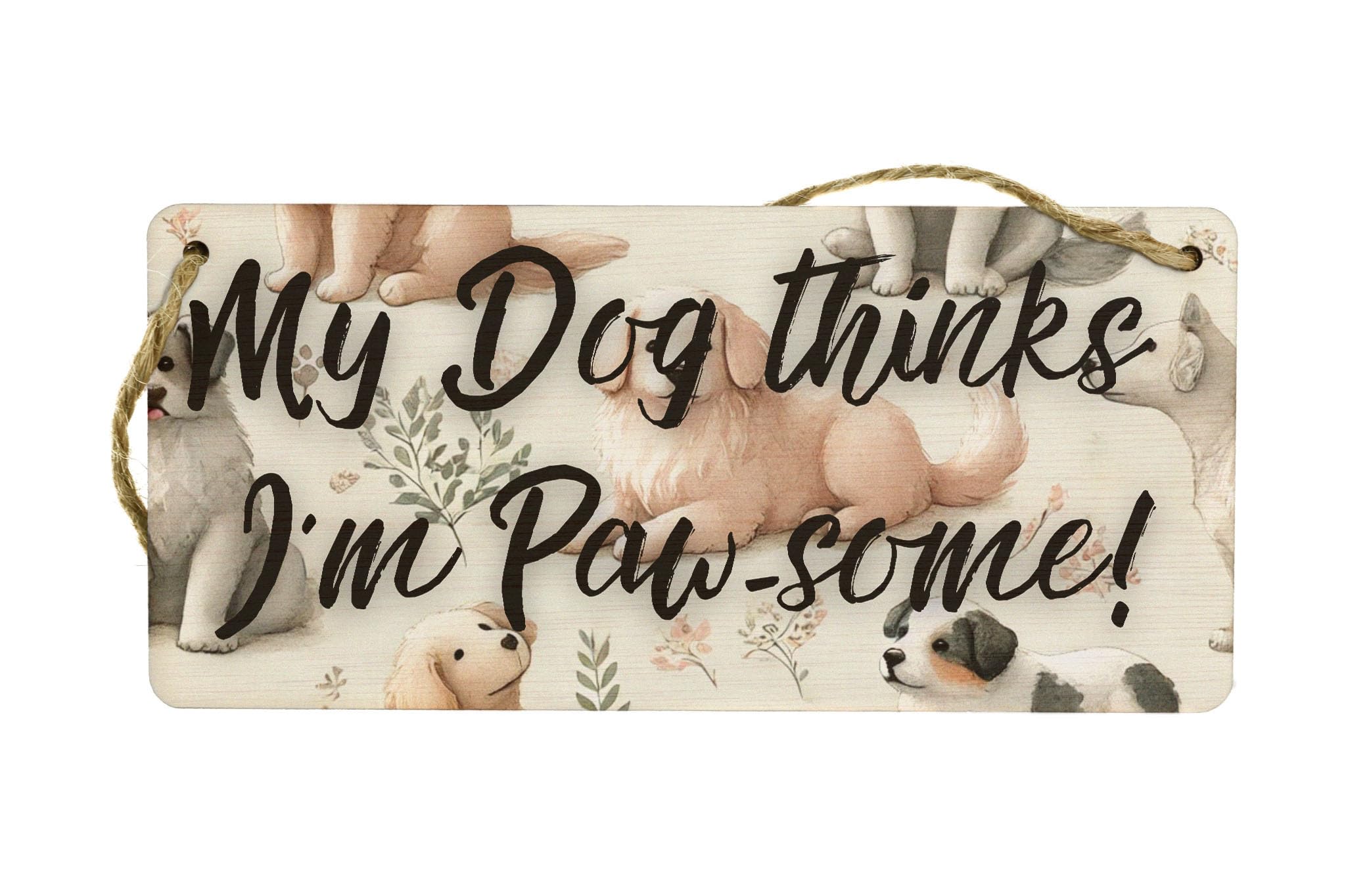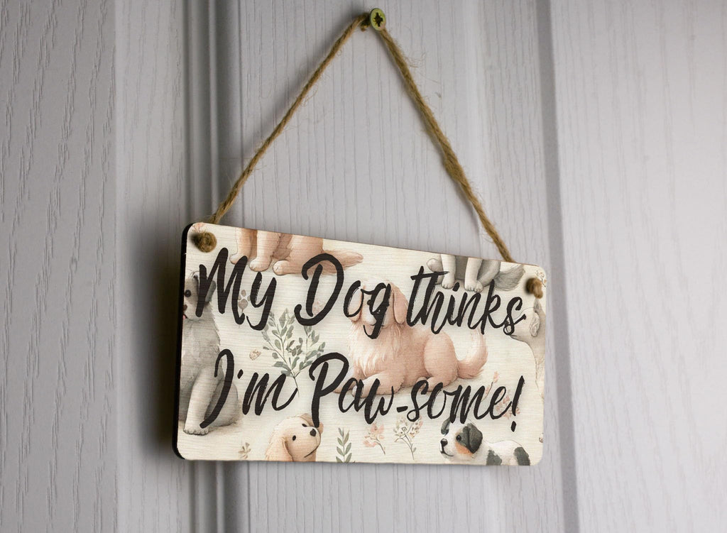 Add a touch of paw-some style to your home decor with our Paw-some Puppies Watercolour Plywood Hanging Sign. This charming sign features a full-colour design showcasing a watercolour style dog pattern that is sure to appeal to animal lovers and pet owners alike. The playful dogs and cute puppies depicted on the sign add a whimsical touch to any room, while the warm tones and rustic style make it a perfect addition to any home. The sign reads 'My dog thinks I'm pawsome', making it a humorous and heartwarming gift for dog owners. Handcrafted from laser-cut plywood, this hanging sign is both durable and unique. The UV printed design ensures that the colours remain vibrant over time, while the included twine makes it easy to hang on any wall. Whether you're a dog lover yourself or know someone who is, this Paw-some Puppies Watercolour Plywood Hanging Sign is sure to bring a smile to your face every time you see it.