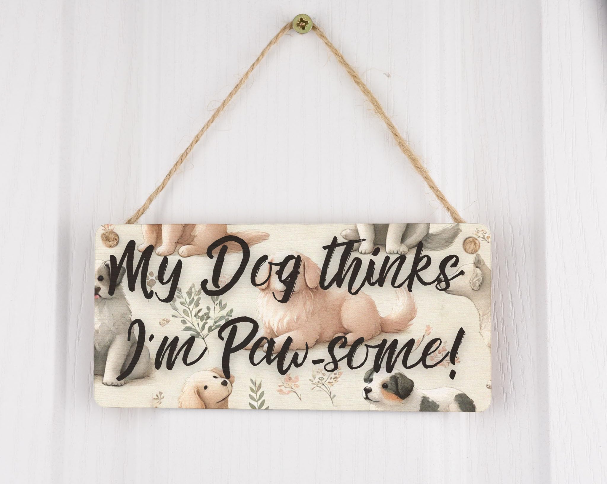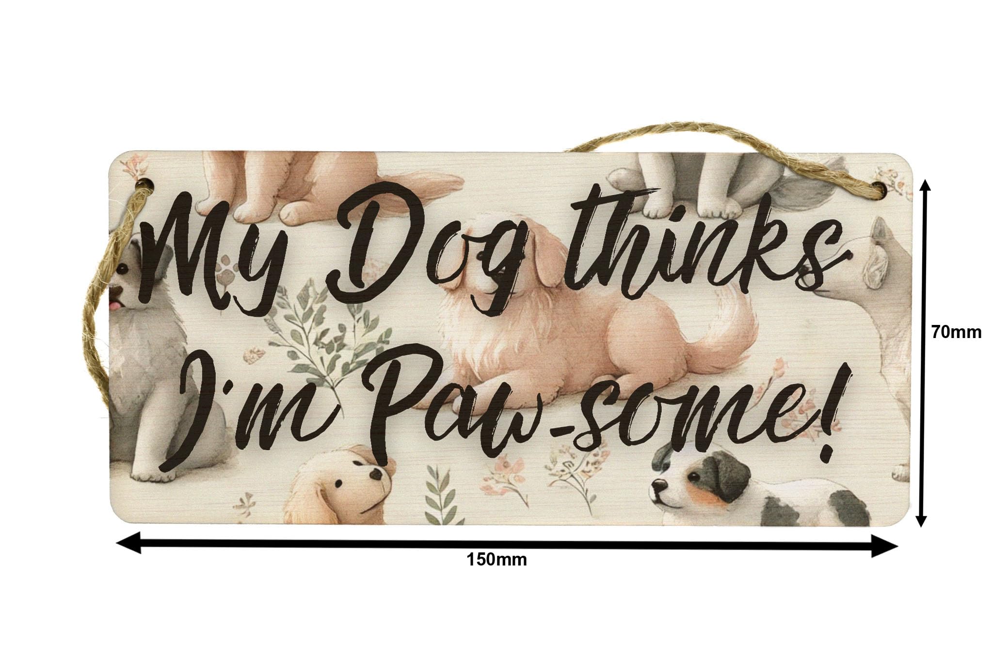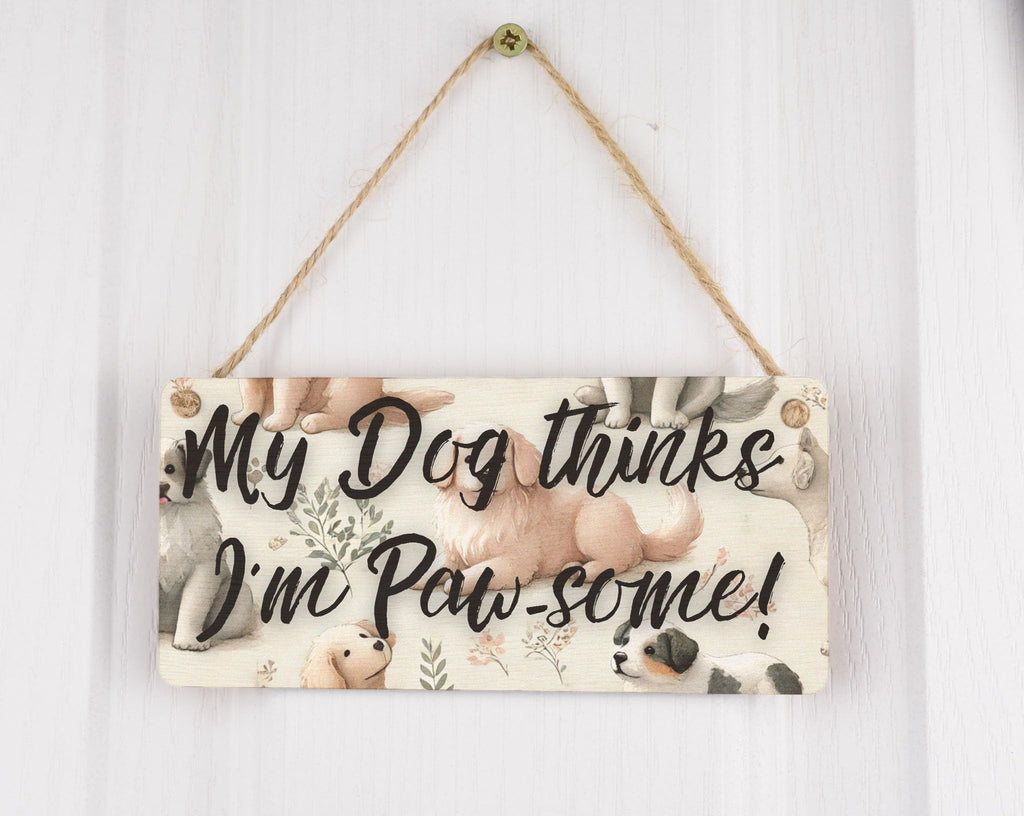 Add a touch of paw-some style to your home decor with our Paw-some Puppies Watercolour Plywood Hanging Sign. This charming sign features a full-colour design showcasing a watercolour style dog pattern that is sure to appeal to animal lovers and pet owners alike. The playful dogs and cute puppies depicted on the sign add a whimsical touch to any room, while the warm tones and rustic style make it a perfect addition to any home. The sign reads 'My dog thinks I'm pawsome', making it a humorous and heartwarming gift for dog owners. Handcrafted from laser-cut plywood, this hanging sign is both durable and unique. The UV printed design ensures that the colours remain vibrant over time, while the included twine makes it easy to hang on any wall. Whether you're a dog lover yourself or know someone who is, this Paw-some Puppies Watercolour Plywood Hanging Sign is sure to bring a smile to your face every time you see it.