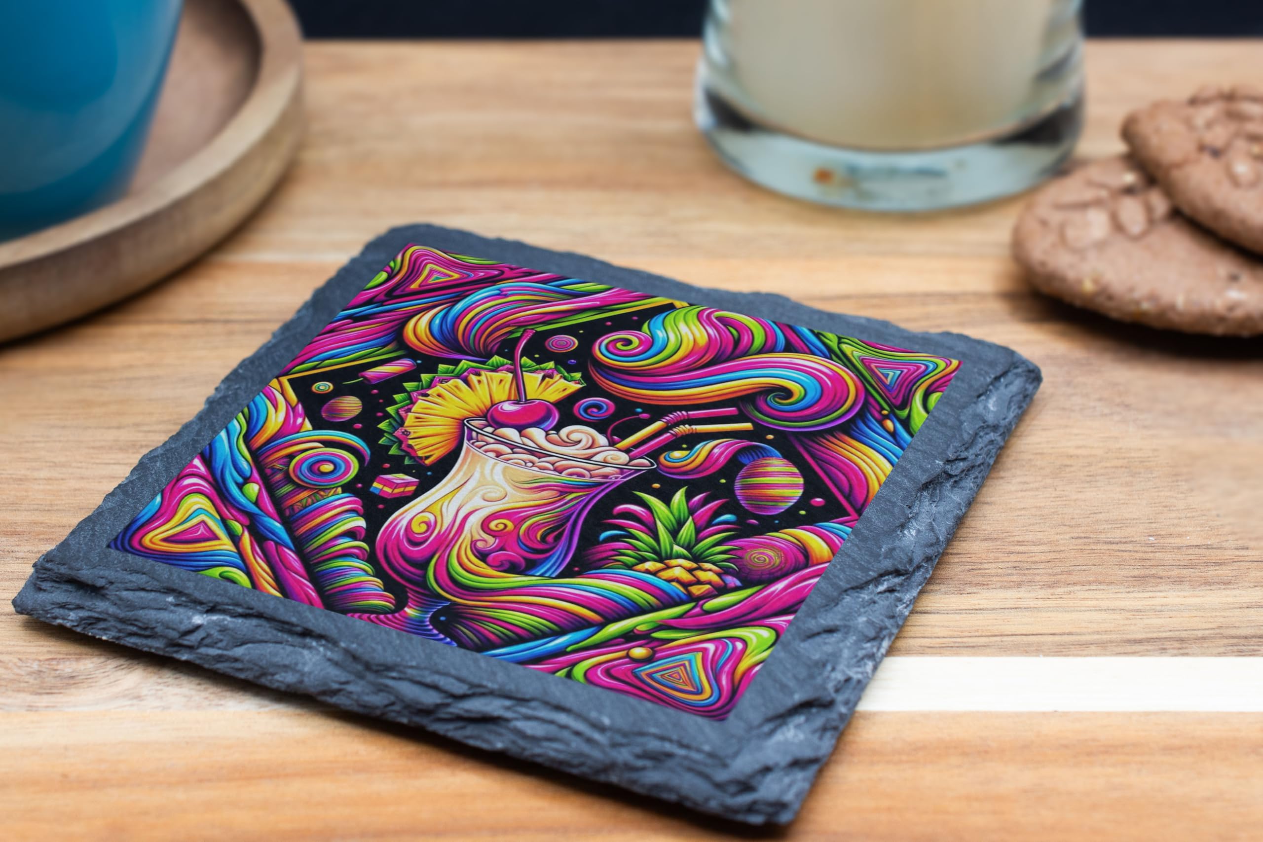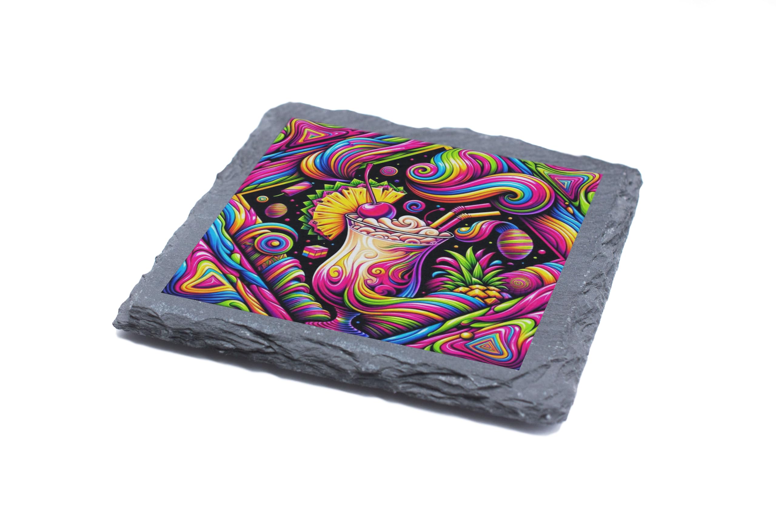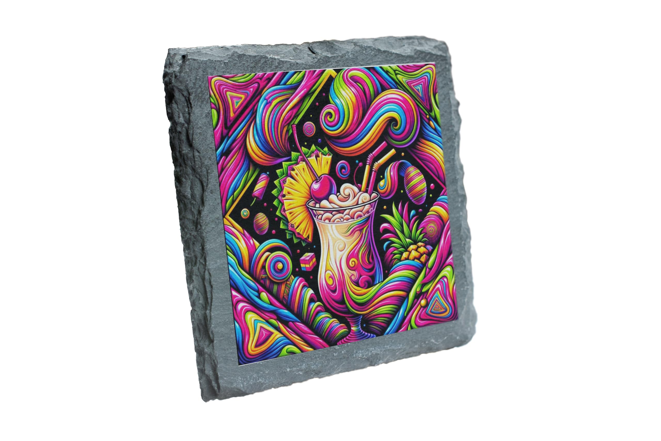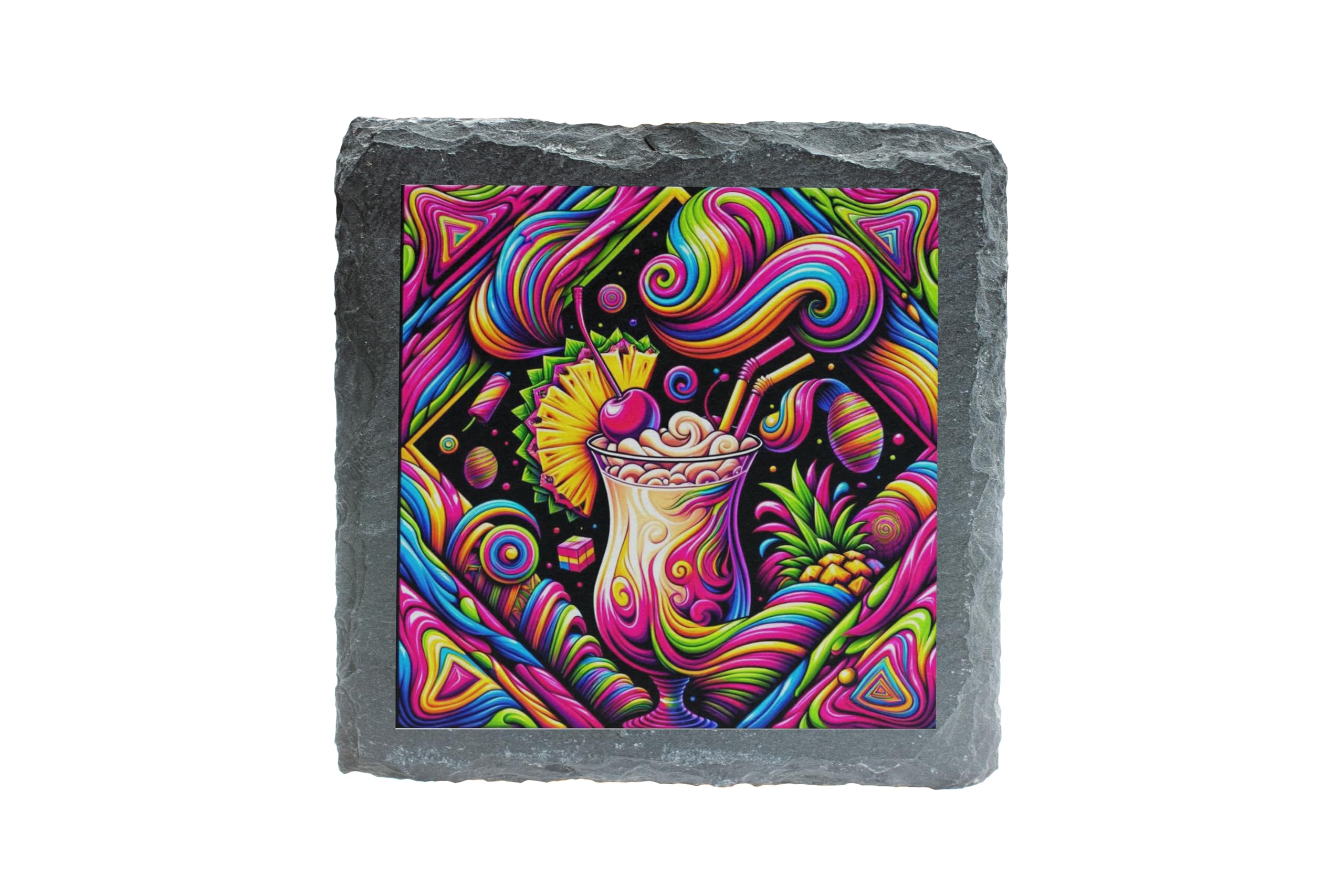 Dive into a kaleidoscope of colors with the Pi?a Delic Slate Coaster, a psychedelic take on the classic Pi?a Colada. This vibrant design blends tropical vibes with bold artistic expression, making it the perfect addition to any lively setting. Crafted from premium slate, this coaster offers durability and heat resistance, ensuring your surfaces are protected from spills and scratches. Whether you're sipping a cocktail, hosting a party, or simply looking to enhance your decor, this coaster is as functional as it is stylish. A fantastic gift for cocktail lovers or fans of unique art, the Pi?a Delic coaster adds a splash of creativity to any home. Elevate your entertaining game and embrace the tropical allure with a twist!