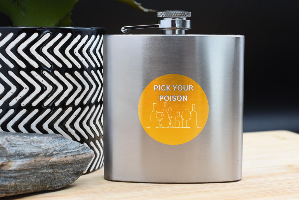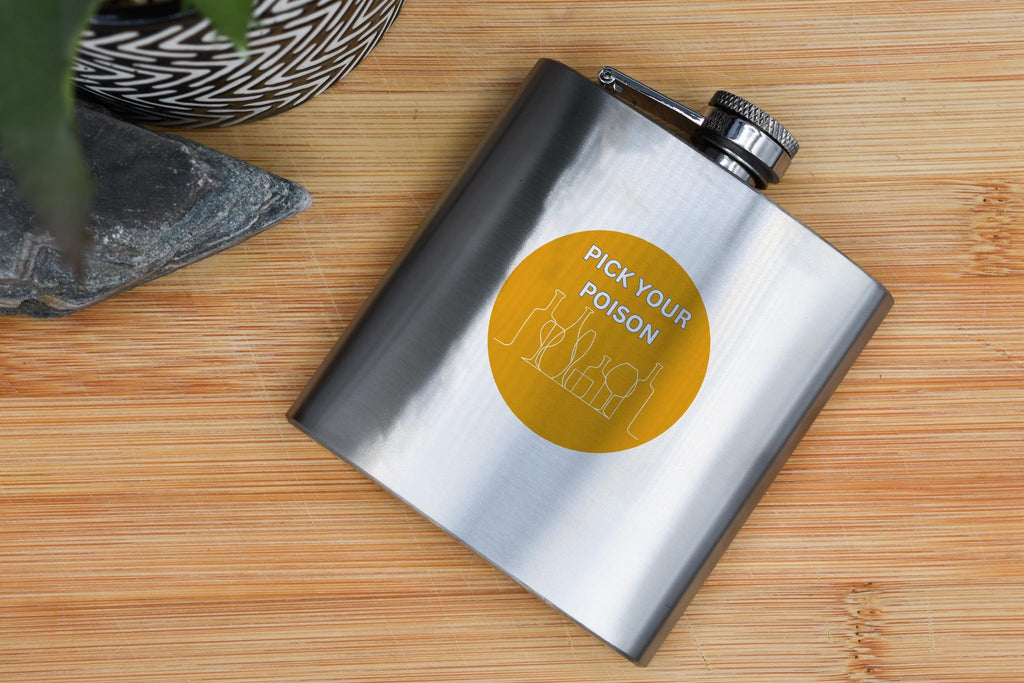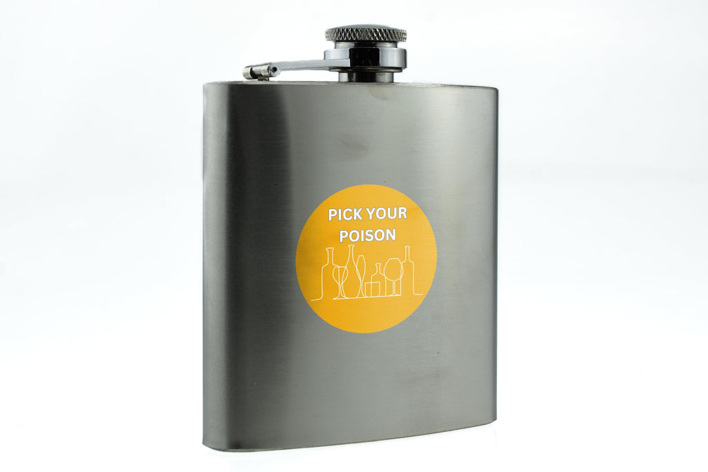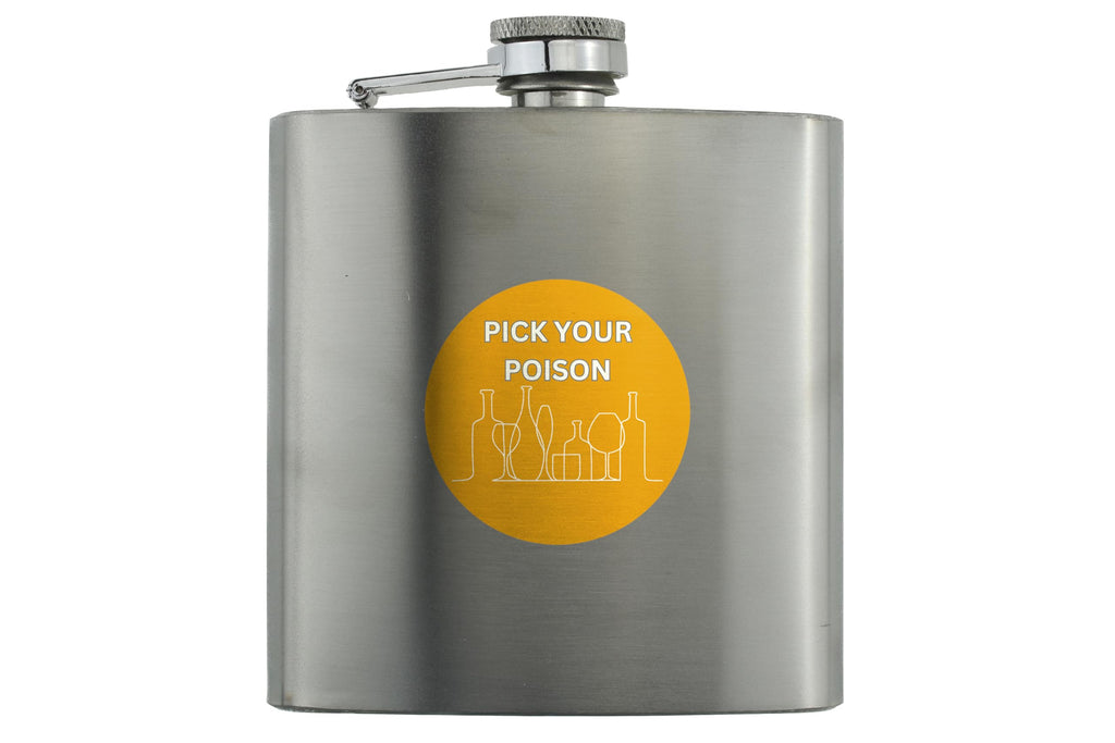 This Pick Your Poison Hip Flask Gift is the perfect funny gift idea for him or her! Made from quality stainless steel, this hip flask features a full colour design that reads 'Pick Your Poison'. Whether they're a vodka lover or enjoy other spirits, this hip flask is sure to bring a smile to their face. It's a great gift idea for birthdays, anniversaries, or even Christmas. This hip flask is designed for hand wash only, ensuring its longevity and maintaining the vibrant colours of the design.