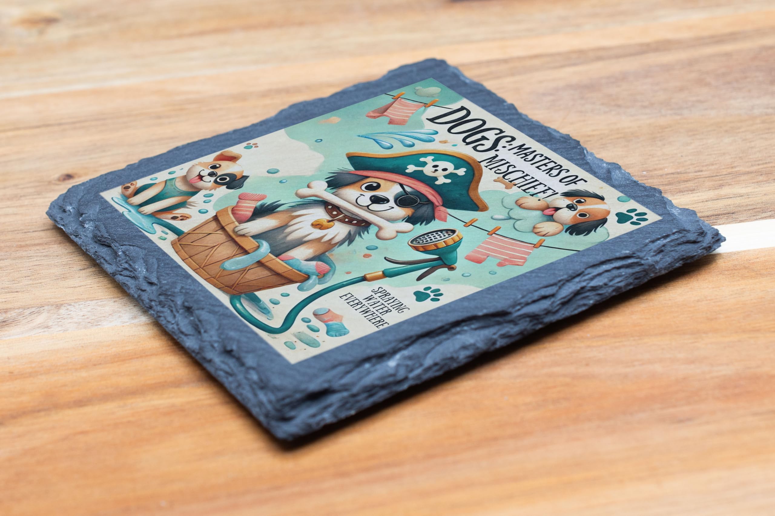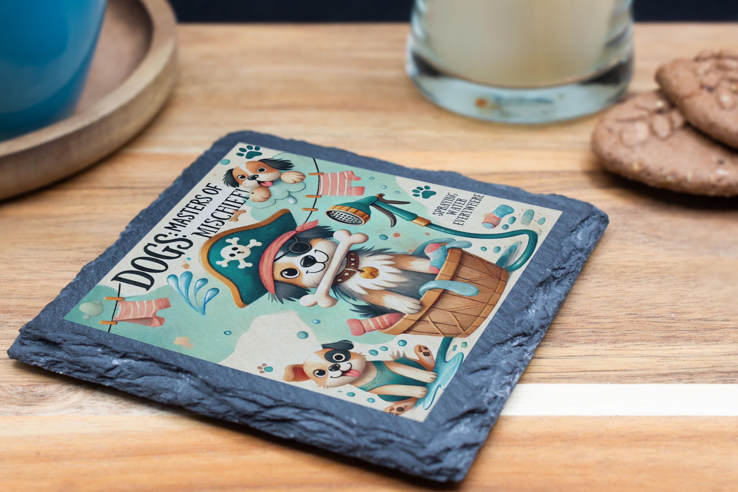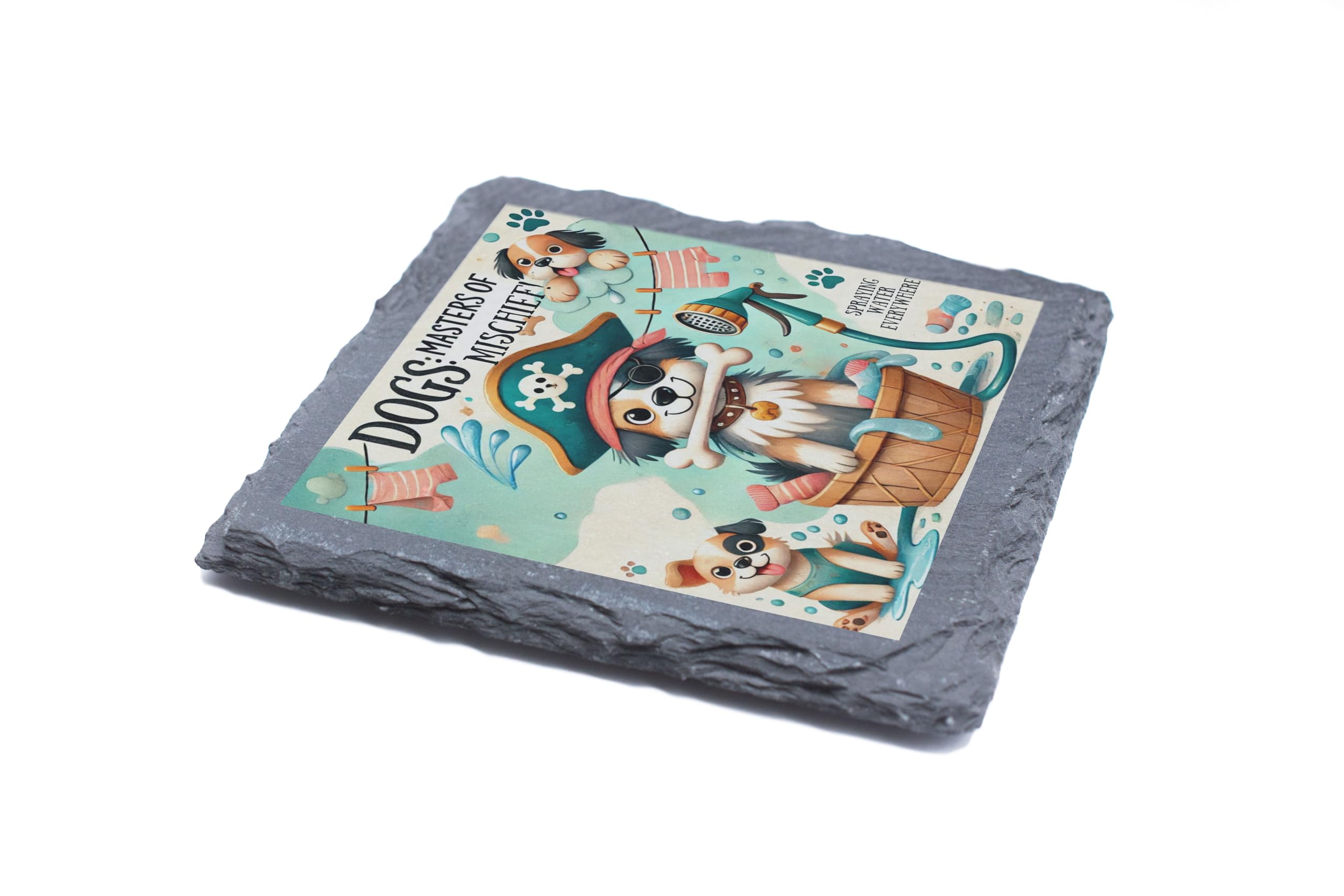 Embark on a sea of mischief with this 'Masters of Mischief' pirate dog-themed slate coaster. Featuring a charming illustration of playful pirate pups, this coaster is both fun and functional. Crafted from premium natural slate, it offers a durable and water-resistant surface, making it perfect for everyday use or as a decorative piece. Whether you're enjoying a beverage or hosting a gathering, this coaster is sure to add personality and charm to any setting. A perfect gift for dog lovers or a playful addition to your own decor!