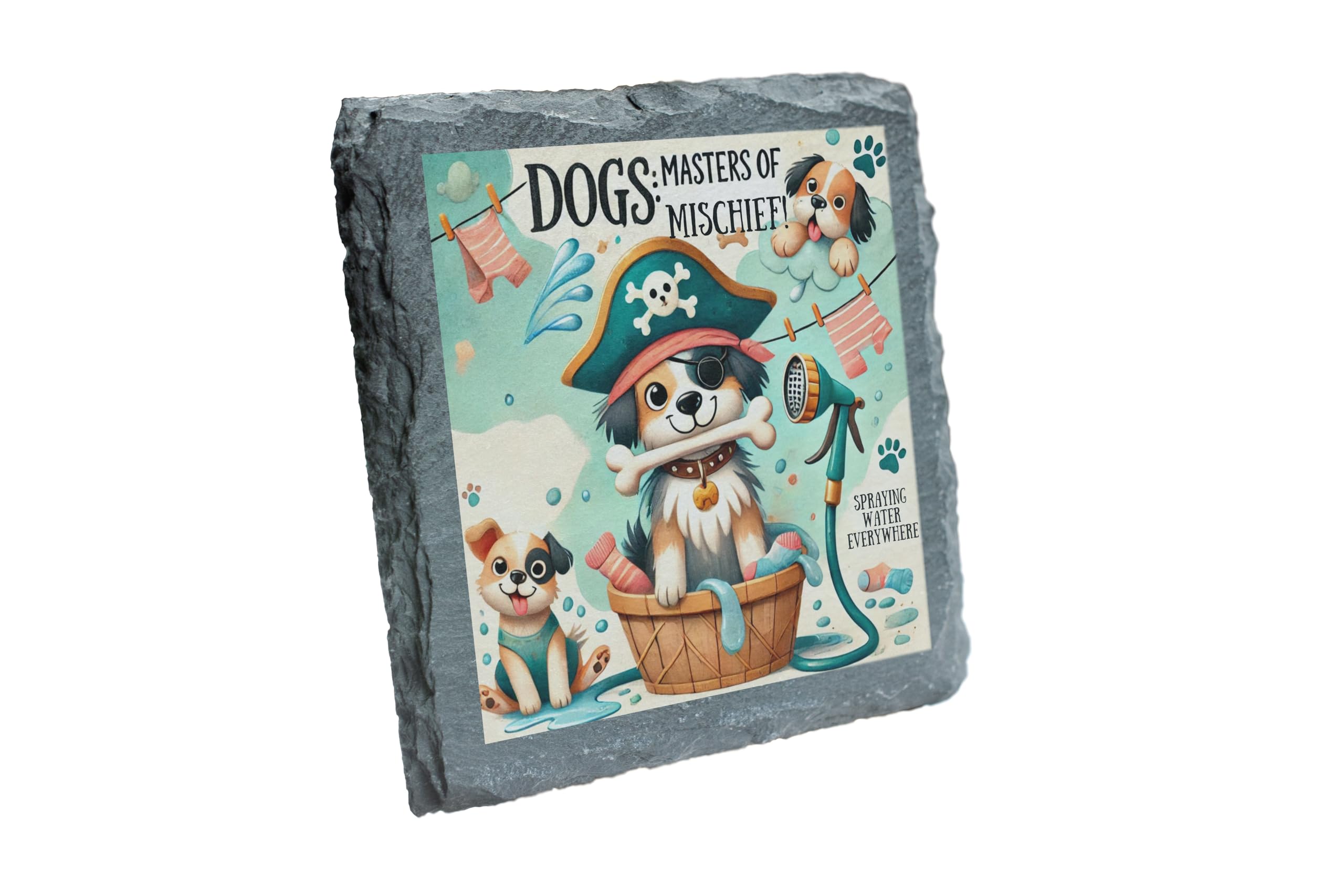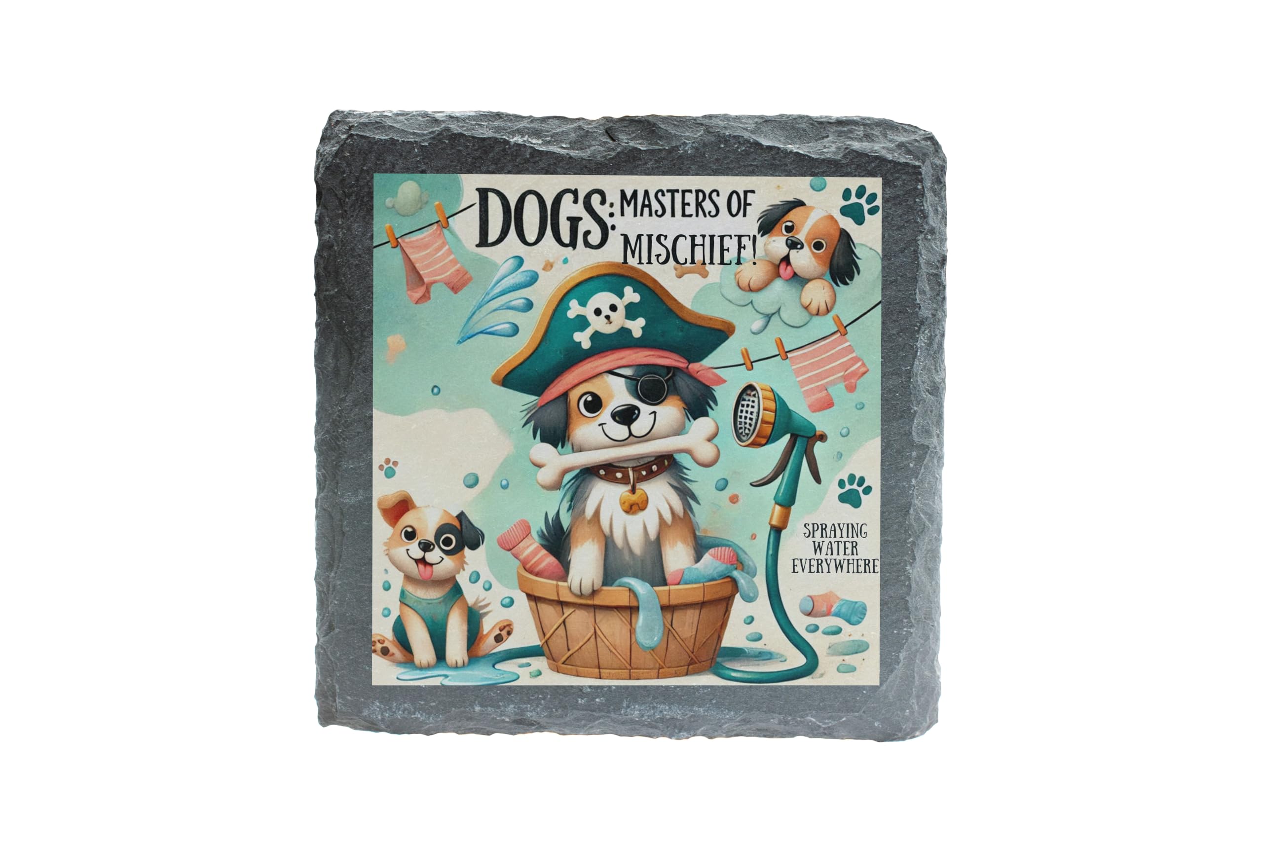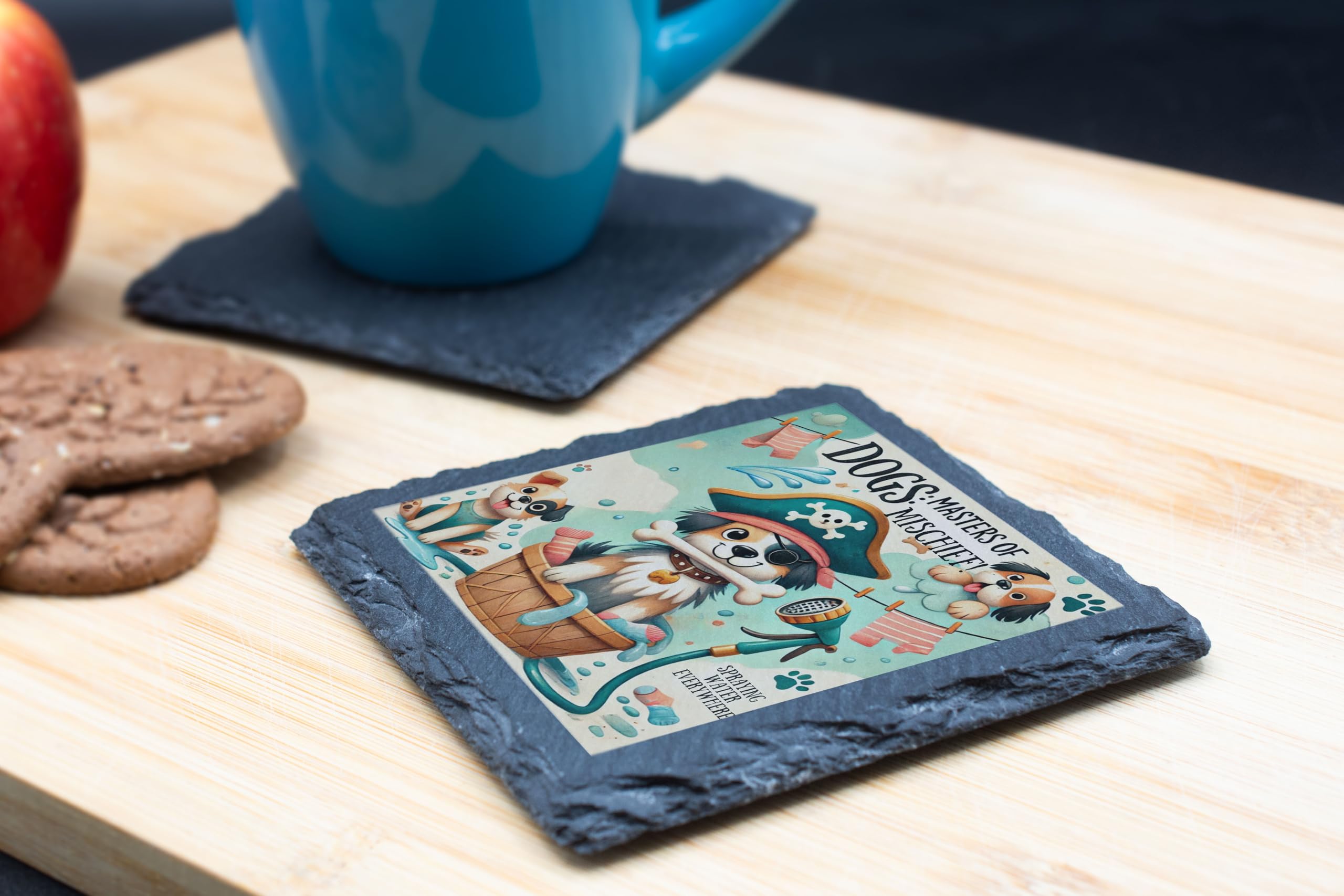 Embark on a sea of mischief with this 'Masters of Mischief' pirate dog-themed slate coaster. Featuring a charming illustration of playful pirate pups, this coaster is both fun and functional. Crafted from premium natural slate, it offers a durable and water-resistant surface, making it perfect for everyday use or as a decorative piece. Whether you're enjoying a beverage or hosting a gathering, this coaster is sure to add personality and charm to any setting. A perfect gift for dog lovers or a playful addition to your own decor!