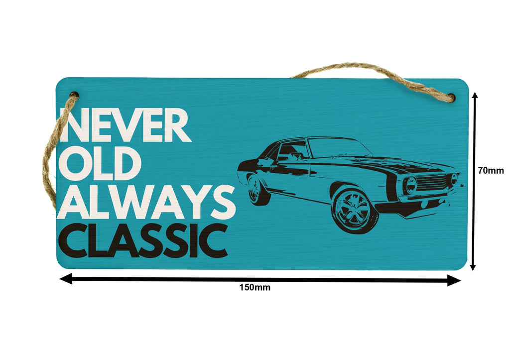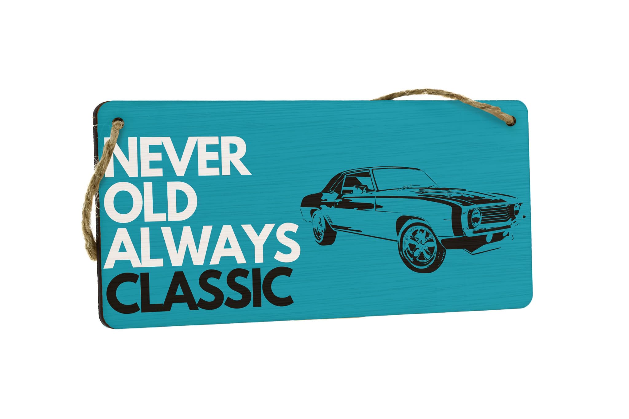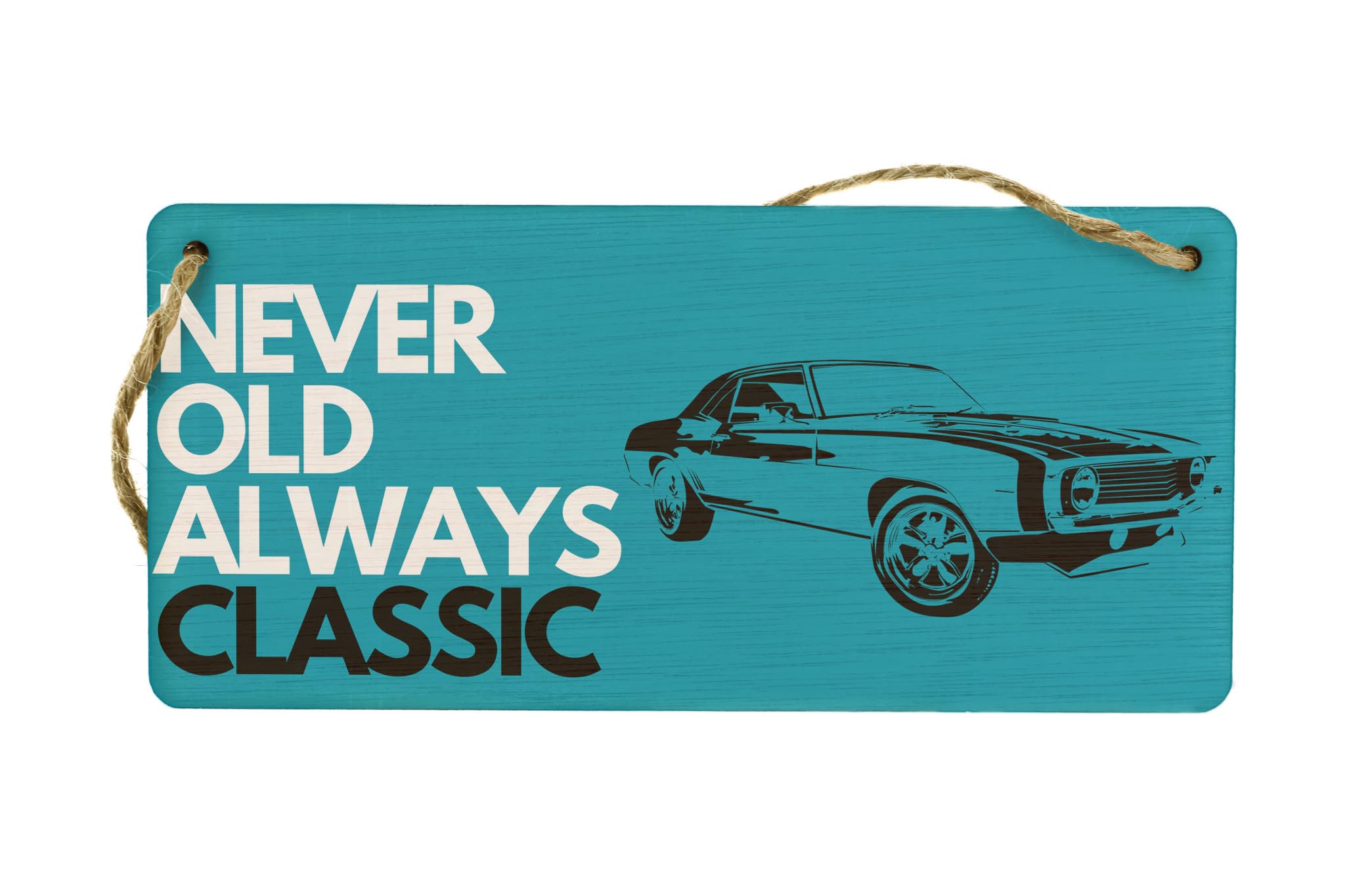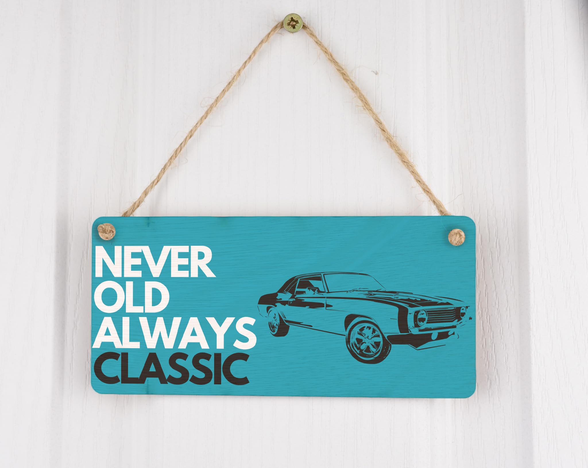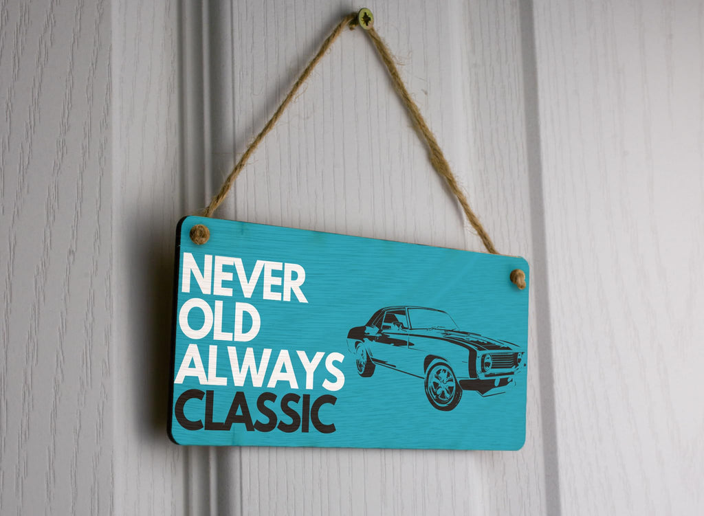 This Plywood Hanging Sign for Home Decor is the perfect addition to any classic car lover's collection. Made from quality plywood, this sign is durable and built to last. Its full colour design features a timeless image of classic cars, making it a truly unique and eye-catching piece. With the words 'Never Old, Always Classic' beautifully displayed, this sign is a great novelty gift for car lovers, couples, grandparents, husband, wife, girlfriend, and boyfriend. Hang it in the living room, bedroom, or garage for a touch of vintage charm. Whether you're looking to add a personal touch to your own home decor or searching for a thoughtful gift, this Classic Cars Hanging Sign is sure to please.