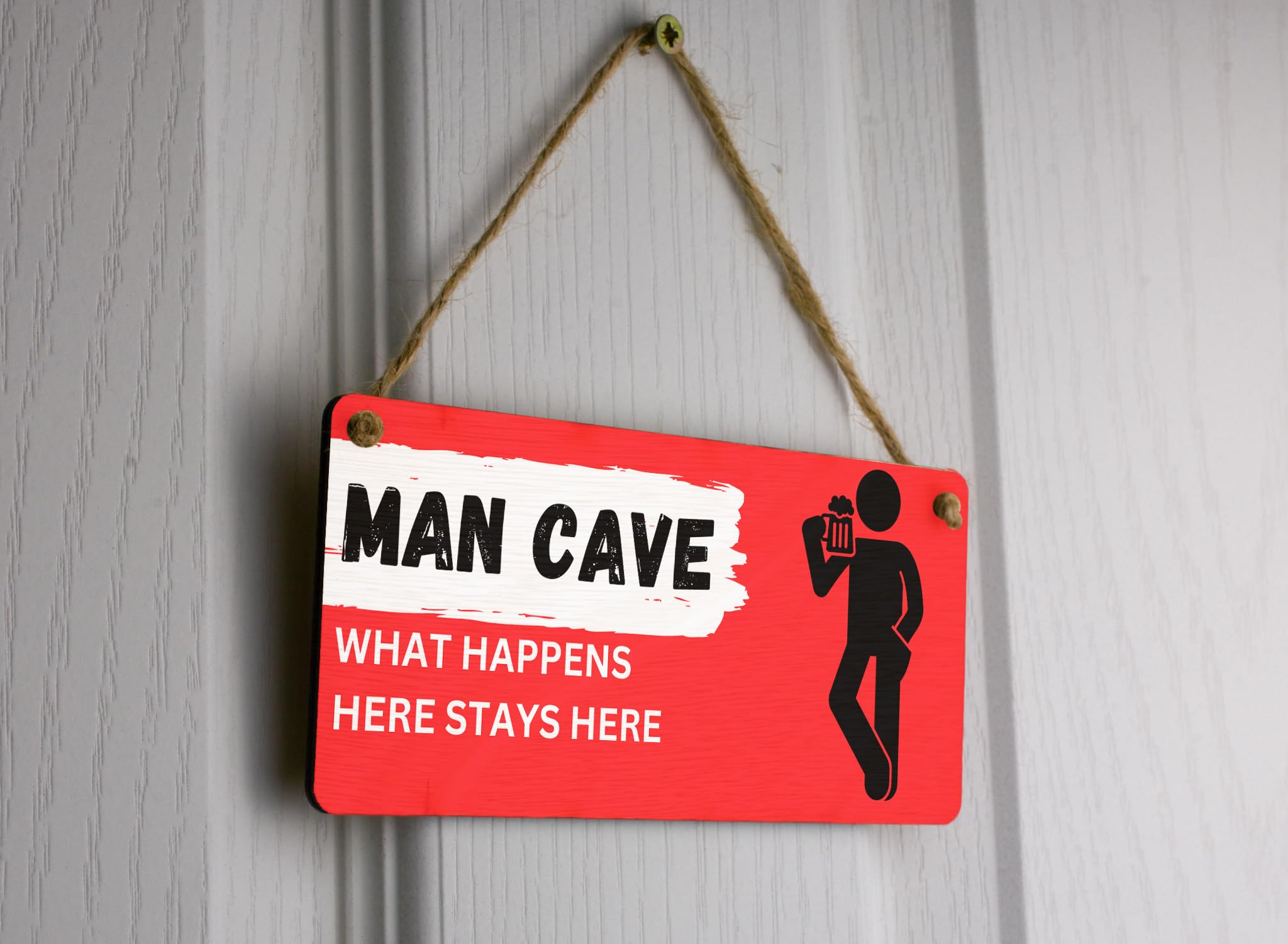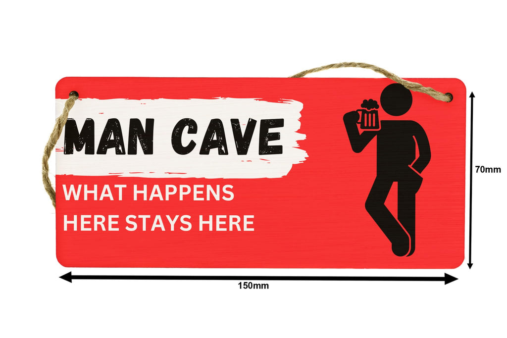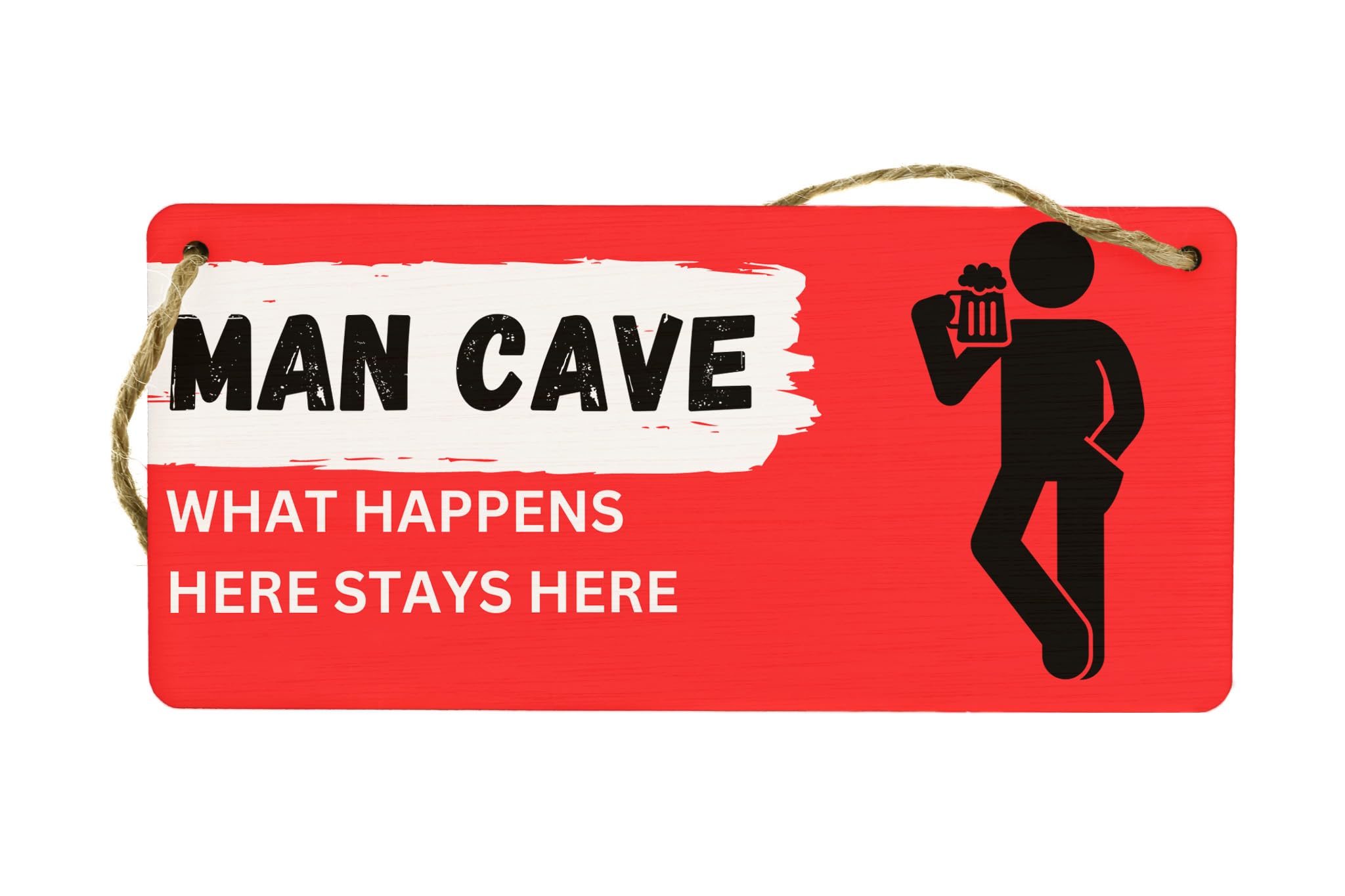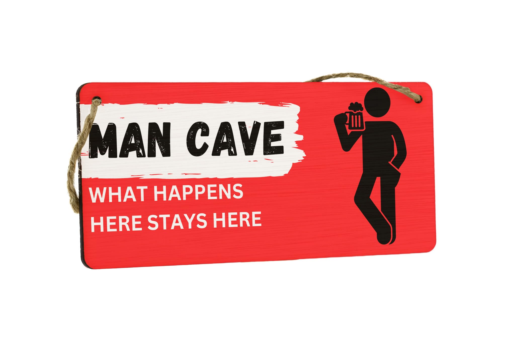 - Reads 'Man Cave: What Happens Here Stays Here' for a fun and cheeky statement