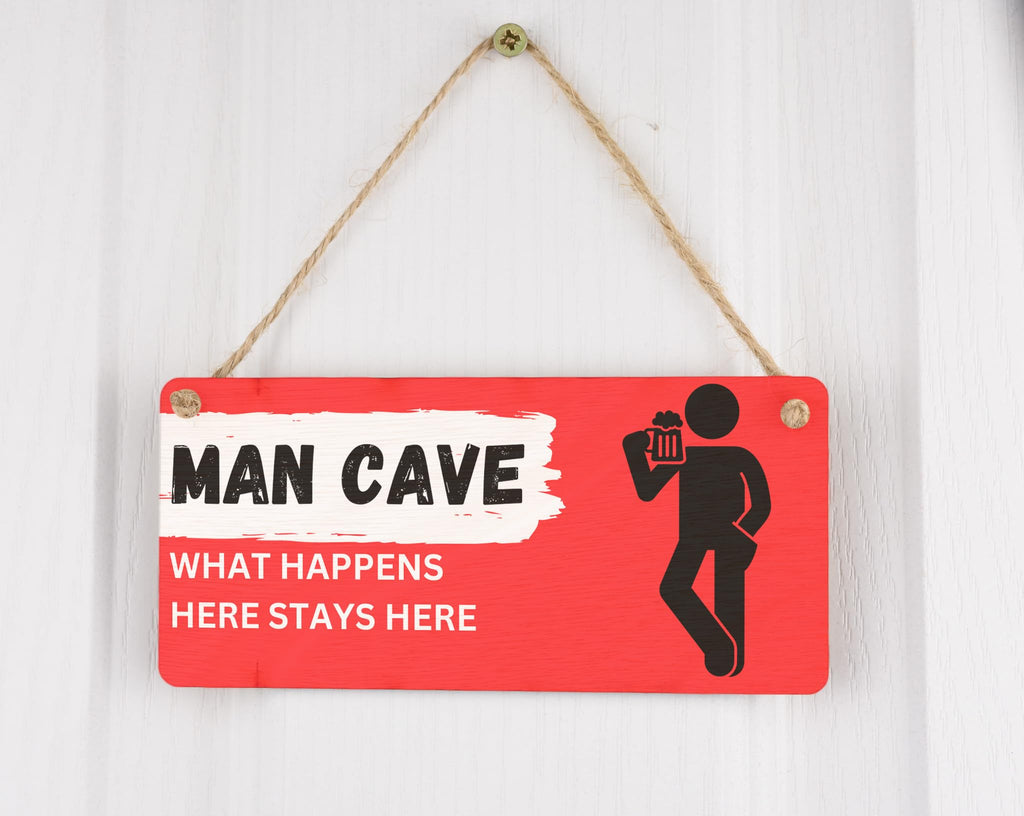 Add a touch of humour to your man cave with this Full Colour Design Plywood Hanging Sign. Whether you're looking for a gift for your dad, husband, boyfriend, or grandad, this novelty sign is sure to bring a smile to their face. Made from quality plywood, this hanging sign is durable and designed to last. The sign features a bold and vibrant full colour design that will catch everyone's attention. With the words 'Man Cave: What Happens Here Stays Here', it's the perfect addition to any man cave or home decor. Order yours today and give the special man in your life a funny and unique gift that they'll cherish.