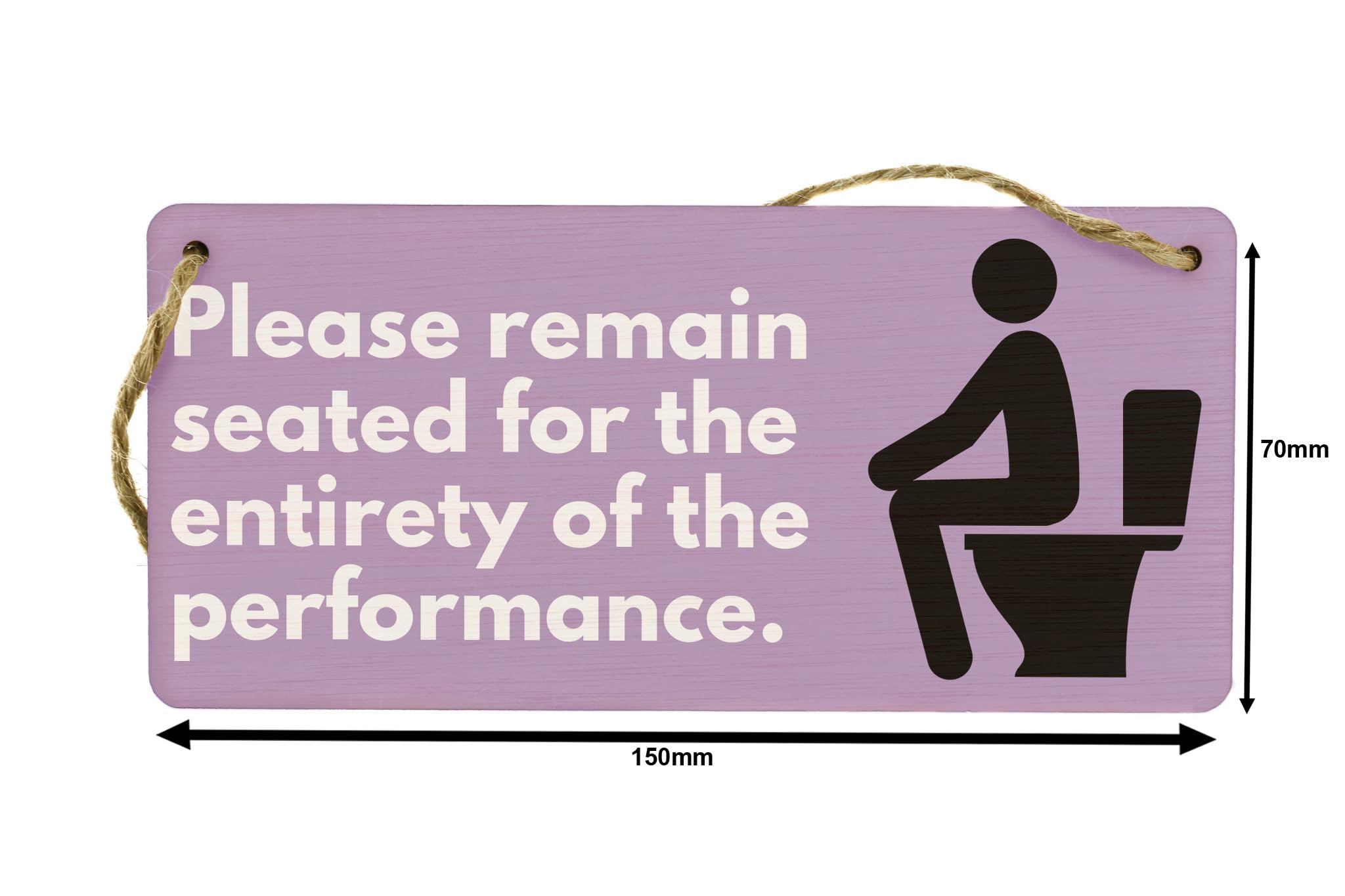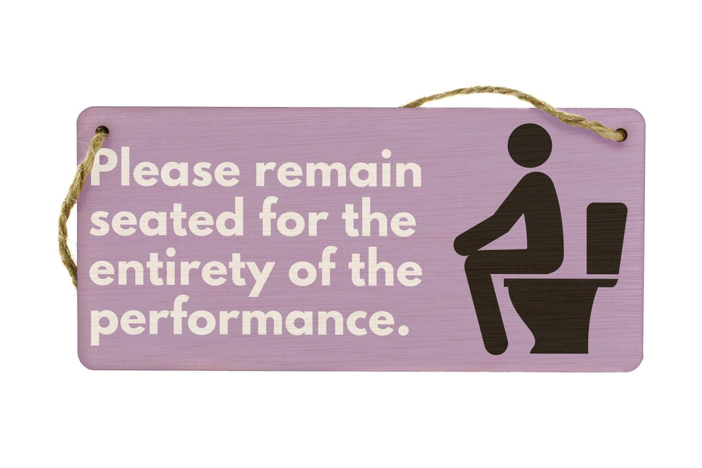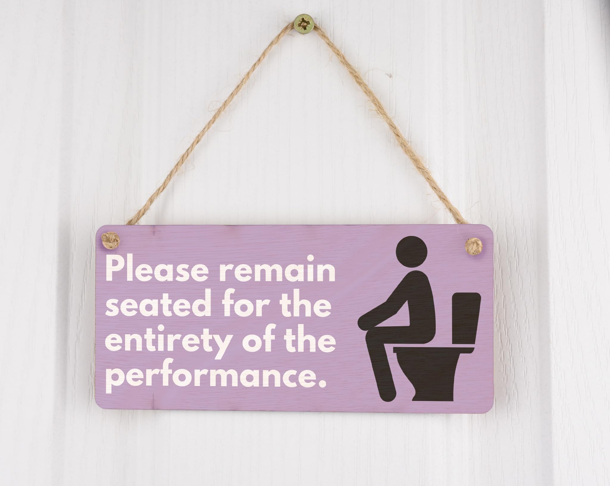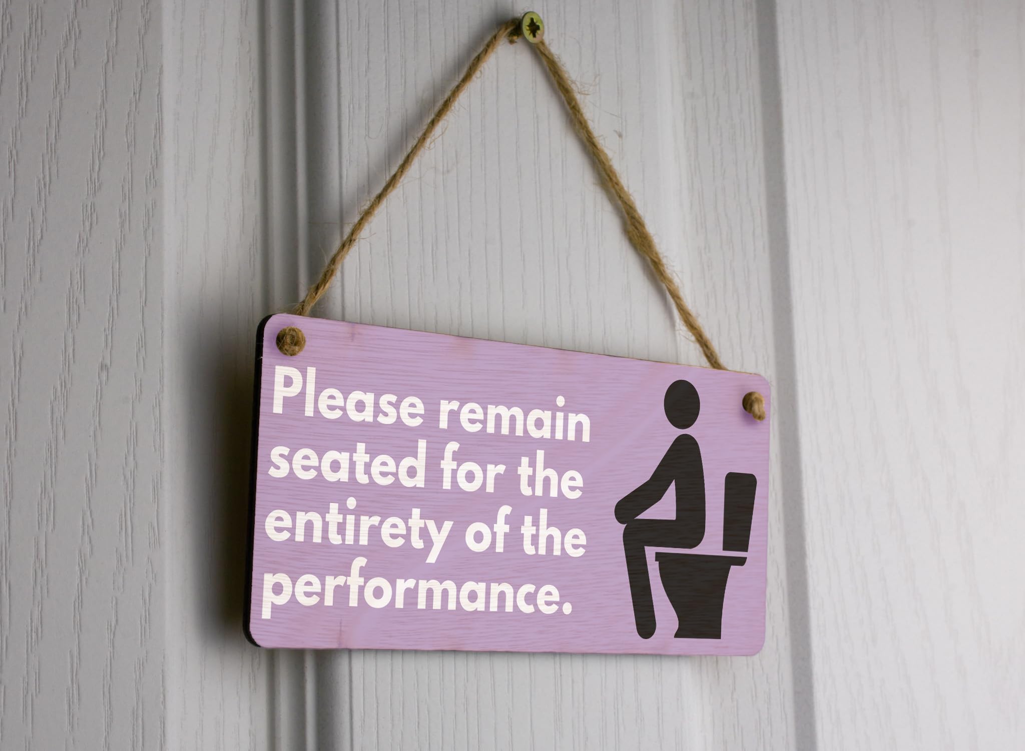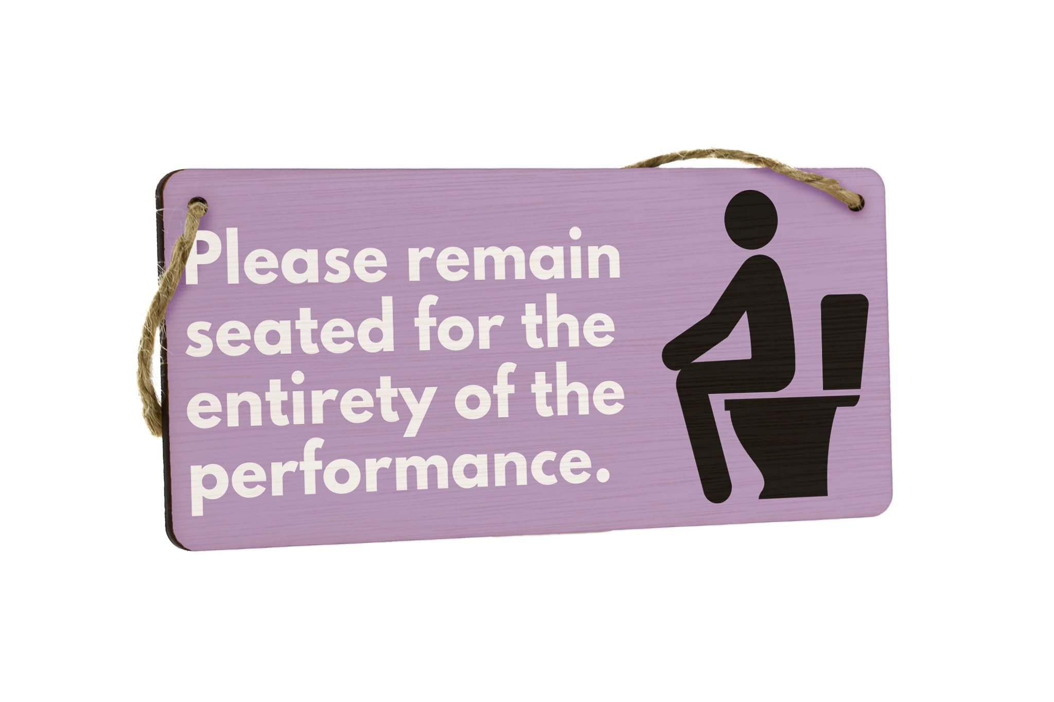 Add some whimsical humour to your bathroom decor with this Full Colour Plywood Hanging Sign. Made from quality plywood, this sign features a funny and witty message that is sure to add a touch of laughter to any bathroom environment. Whether you're looking for a novelty gift, a funny gift for your spouse or partner, or just want to spruce up your home decor with a touch of bathroom humour, this hanging sign is the perfect choice. The sign reads 'Please Remain Seated for the Entirety of the Performance', making it a humorous reminder for everyone to take their time in the bathroom. With its eye-catching design and durable construction, this sign is guaranteed to bring a smile to your face and add a unique charm to your bathroom space.