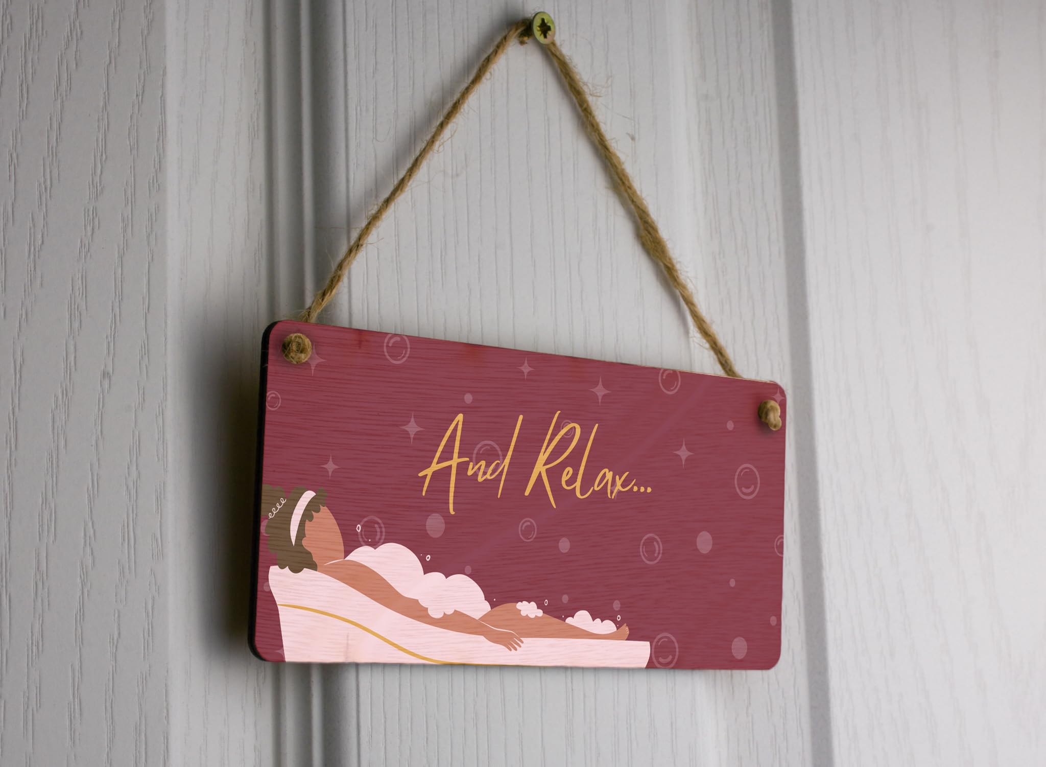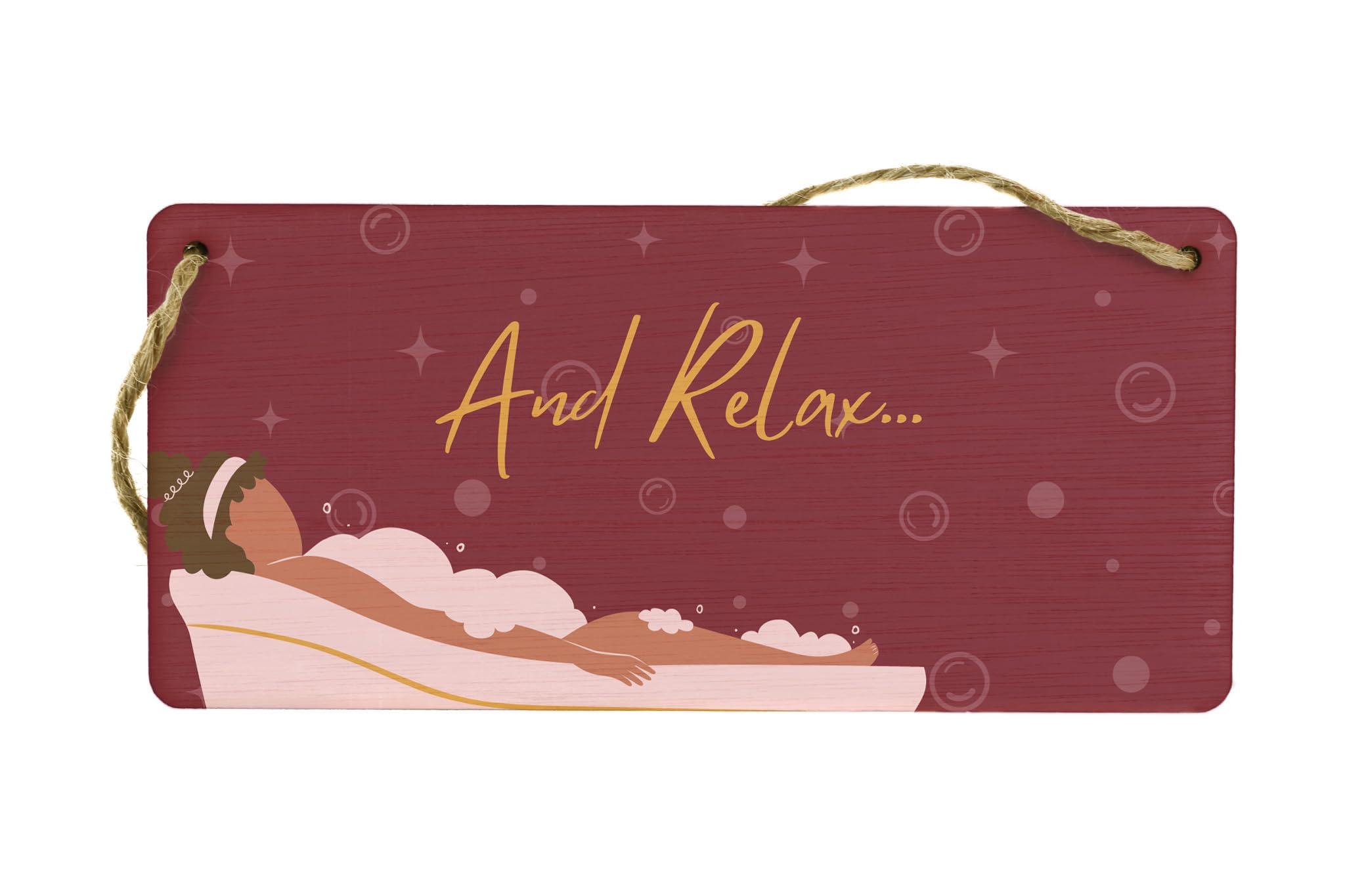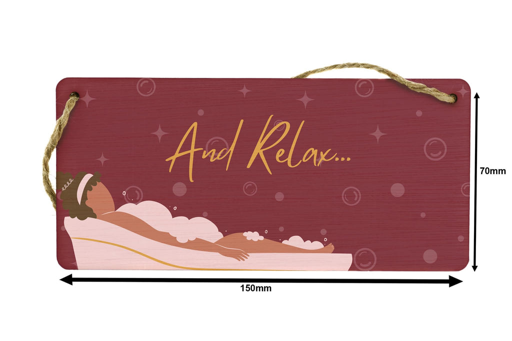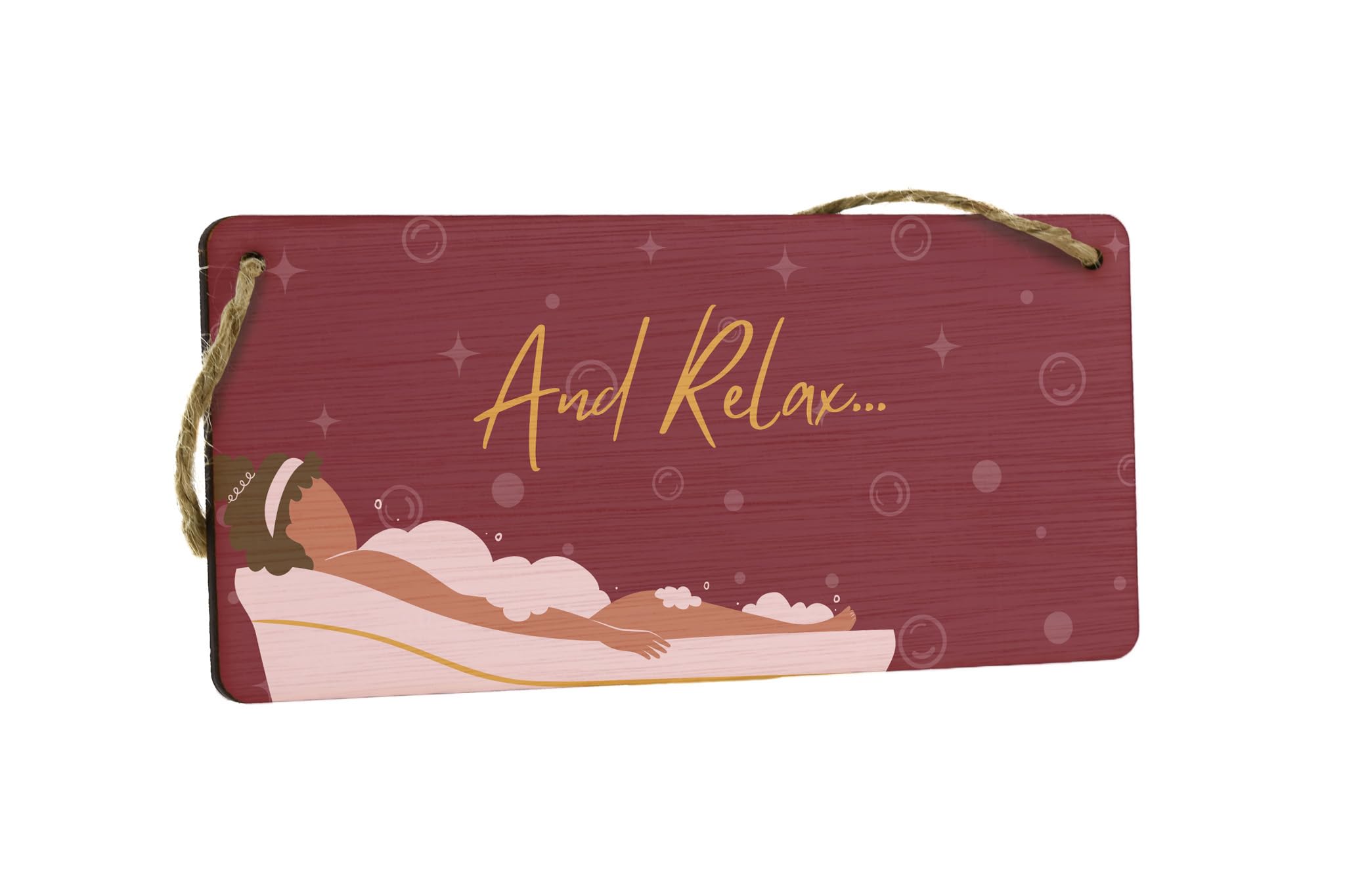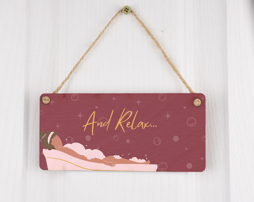 Enhance your bathroom's aesthetic with this beautiful Plywood Hanging Sign. The sign is made from quality plywood, ensuring durability and longevity. With its full-colour design and elegant typography, it adds a touch of sophistication to any home decor. Perfect as a gift for her, this sign reads 'And Relax', serving as a constant reminder to take time for oneself. Easy to hang on any wall or door, this wooden wall sign is the ideal addition to your bathroom.