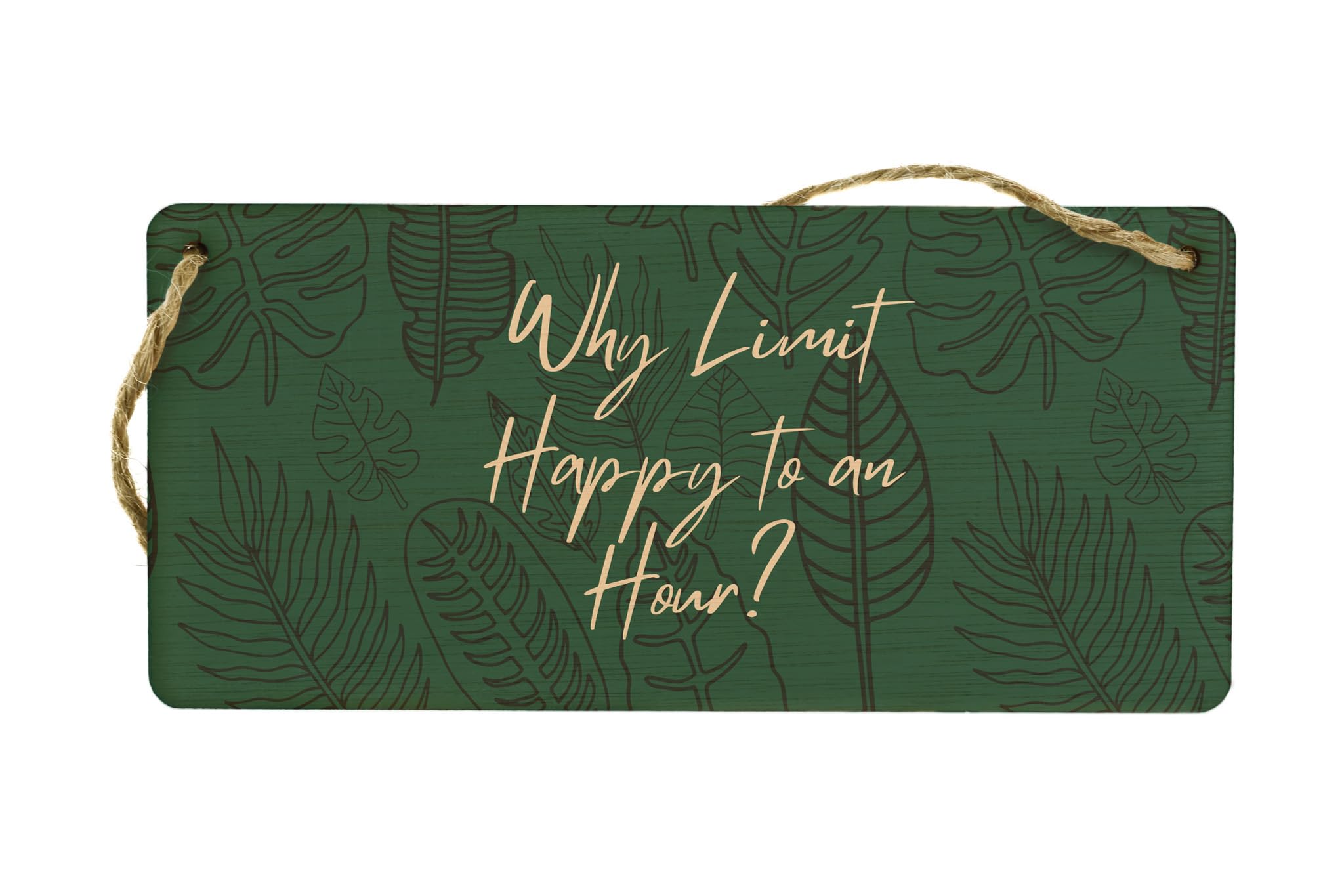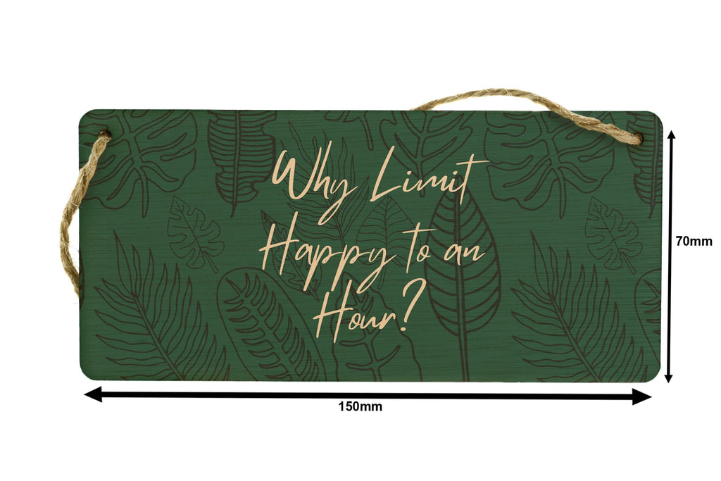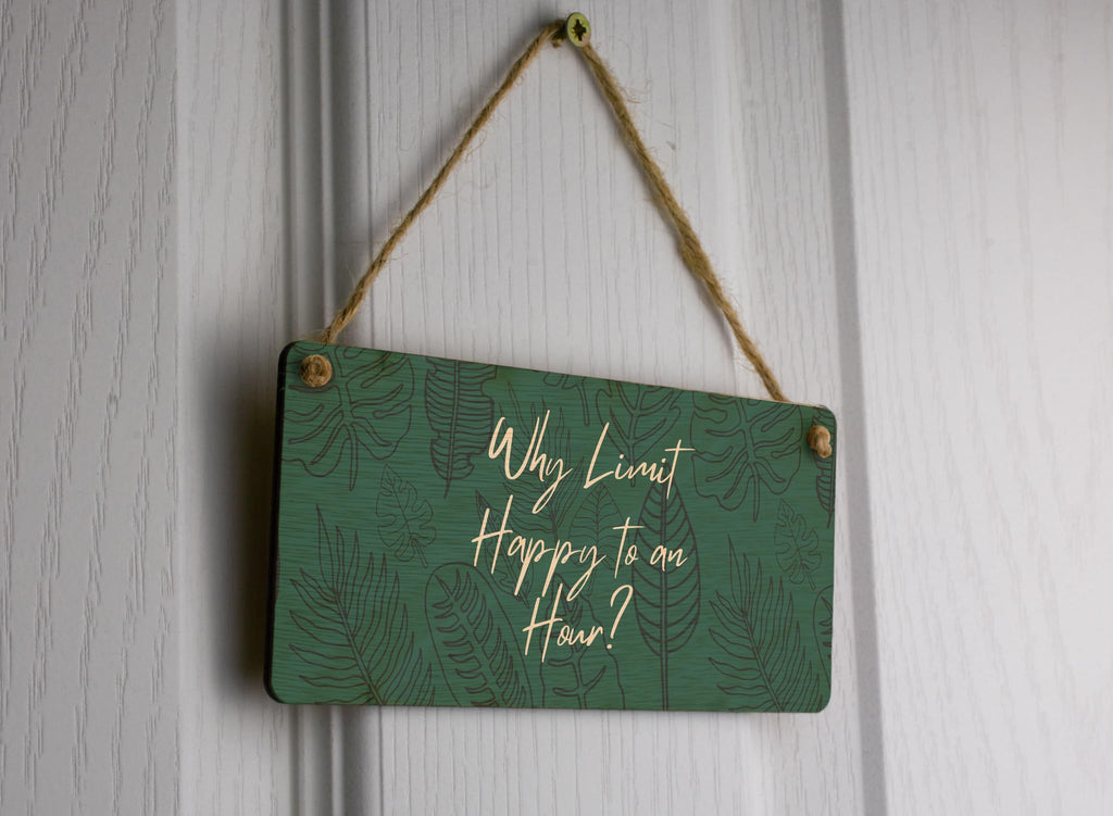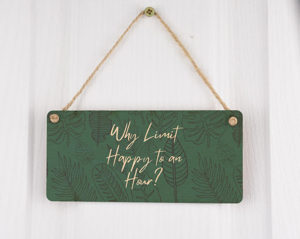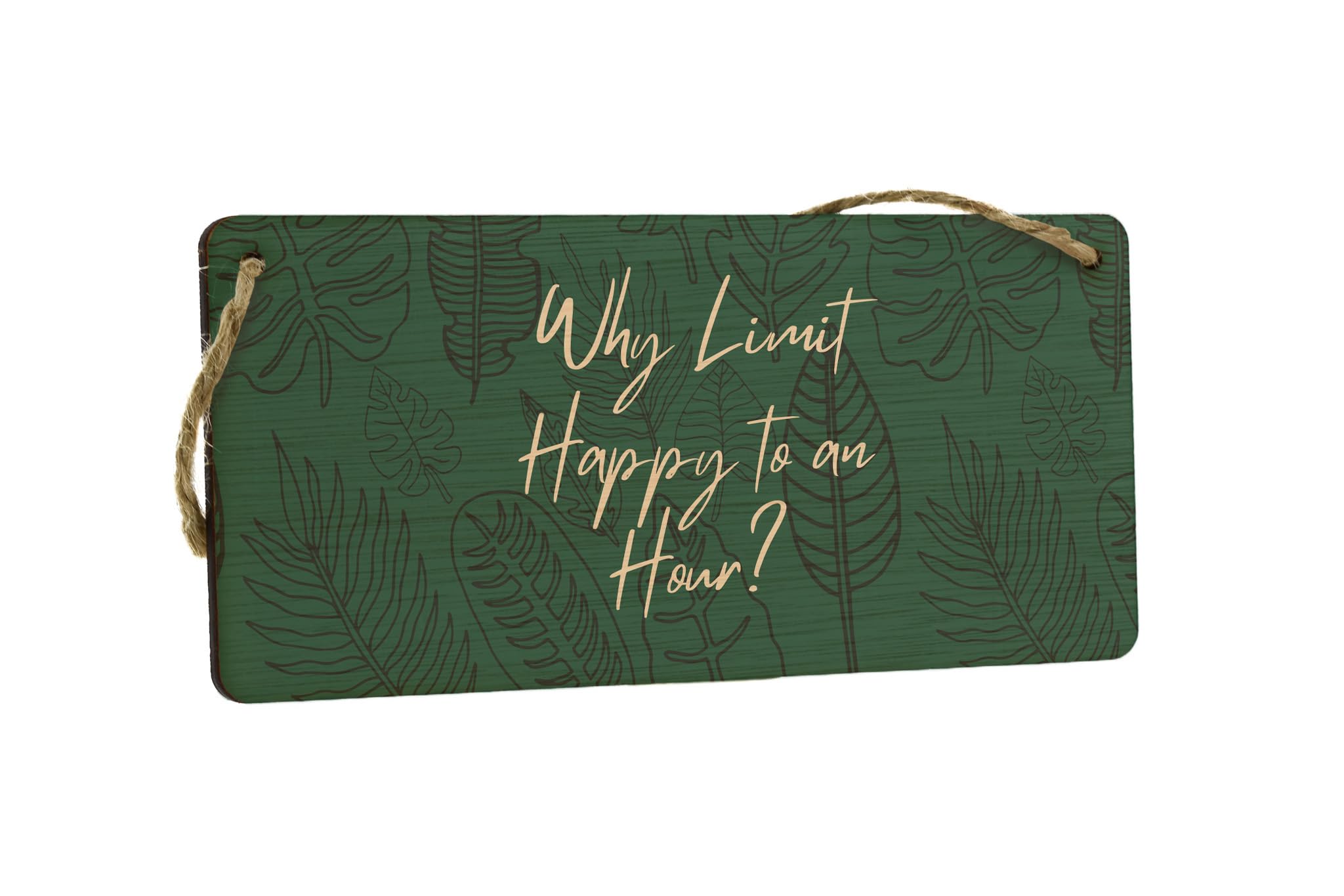 This plywood hanging sign is the perfect addition to your home decor. Made from quality plywood, this sign is durable and long-lasting. The sign reads 'Why Limit Happy To One Hour', making it a great bar decor item or a drinking sign for your kitchen or home bar. The vibrant full-colour design adds a pop of colour to any space. Hang it on your wall or door to create a fun and inviting atmosphere. This happy hour sign is sure to bring a smile to everyone's face and create a lively ambiance.