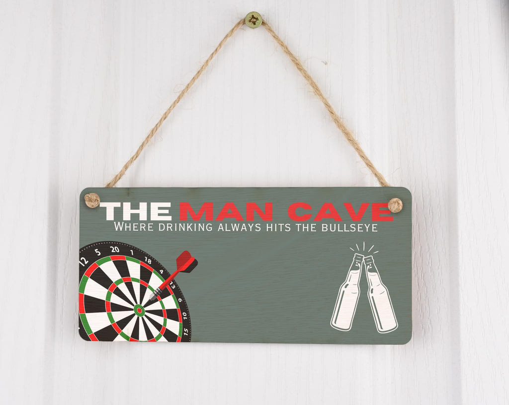 Add a touch of charm and personality to any man cave with this Plywood Sign - Hanging Gift for Man Cave. Made from quality plywood, this sign is designed to bring a smile to the face of any man in your life. Whether it's your husband, dad, boyfriend, or grandad, this novelty gift is sure to be a hit. The full-colour design features a bold statement that reads 'The Man Cave where Drinking Always Hits the Bullseye', making it a perfect addition to any man cave or home bar. Hang it proudly and let everyone know that the man cave is a place to relax, enjoy a drink, and have fun. This sign for home is not just a decorative piece but also a symbol of camaraderie and good times, so why wait? Treat your loved one to this unique gift and make their man cave one to remember.