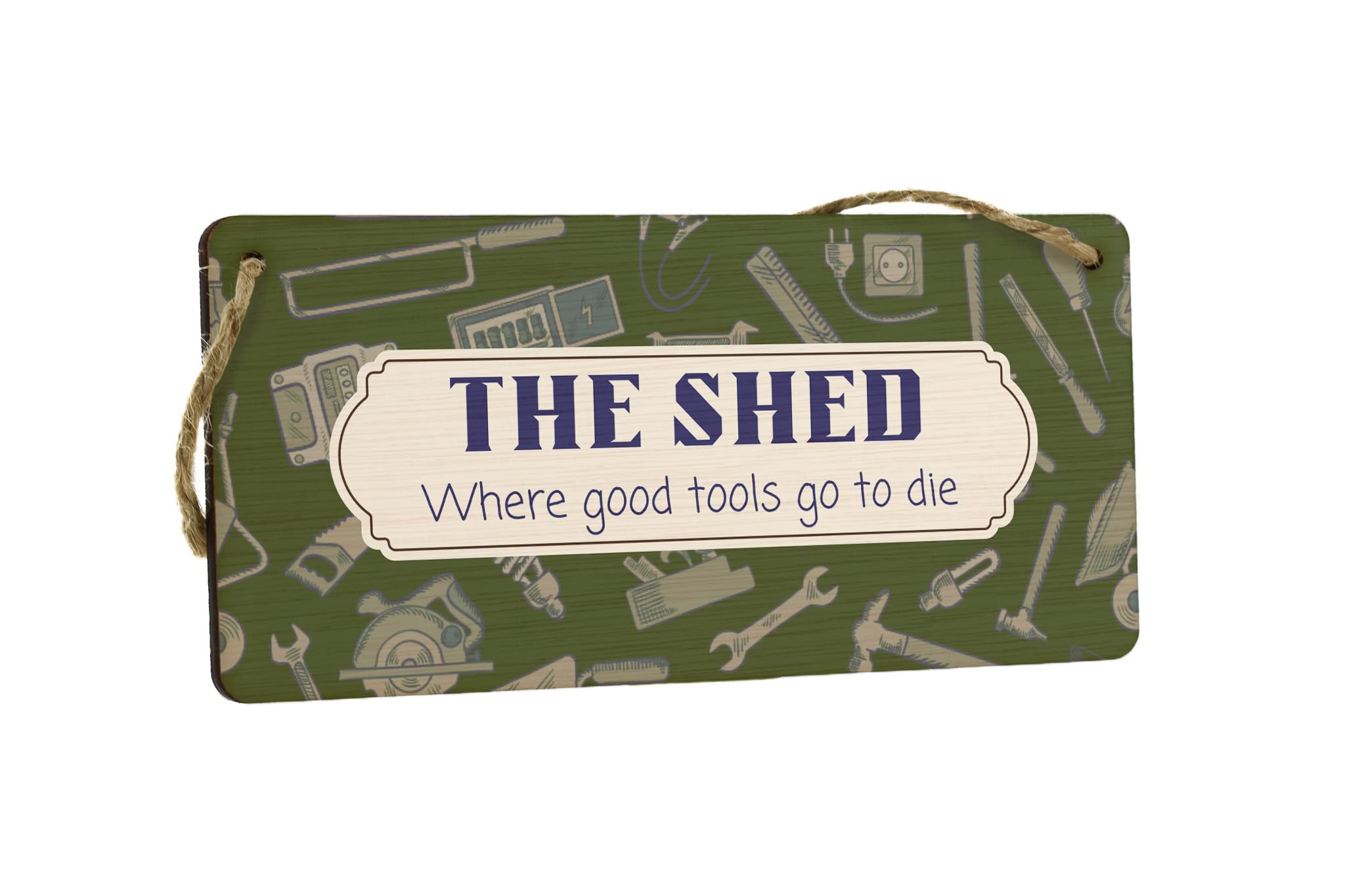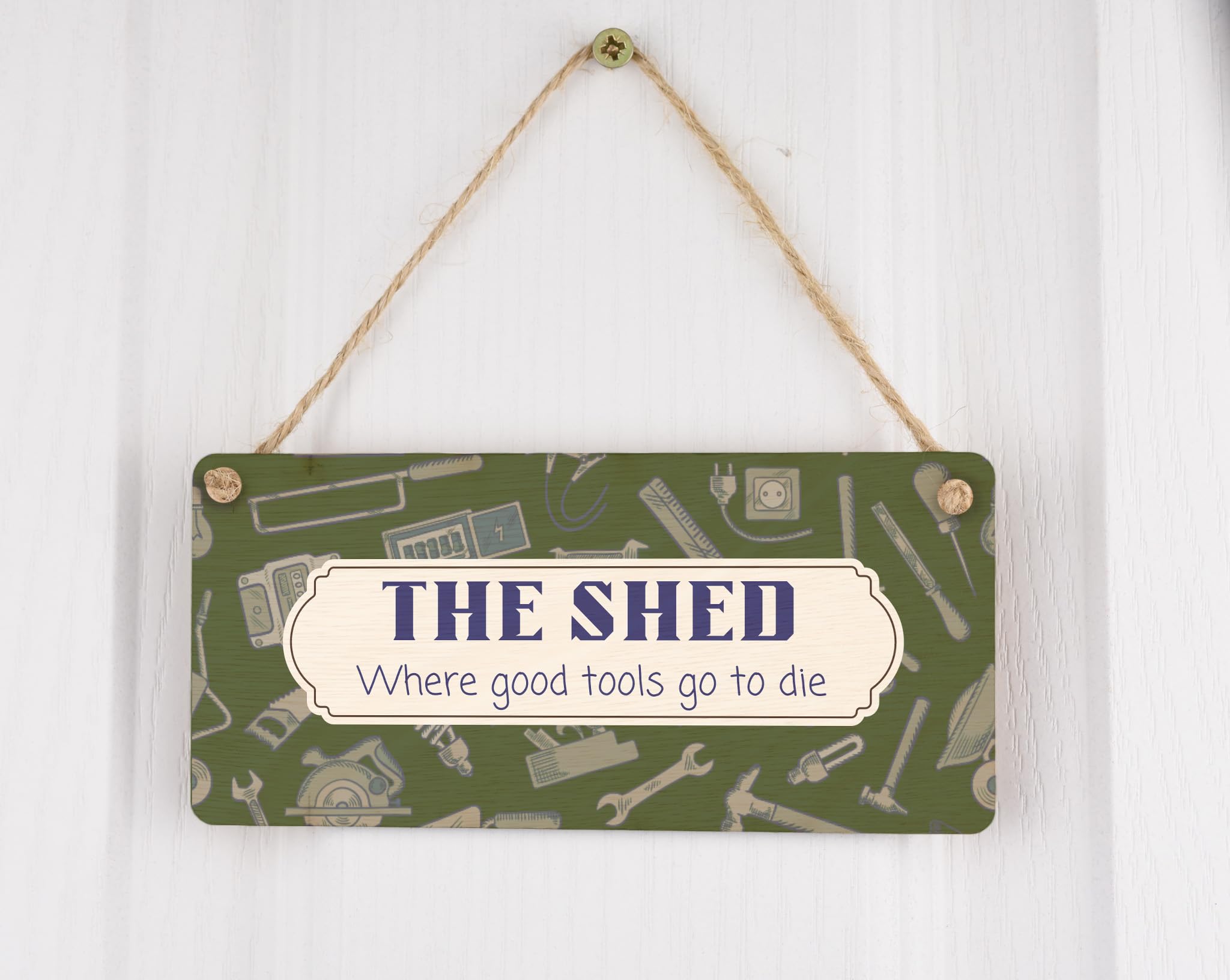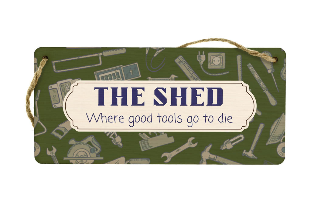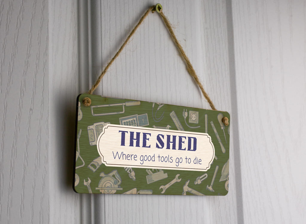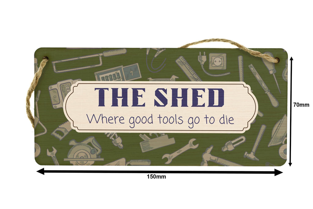 Introducing our Plywood Hanging Sign, the perfect novelty home decor for any shed enthusiast! This funny gift for dad, grandad, him or son will bring a touch of humor and personality to any man's sanctuary. Crafted from quality plywood, this sign is built to last and will add character to any space. With a full colour design featuring a background theme of tools, it is sure to catch the eye and become a conversation starter. The sign reads 'The Shed Where Good Tools Go to Die', making it the perfect gift for tool-lovers who appreciate a good laugh. Whether you want to spruce up your own shed or surprise a loved one, this hanging sign is a must-have addition to any shed decor collection. Get yours today and let the laughs begin!
