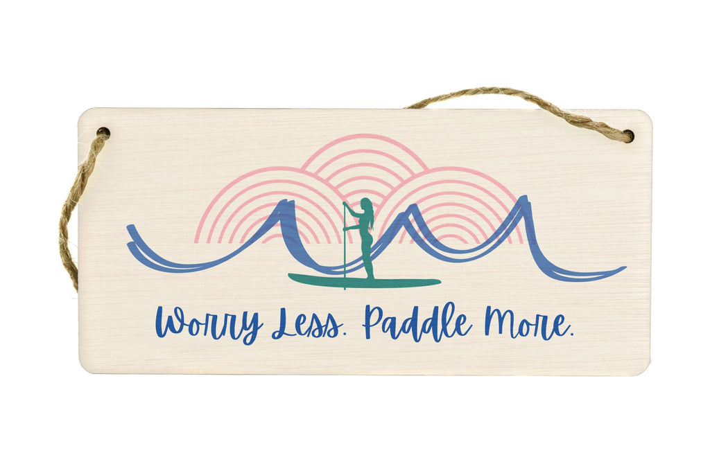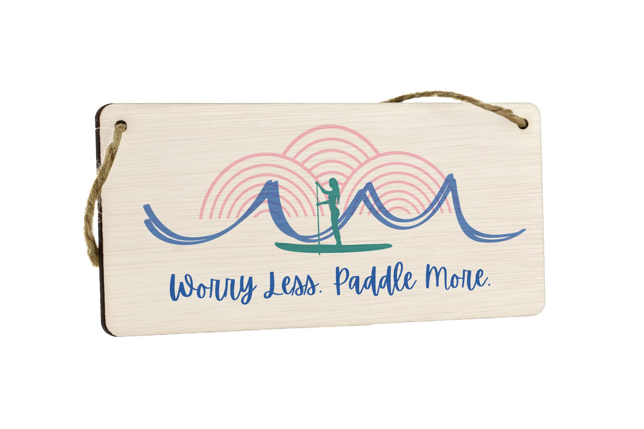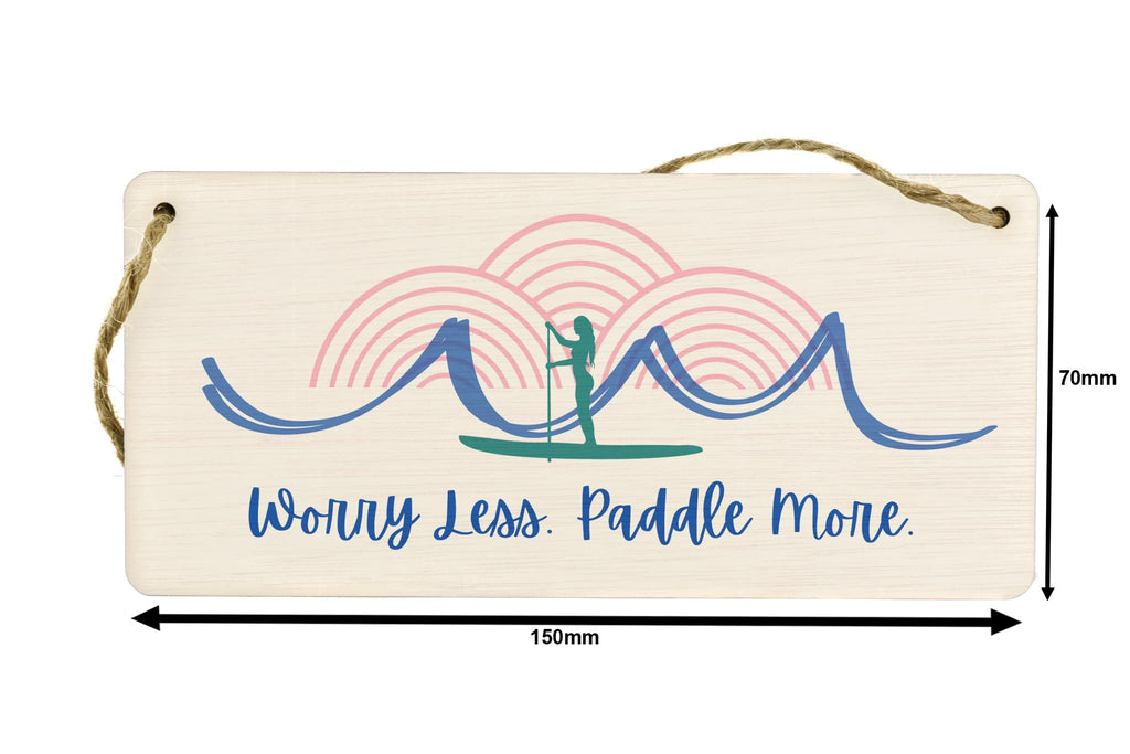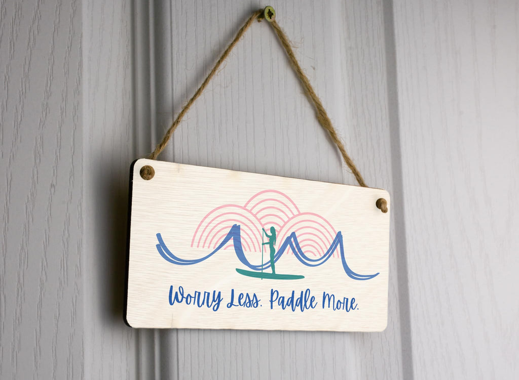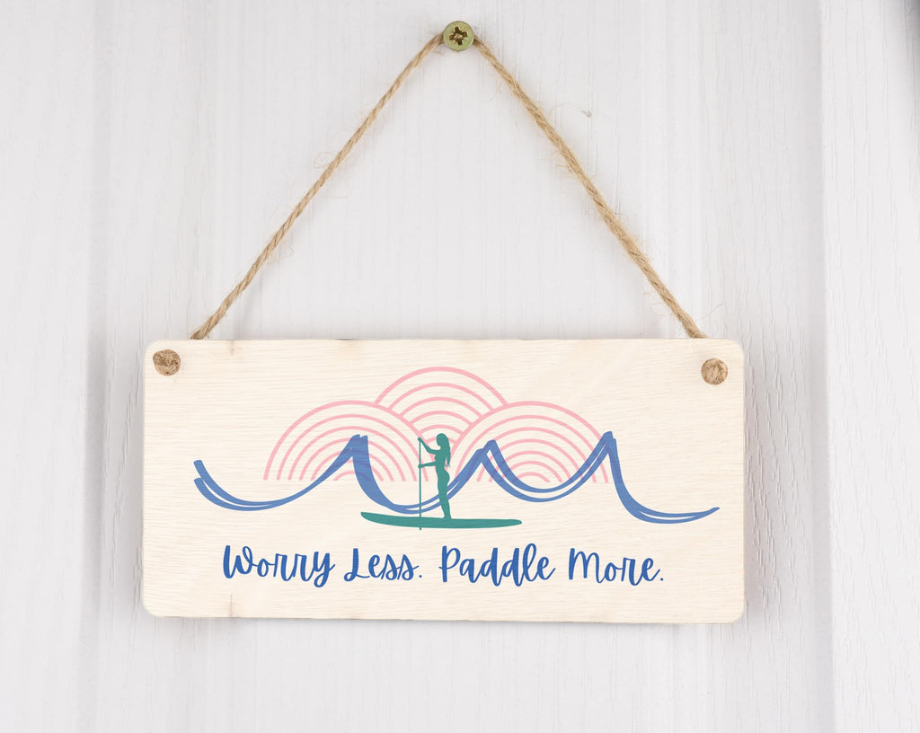 Add a touch of positive coastal vibes to your home with our Full Colour Plywood Hanging Sign. This charming decor piece features a beautiful design that reads 'Worry Less, Paddle More' - a positive message to remind you to live life to the fullest. Made from quality plywood, this hanging sign is durable and built to last. The full colour design includes an image of a paddleboarder gliding through the waves, creating a stunning visual display. Whether you're a beach lover, a paddleboard enthusiast, or simply looking for a unique gift for your mum or a couple, this sign is the perfect addition to any living room, kitchen, or bedroom. Decorate your space with positivity and style by hanging this lovely sign today.
