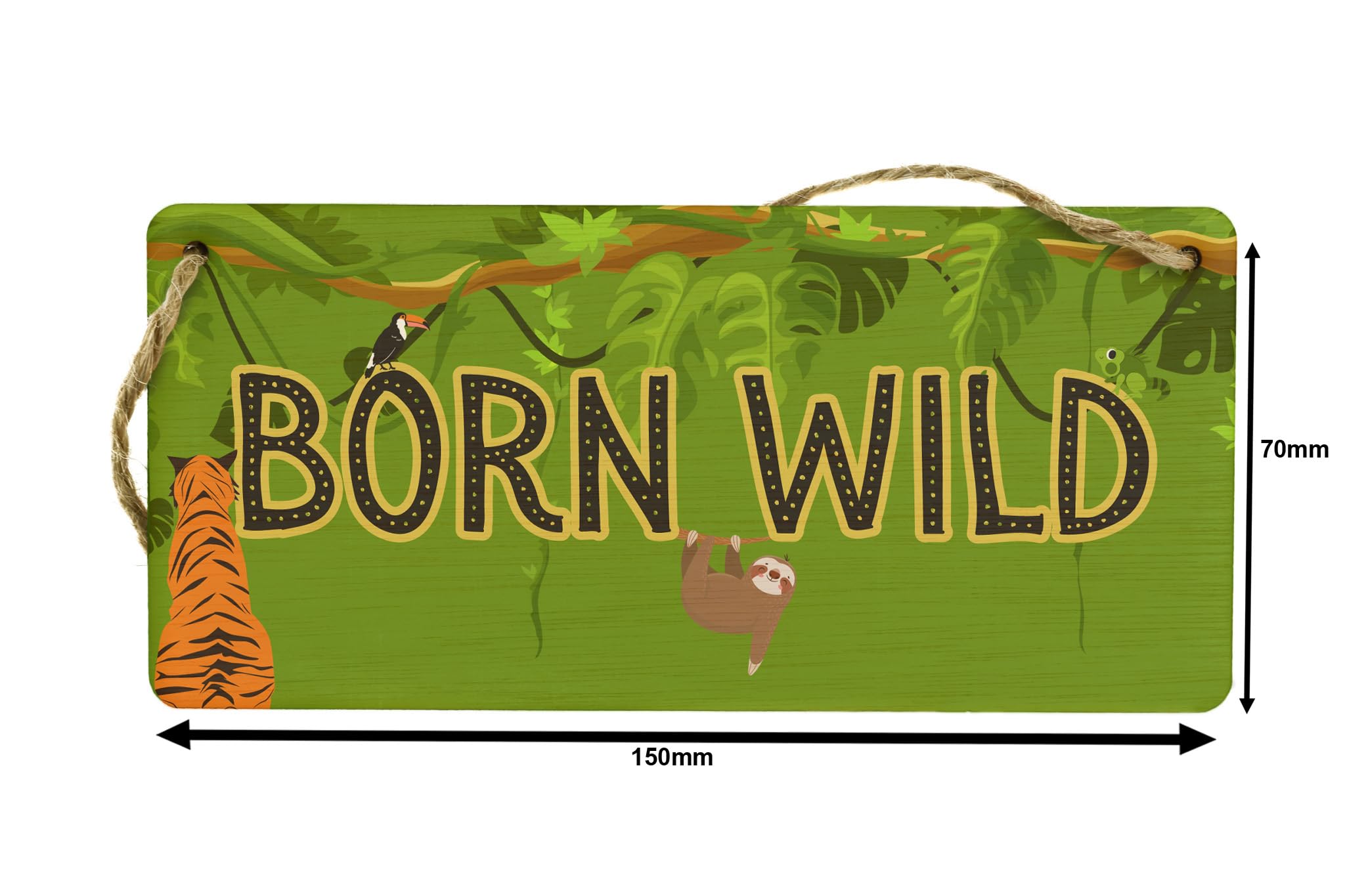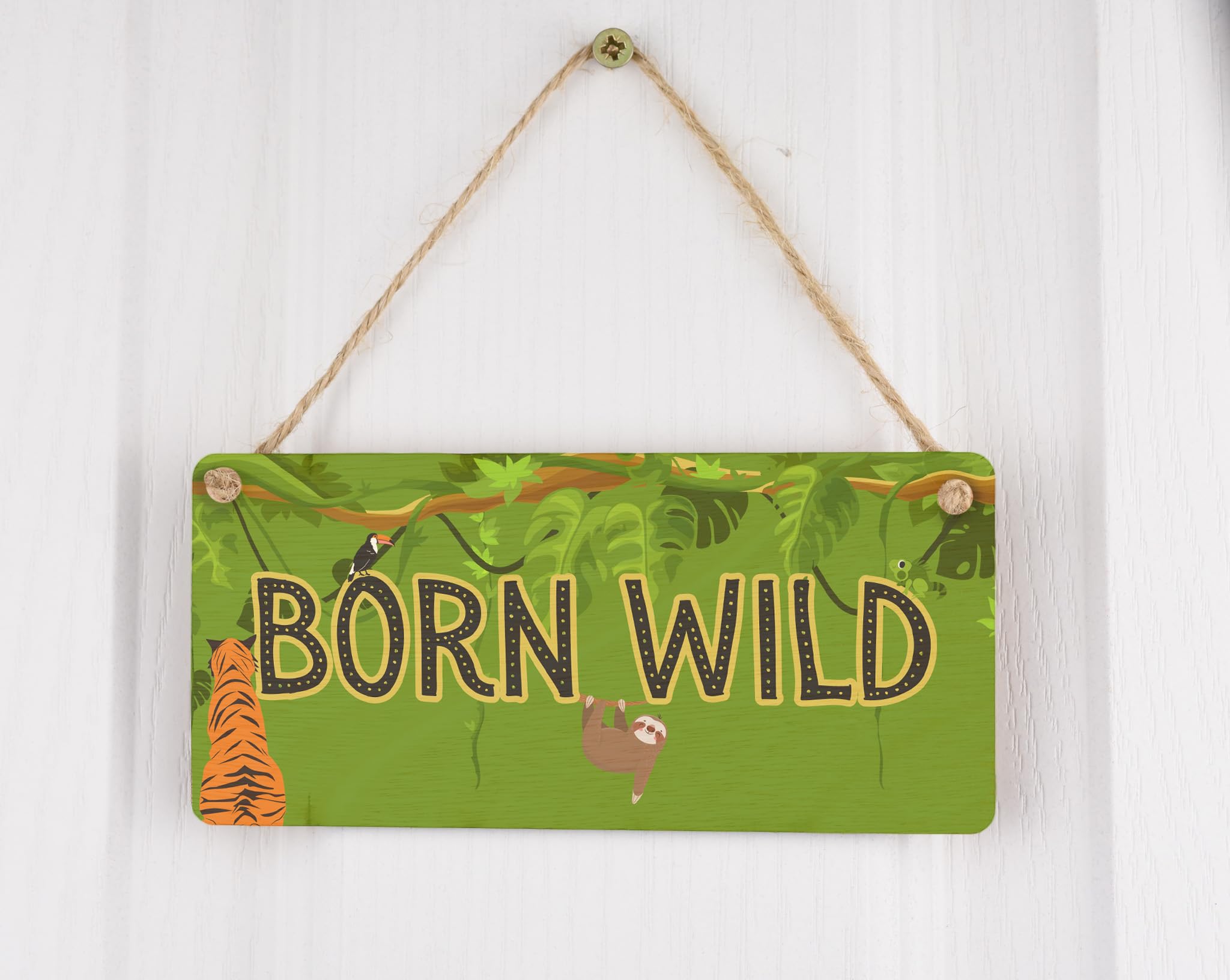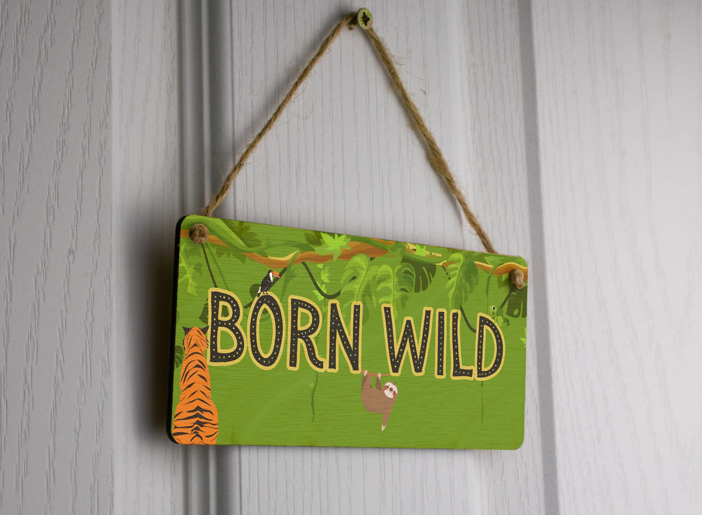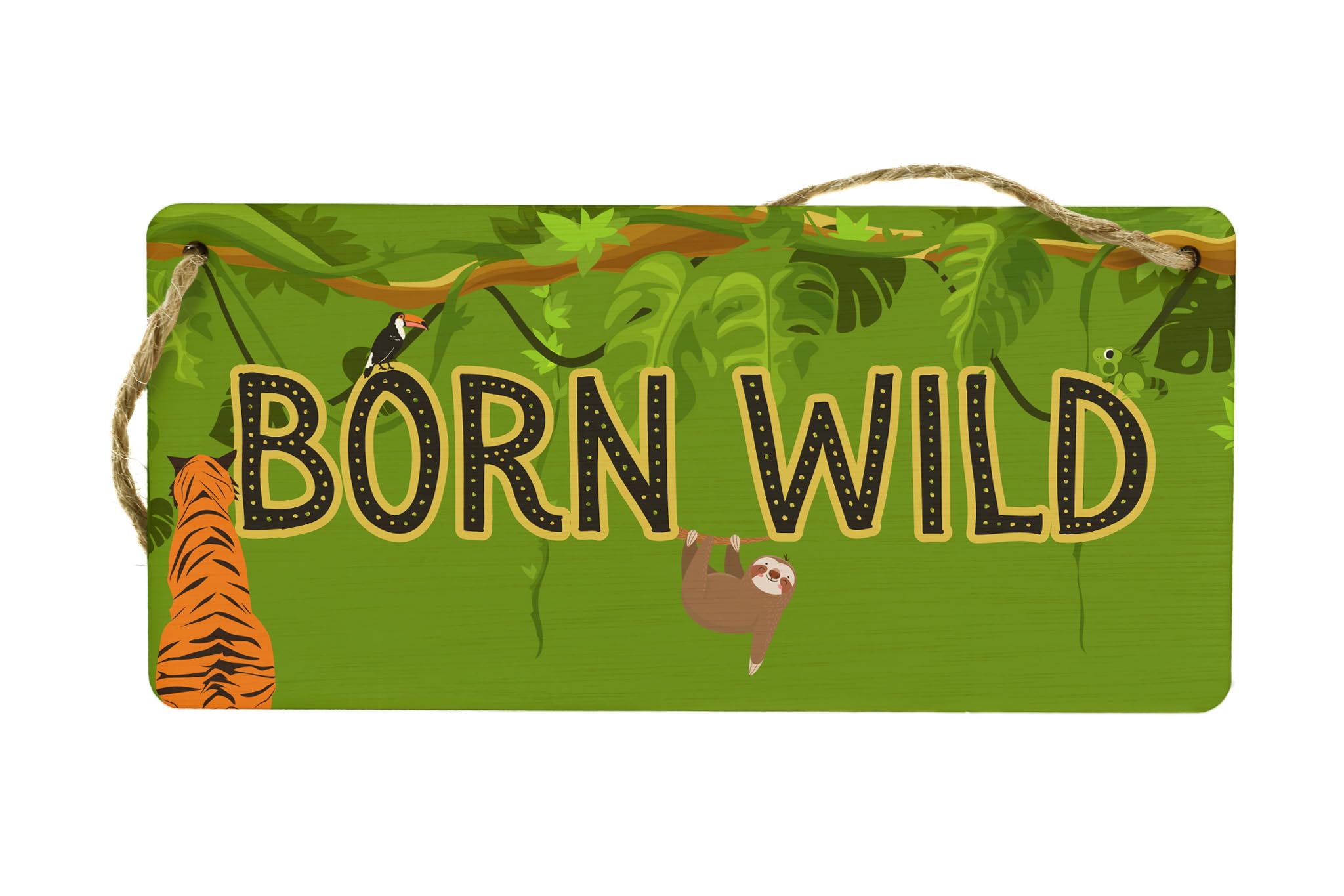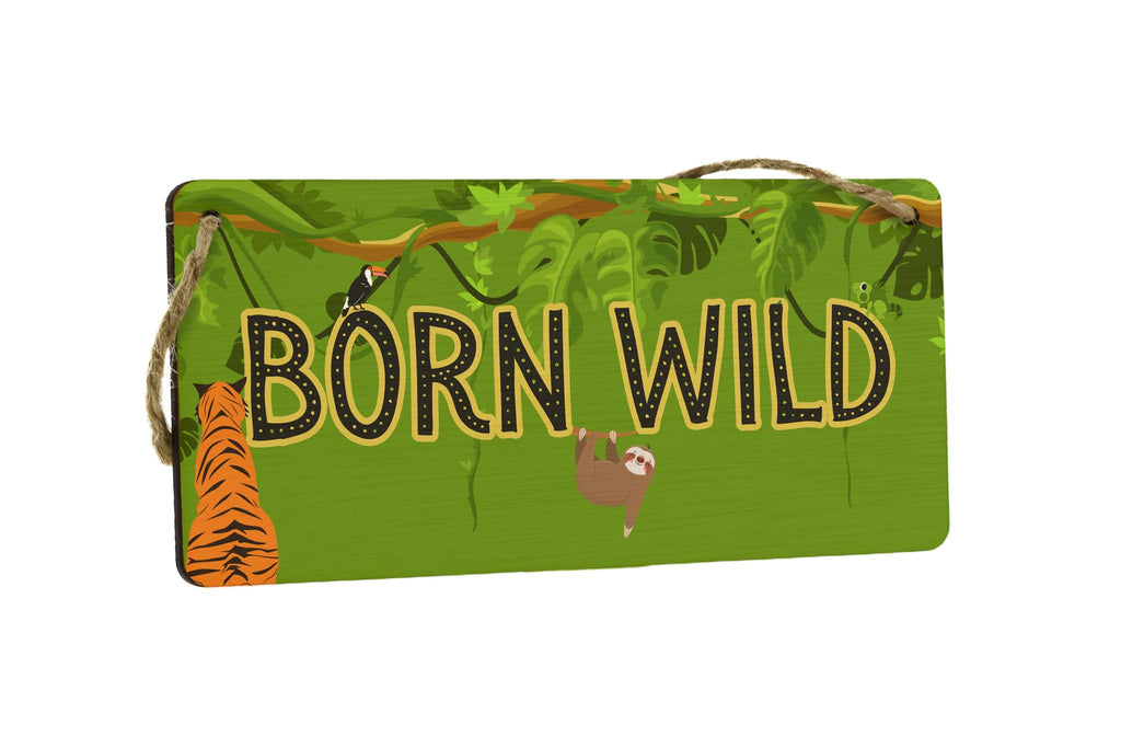 Plywood Hanging Sign, Reads 'Born Wild' - Kids Room and Nursery D?cor, Animal Theme, Full Colour