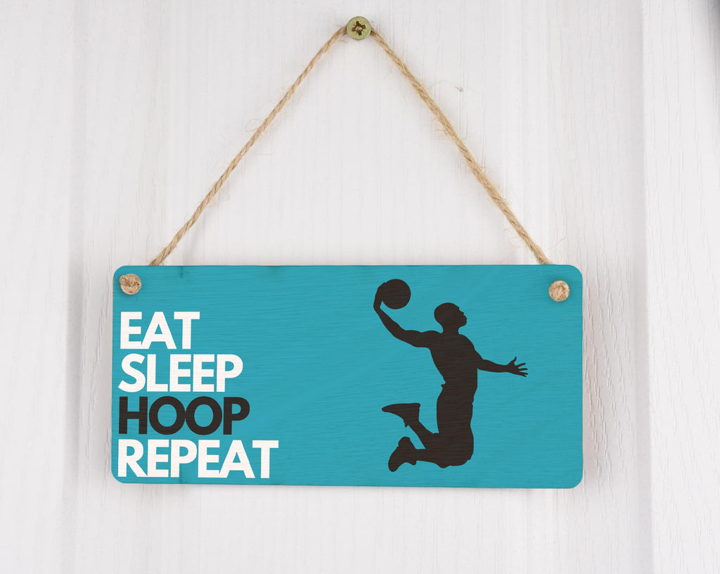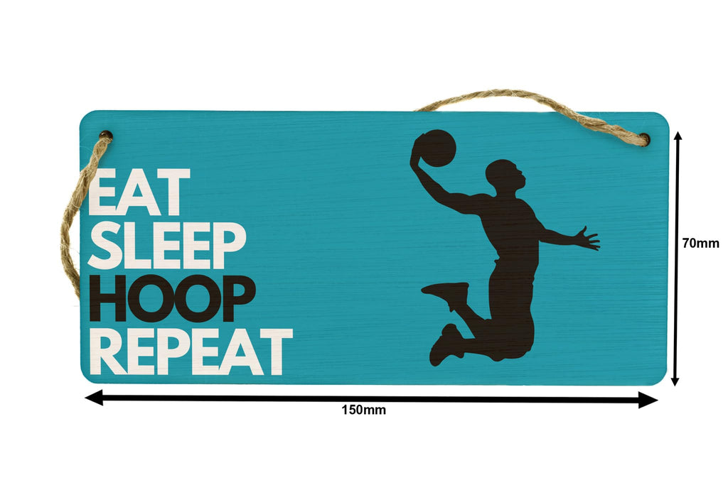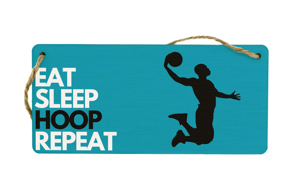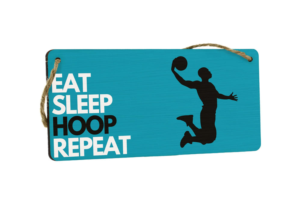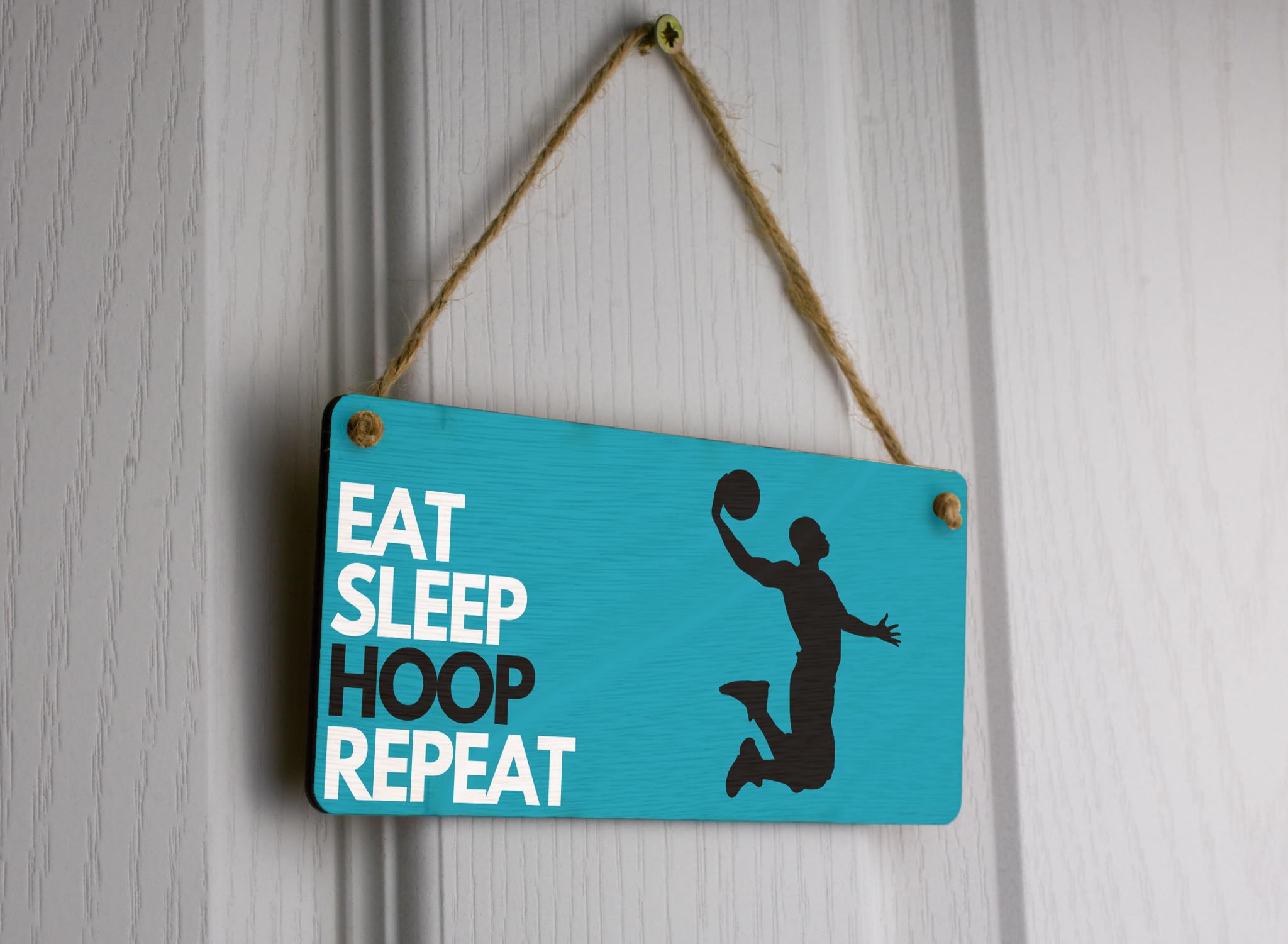 Add a touch of basketball inspiration to your home decor with this Plywood Hanging Sign. Featuring the motivational phrase 'Eat Sleep Hoop Repeat' in bold, full colour lettering, this sign is perfect for any basketball lover. Made from quality plywood, it is durable and lightweight, making it easy to hang on any wall or door. Whether you're a player, coach, or fan, this basketball decor piece is sure to bring a sporty vibe to any room in your home. Show off your love for the game with this stylish and eye-catching sign.