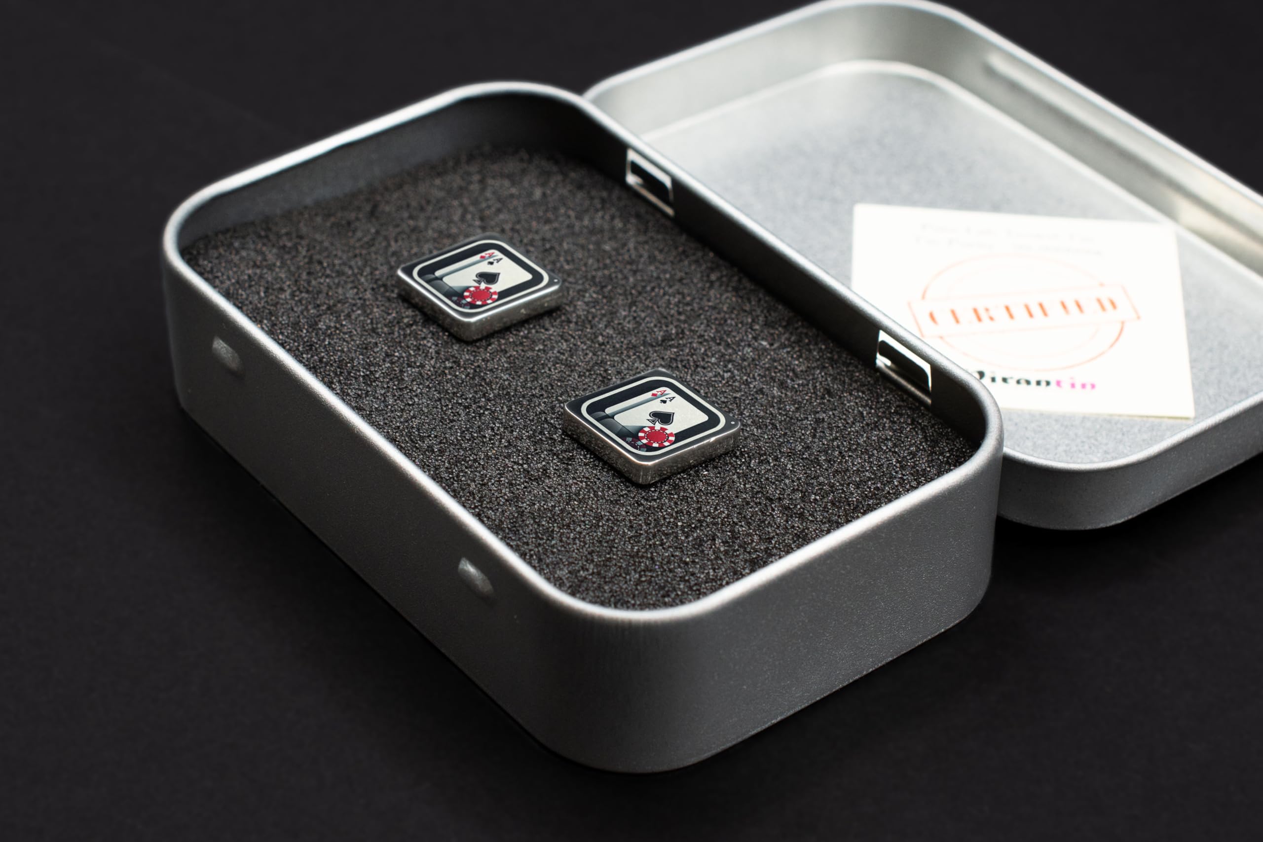 Take your style to the next level with these Poker Ace Cufflinks, designed for the card player who loves to bring a touch of casino charm to their wardrobe. Featuring the iconic Ace of Spades and a classic poker chip design, these cufflinks capture the thrill of the game and the sophistication of a high-stakes casino. Made with premium materials and a polished finish, these cufflinks are as durable as they are stylish. The reliable toggle closure ensures a secure fit, whether you're at a formal event or hosting a poker night with friends. Packaged in a sleek gift box, these cufflinks make a fantastic gift for any card enthusiast or gambling aficionado. Whether you're hitting the casino floor or dressing up for a special occasion, the Poker Ace Cufflinks are a winning hand for your outfit.