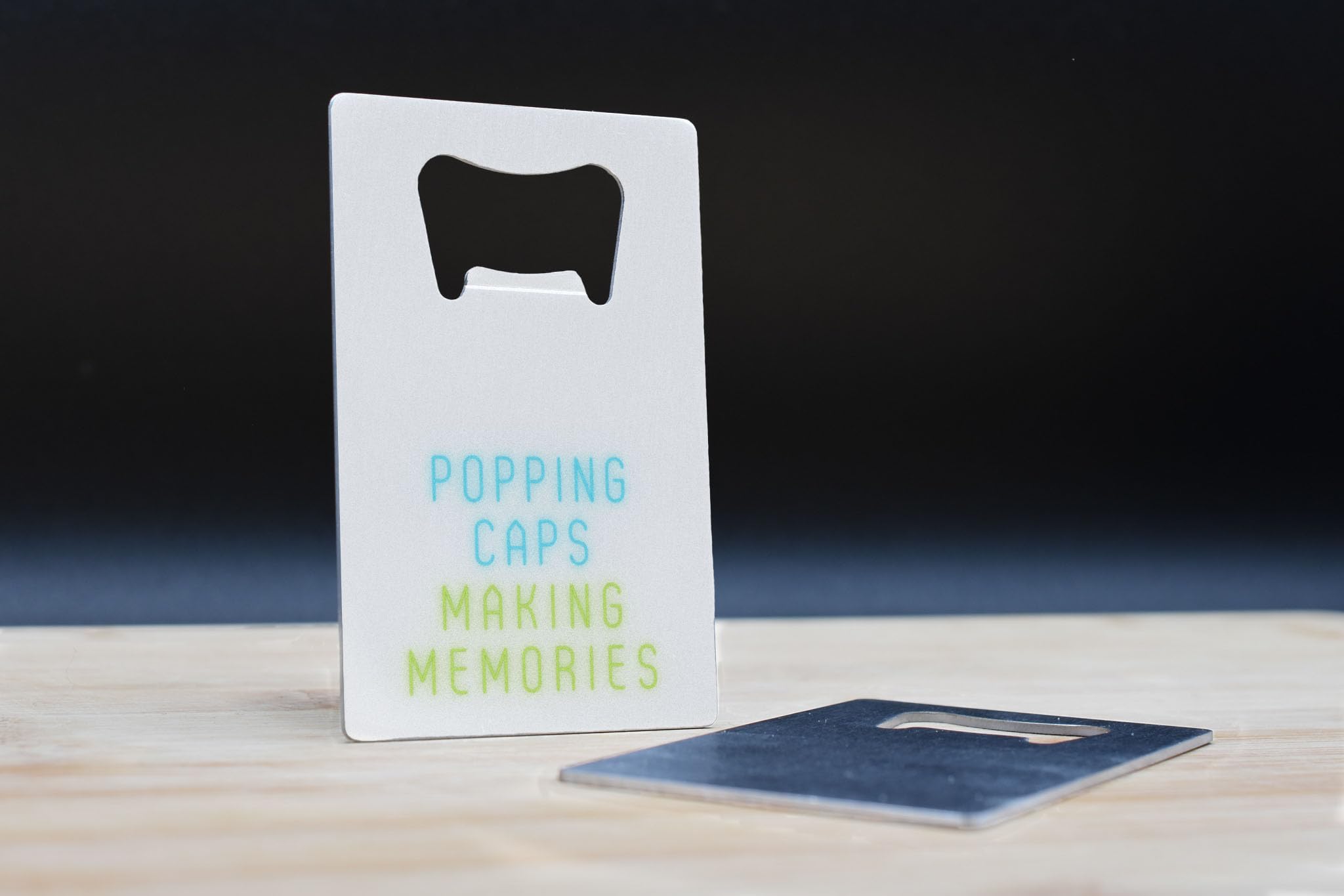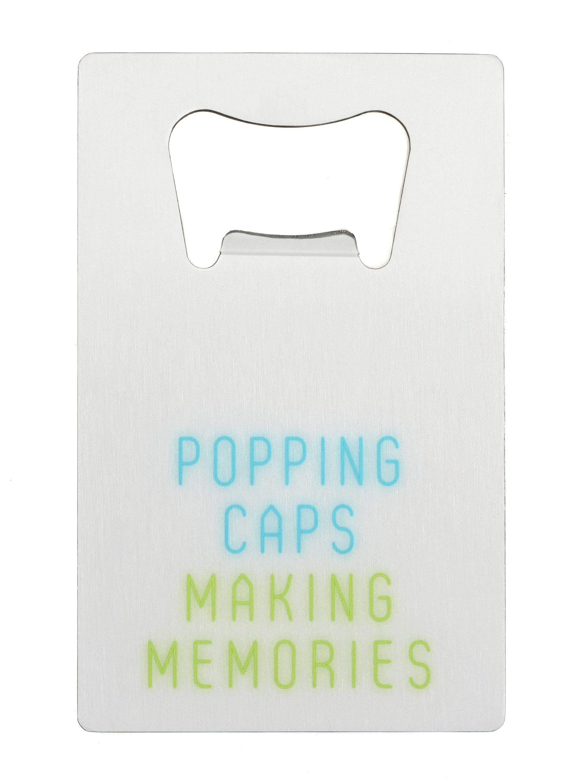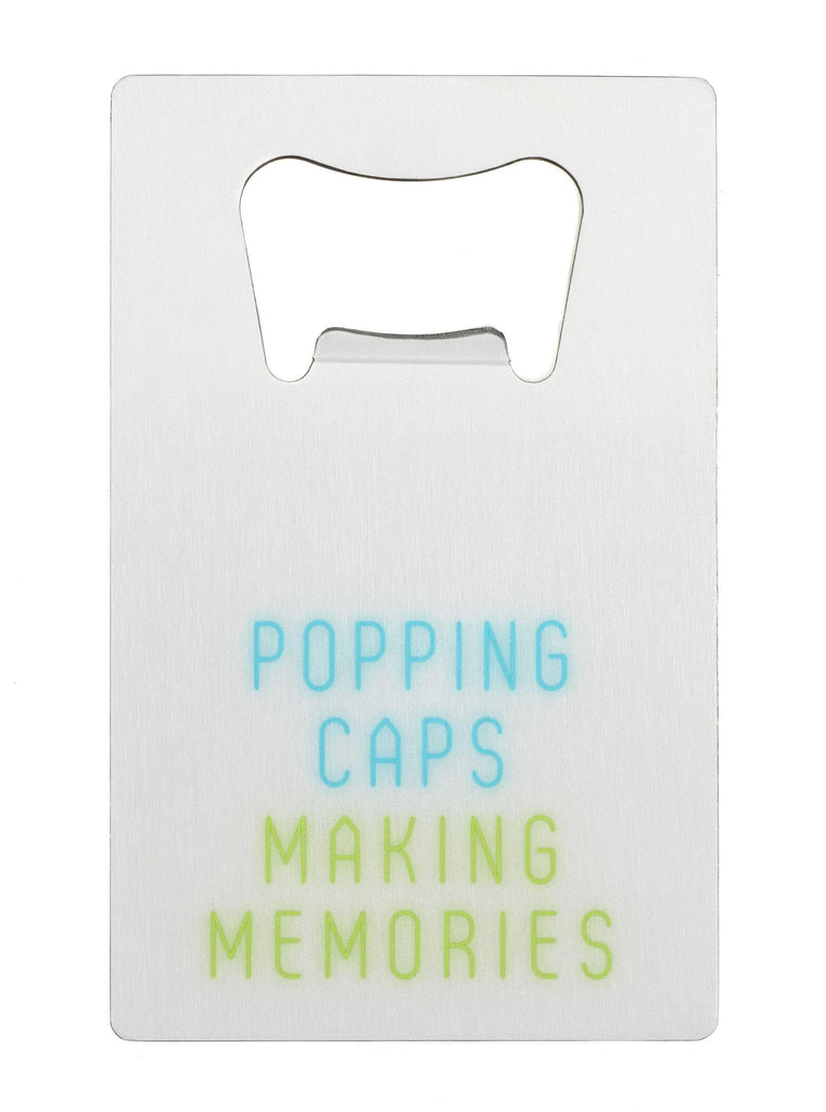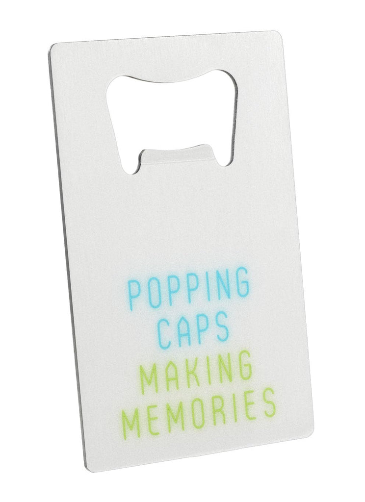 Introducing the Popping Caps Opener - Making Memories Novelty Bottle Opener! This fun and stylish barware accessory is a must-have for any party or BBQ. Made from quality stainless steel, this compact cap remover is not only a unique drink tool, but also a lighthearted bar accessory that adds a touch of fun to any celebration. The full colour UV printed design reads 'popping caps - making memories', making it a cool and quirky addition to your bar collection. Easy to use and portable, this beverage opener with style is a party essential tool that will have your guests impressed. Get your hands on this celebration-themed opener and start making memories today!