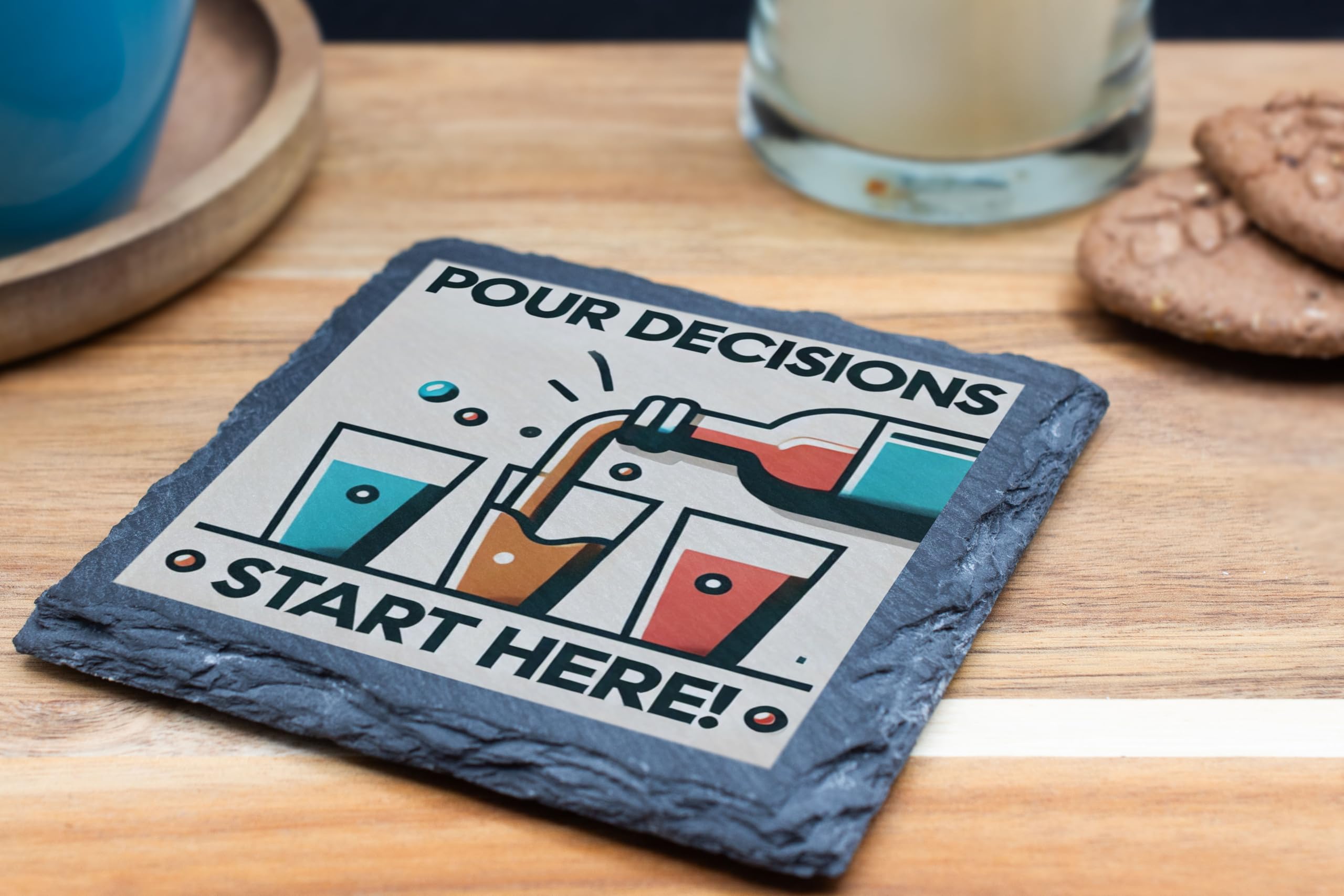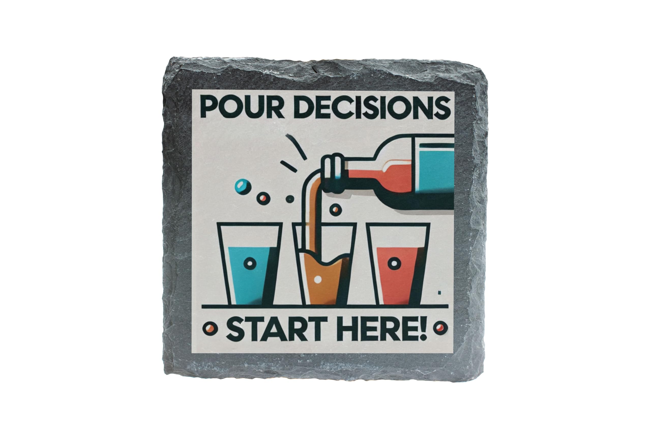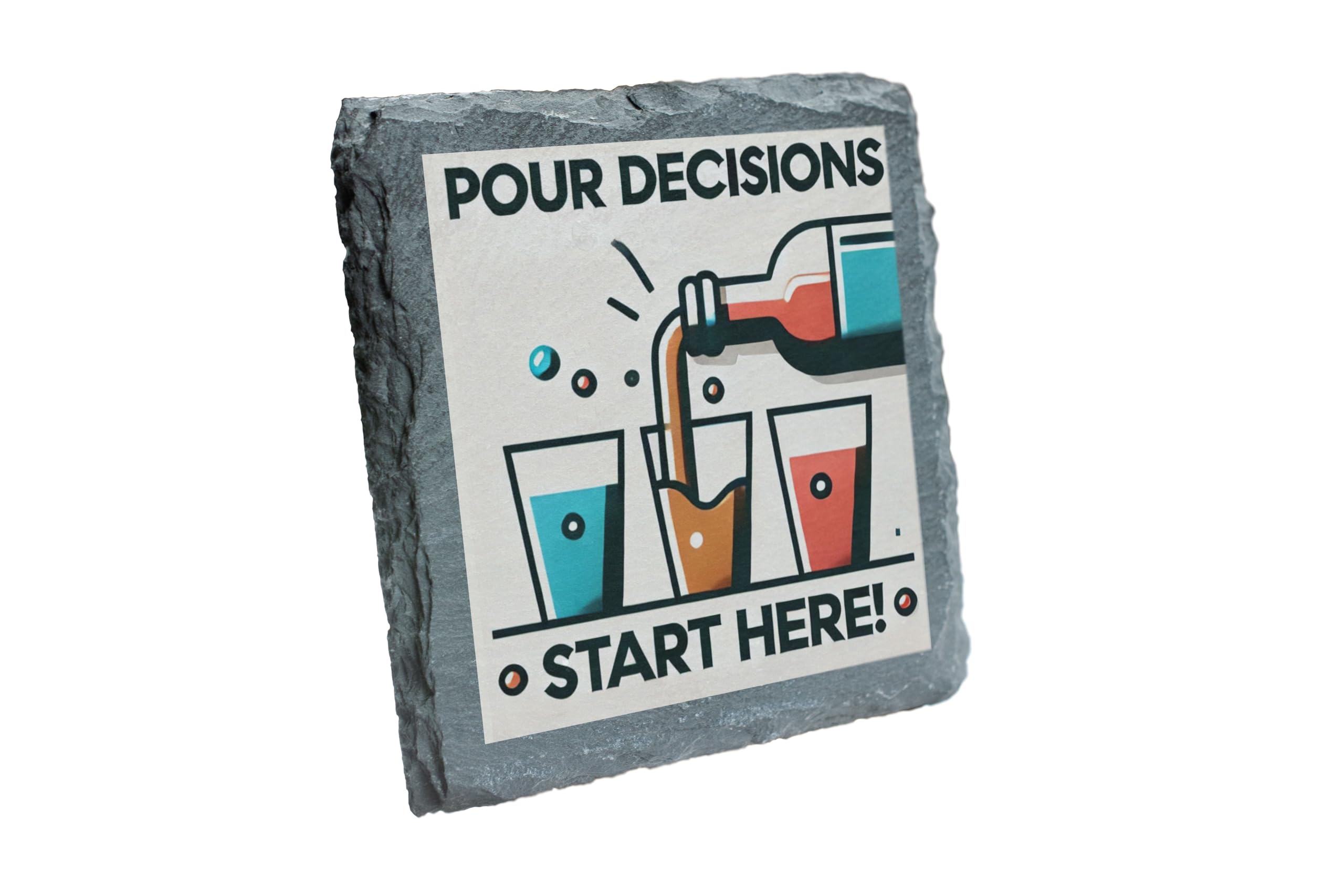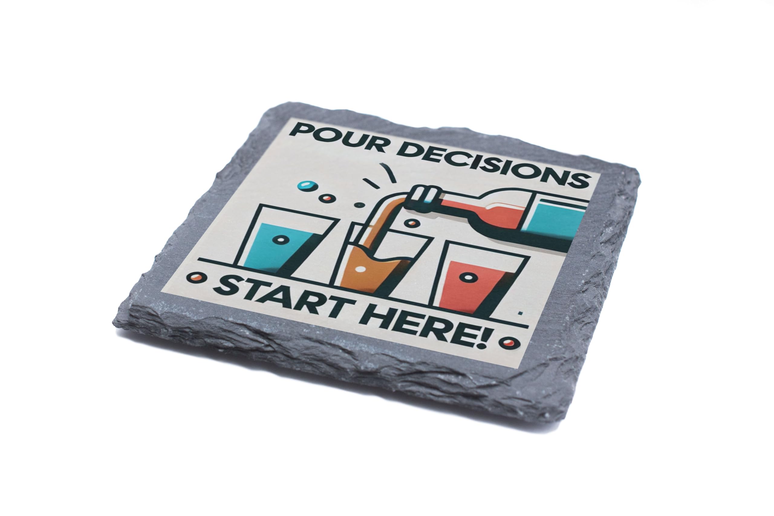 Kick off the fun at your next gathering with this "Pour Decisions Start Here" slate coaster. Designed for those who enjoy a good laugh and a great drink, this coaster combines humor with practicality. The vibrant and playful design makes it a standout piece for any bar, kitchen, or dining table. Made from high-quality natural slate, this coaster not only adds a stylish touch to your decor but also protects your surfaces from stains and scratches. Its easy-to-clean surface ensures long-lasting use, making it the perfect accessory for your home or a thoughtful gift for the drink enthusiast in your life. Start every pour on the right note?add this witty and durable coaster to your collection today!