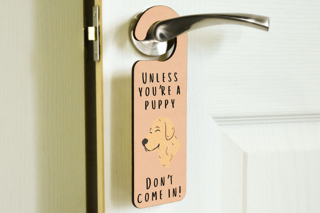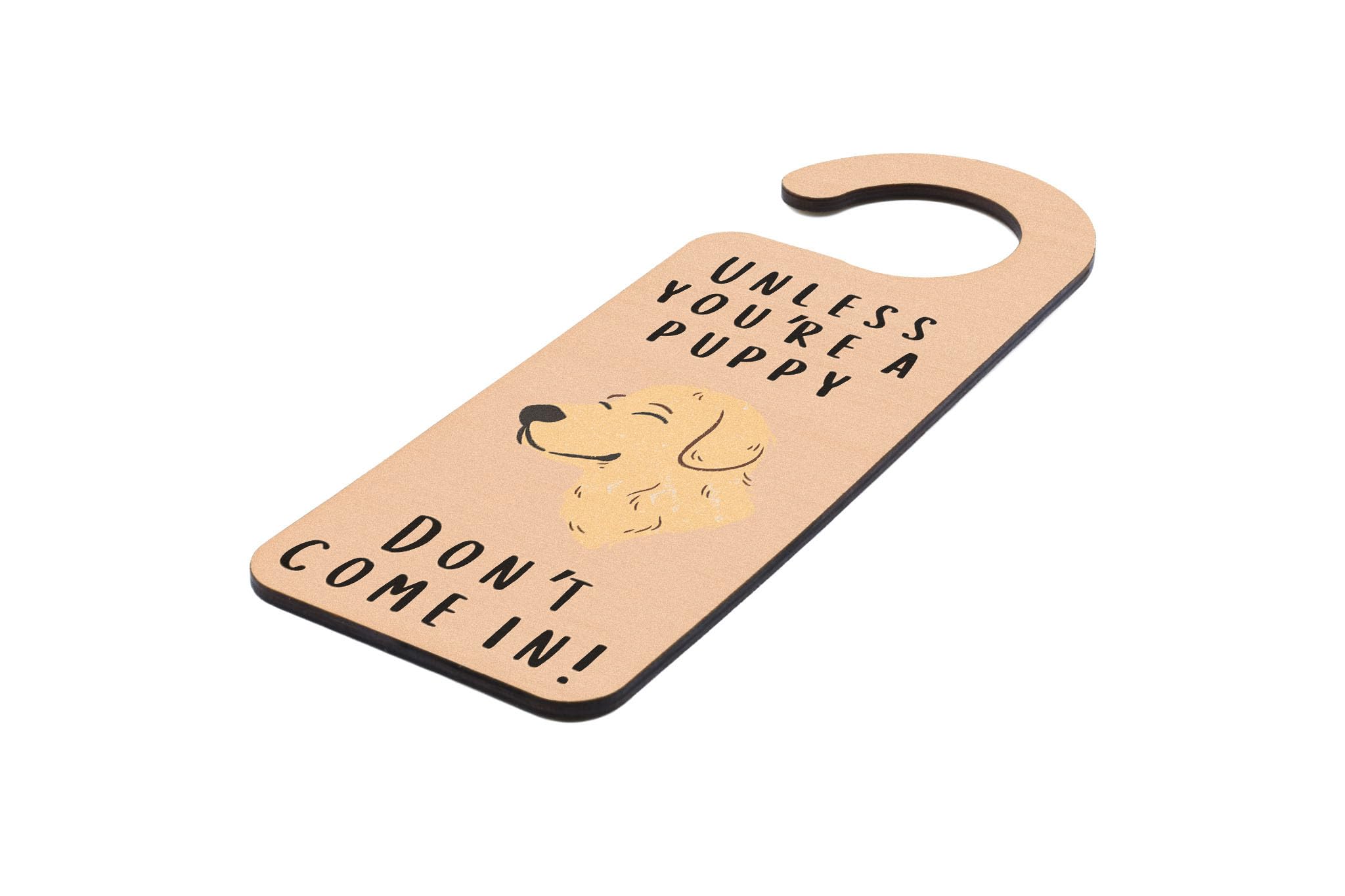 Introducing our Puppy-Themed Dog Lover Door Sign, the perfect addition to any animal lovers home decor. This handcrafted laser cut plywood product features a cute design with a funny and pet-friendly message. The full colour door hanger showcases a delightful cartoon-style puppy illustration, making it an ideal room accessory for all dog lovers. The playful message, 'unless you're a puppy do not come in', serves as a friendly warning to visitors. This humorous decor piece is a must-have for any canine enthusiast, adding a touch of charm and character to your space.