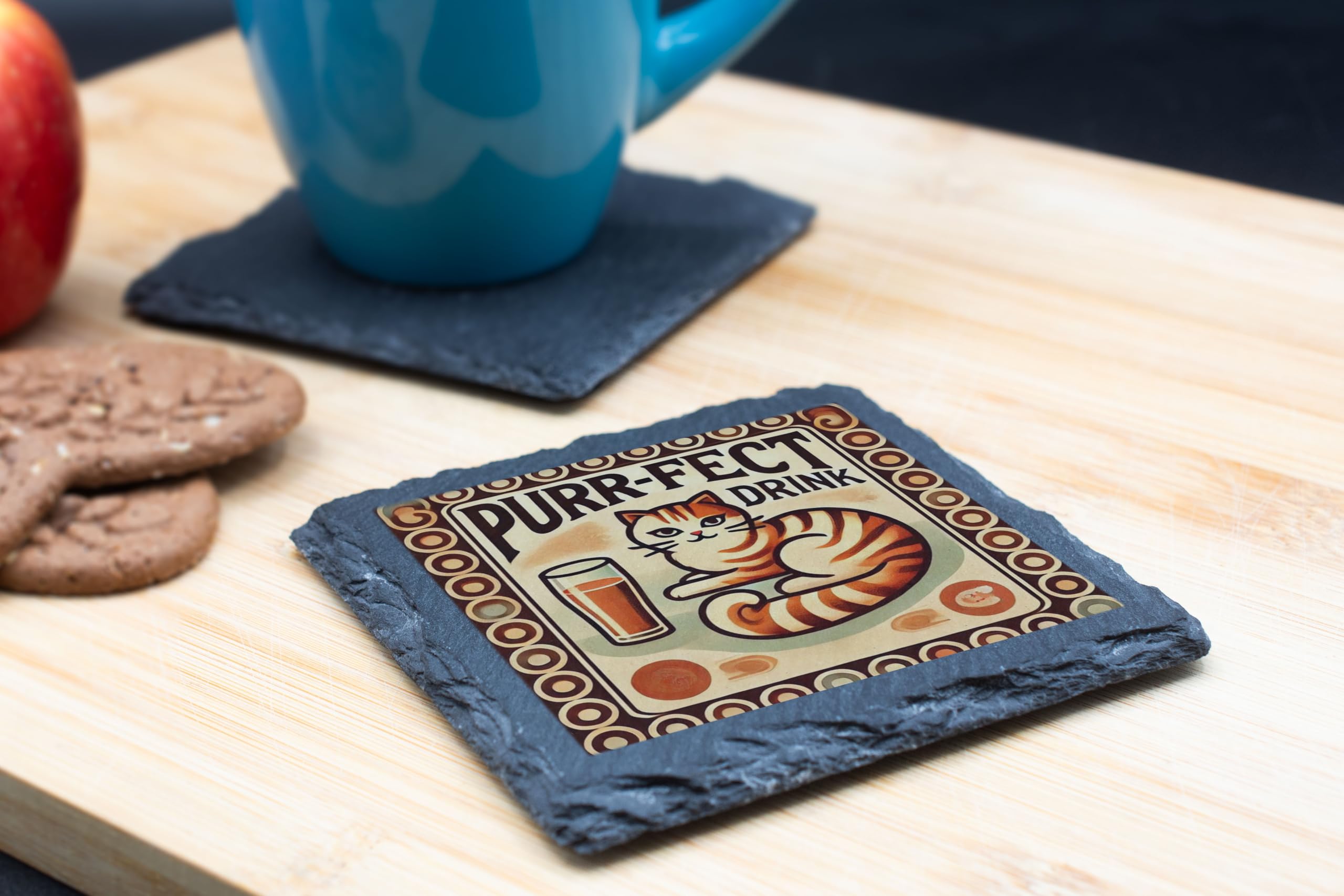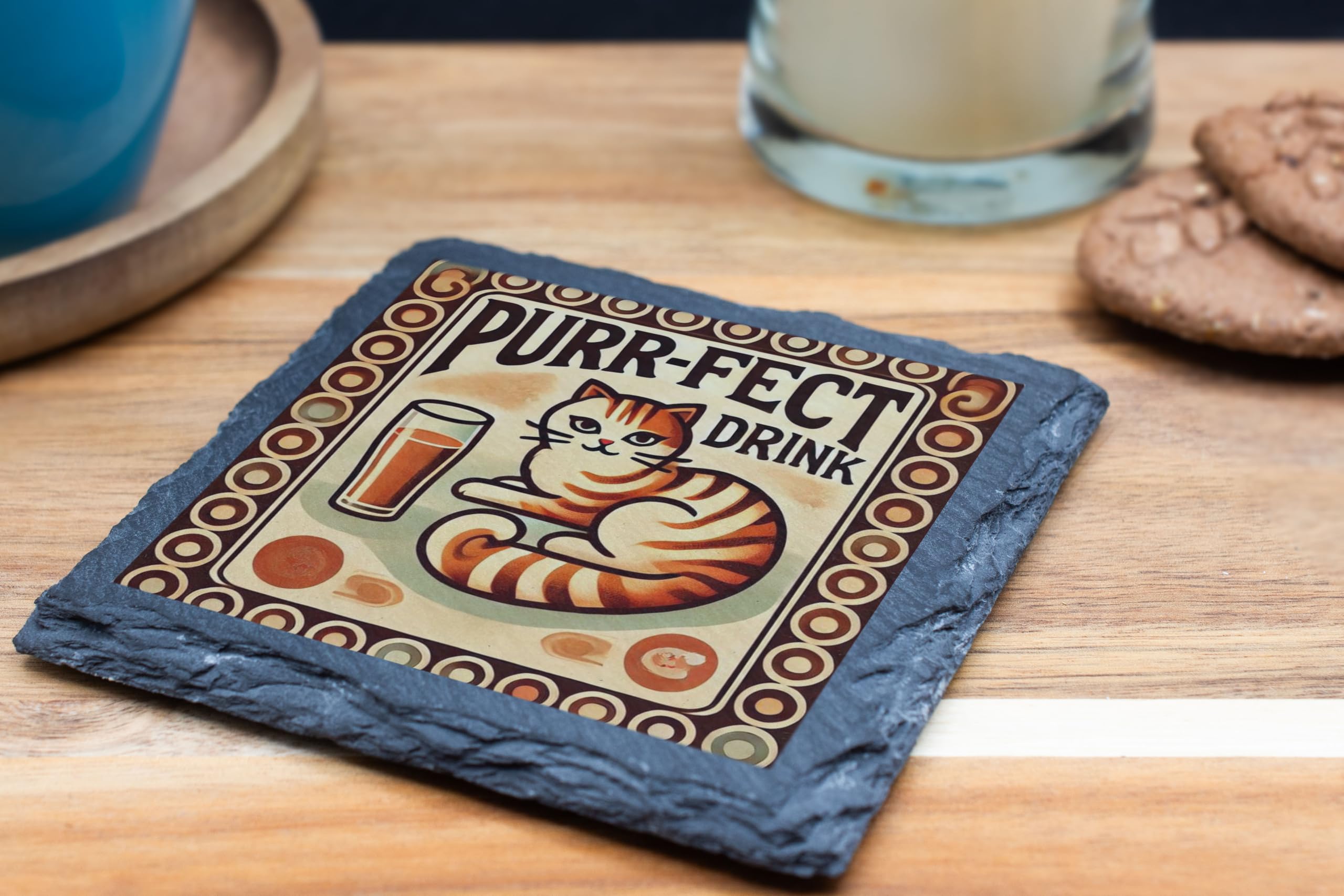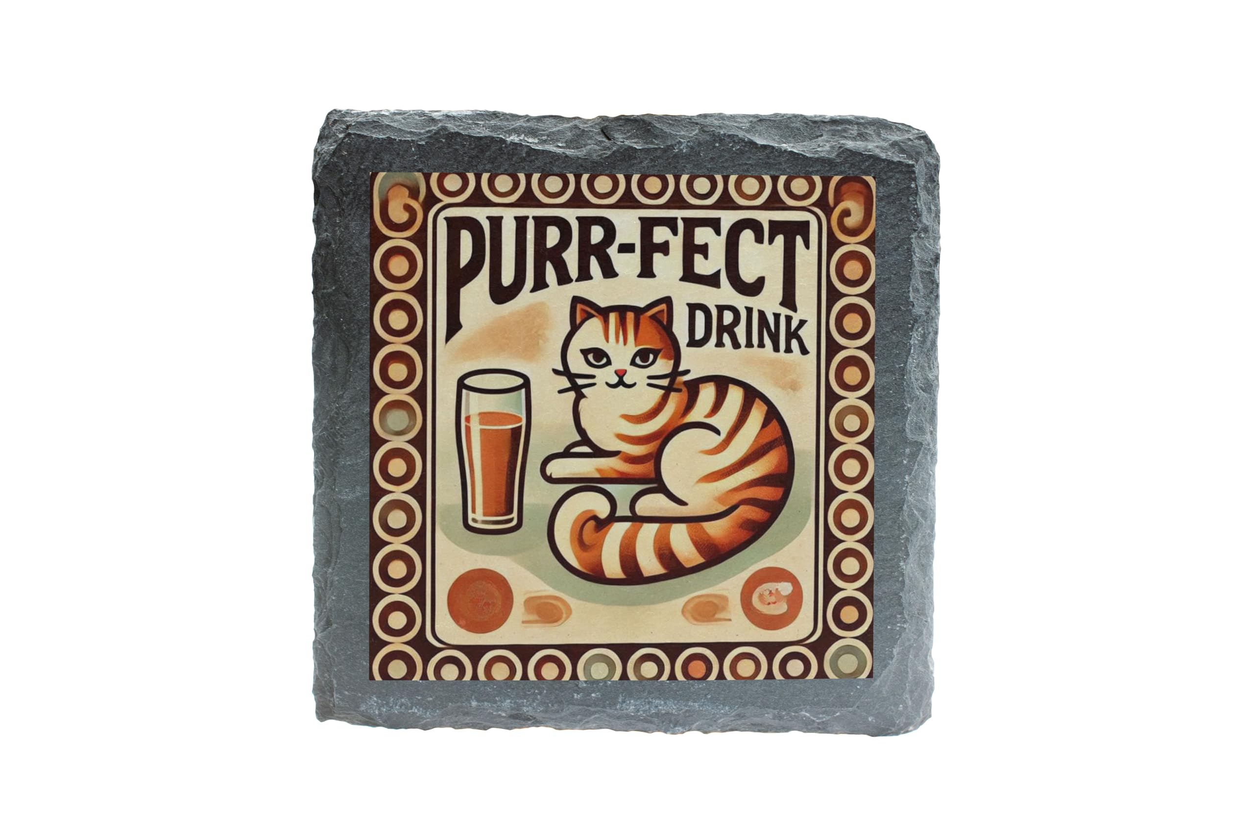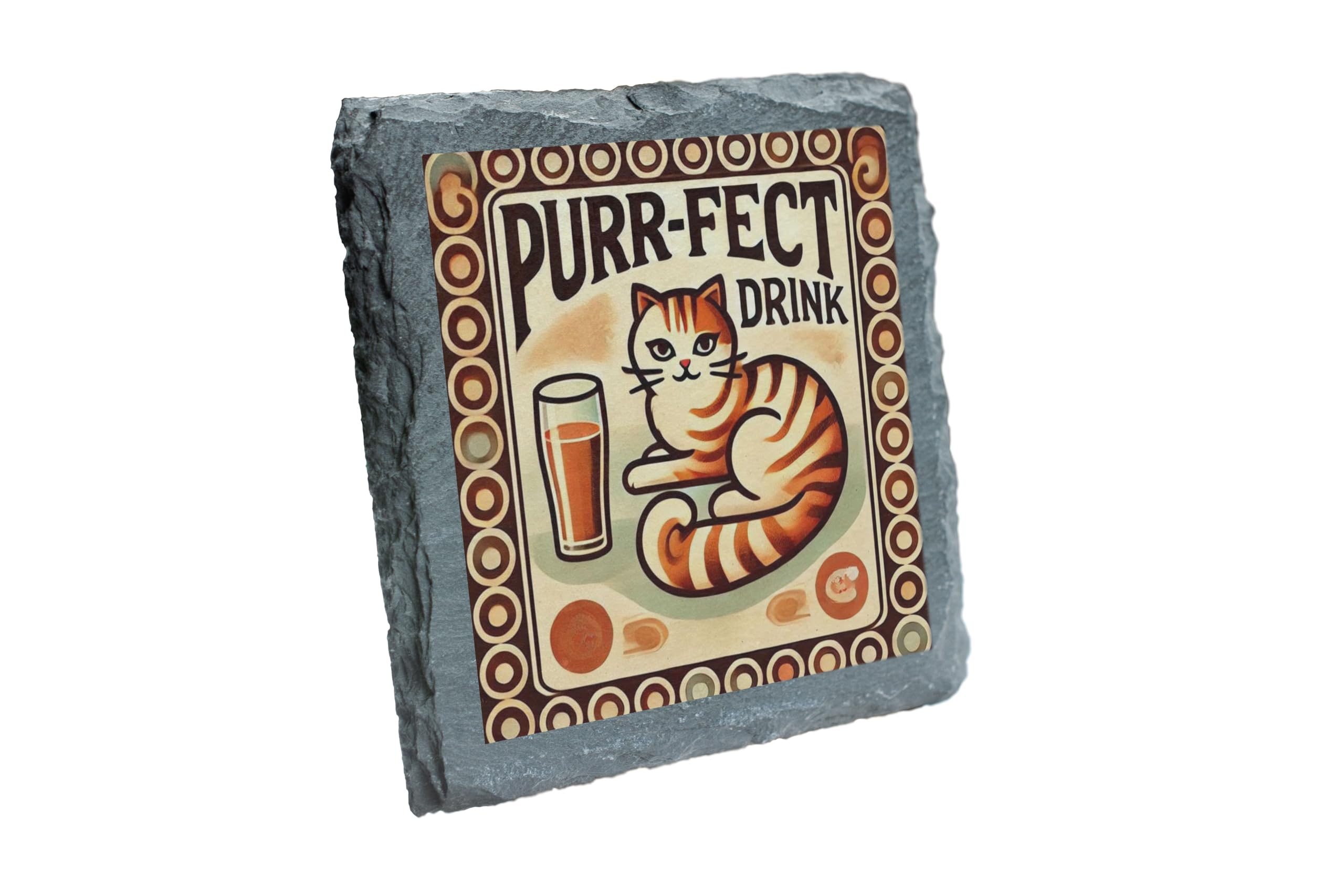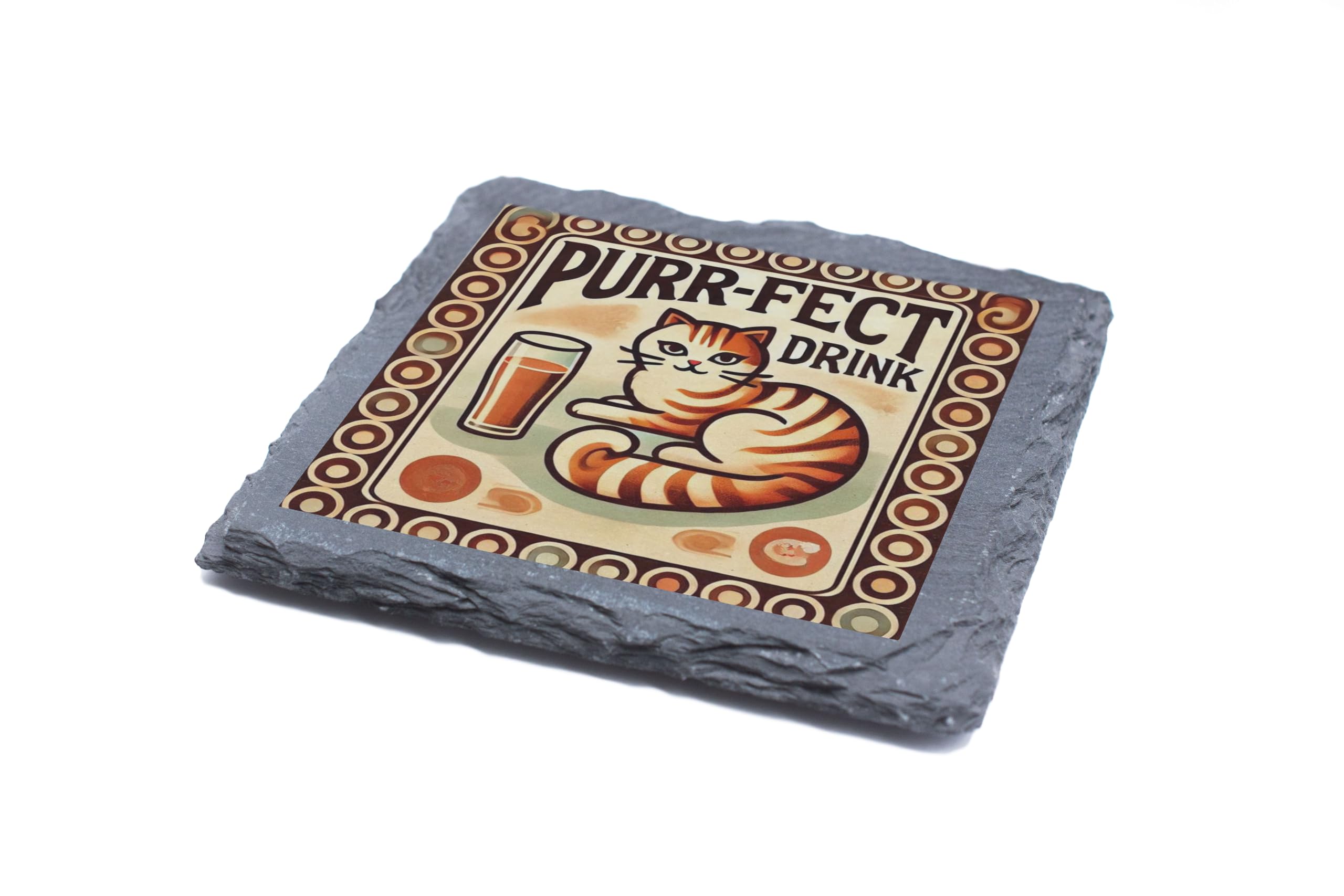 Bring a touch of vintage charm to your home with the "Purr-fect Drink" Slate Coaster. This beautifully crafted coaster features an adorable orange tabby cat lounging beside a drink, surrounded by retro-inspired patterns. Its high-quality slate construction not only makes it a durable choice but also ensures a sophisticated look. Whether you?re treating yourself or gifting a friend who loves cats and cozy beverages, this coaster is a delightful and functional addition to any space. Protect your surfaces in style while enjoying the ?purr-fect? blend of practicality and charm!
